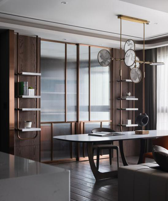 移步餐区,以古铜镀钛为主的色彩主题浮现眼帘,机能与美感兼备的书房滑门,与两侧红棕立面自然地形成连续块面,门片、镂空挂架及至墙体边饰由镀钛构件,传达出轻巧且带有时光印记的联想。另外圆弧语汇在此更是一绝,艺术灯饰以特殊的透光石材制成,拟态团扇的圆片以铜金镶边,含藏着水墨画般的天然纹理,使观者翫赏之际迎来扑拍满面的清逸闲情。相较下,圆润的白石餐桌则显得简约不羁,着重容纳众多成员及摆放佳肴的机能,将场域最重要的目的——「一家团圆」展露无遗。