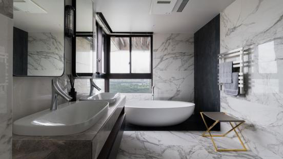 (图)对于绝对私人的洗浴空间,设计师选择大力铺张白净面材,仅露出清浅云纹,构成既无喧嚣亦无尘的清净之地。