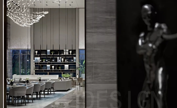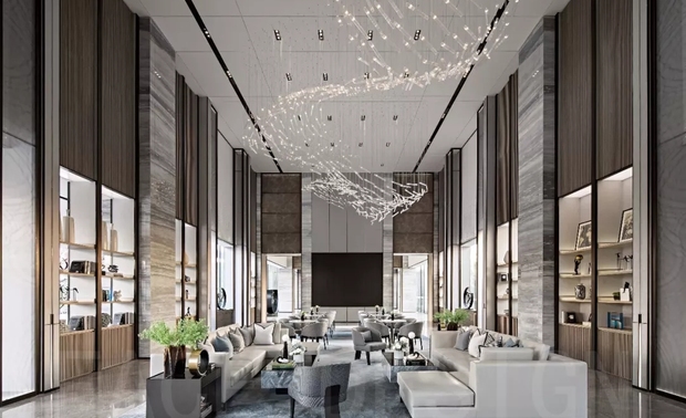 主要材料:拿铁灰大理石、蓝金沙素板大理石、英格兰灰大理石、秋香木木饰面、艺术透光纱、黑钛拉丝不锈钢
