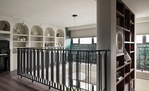 低调深邃的水泥纹路于柜面漫展,所到之处驻留光影与时间,让人途经此处时不自觉放慢步伐,沉淀一切思绪。穿过客厅、拾阶而上,阳光在眼前恣意流洩,穿梭于活泼的壁纸花色与细腻栏杆造型间,勾勒一幅异于一楼调性的明媚欧风画卷,令身心顿时豁然开朗,尽情体验彻底放鬆的自在舒心。
