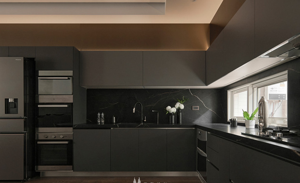 当线条褪去繁复,材质回归本真,空间便显得纯粹。灰阶如晨雾轻笼,原木似暖阳轻抚,光影于通透格局中自在游走,视线不受阻隔,而是被温柔地引领——从此处漫步至彼方,每个转身都是风景。开放式厨房以简练手法勾勒,延伸至一旁的餐桌区域,黑色桌脚配衬温润木质桌面,刚与柔在此相遇、和解,谱写只属于这个家的独特个性。