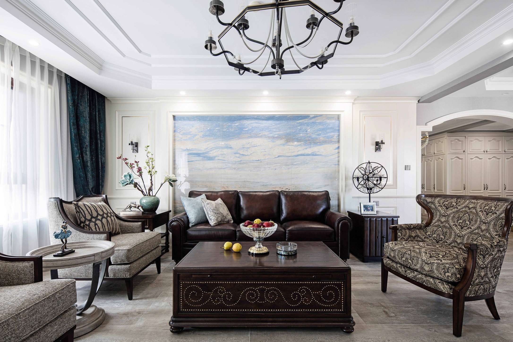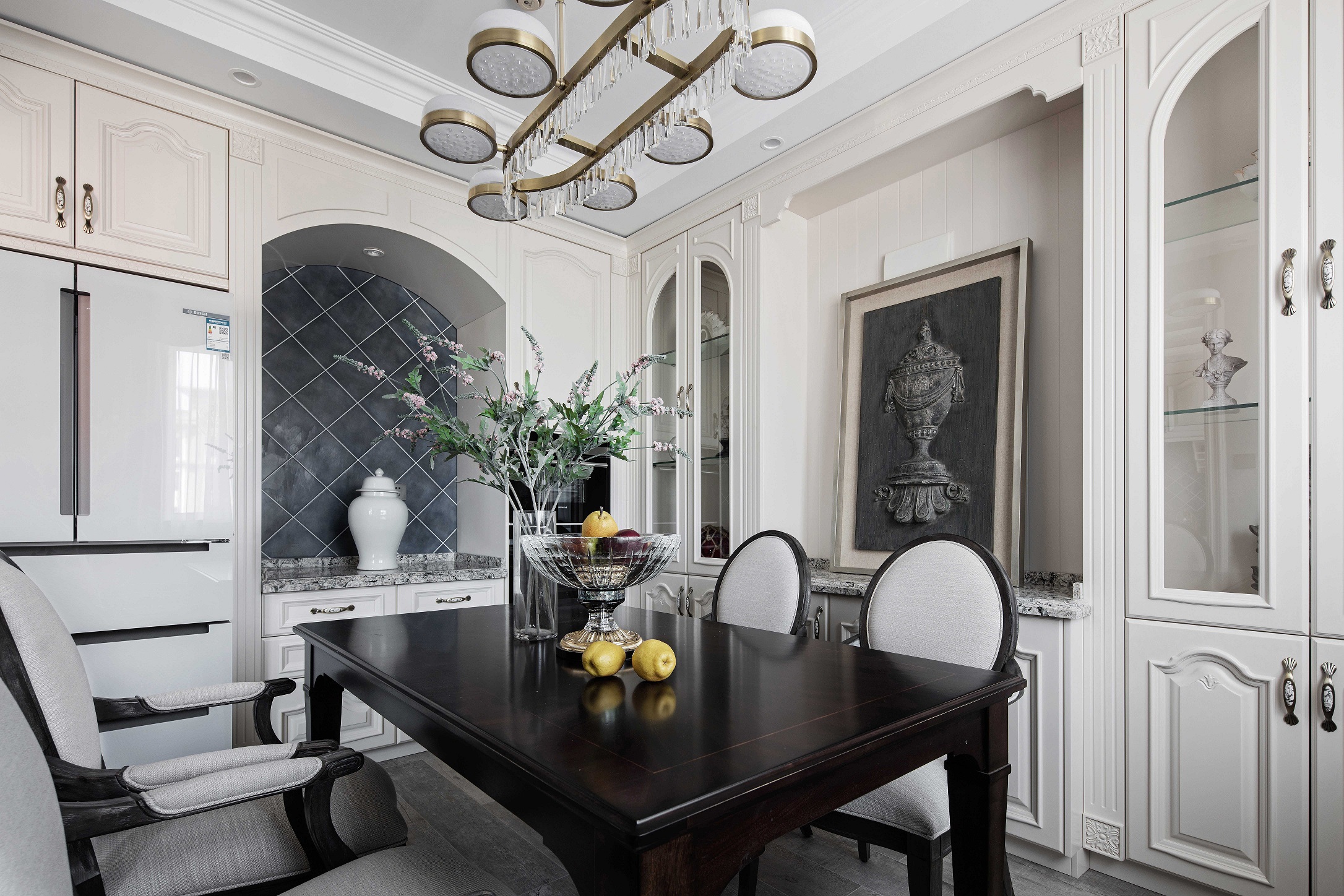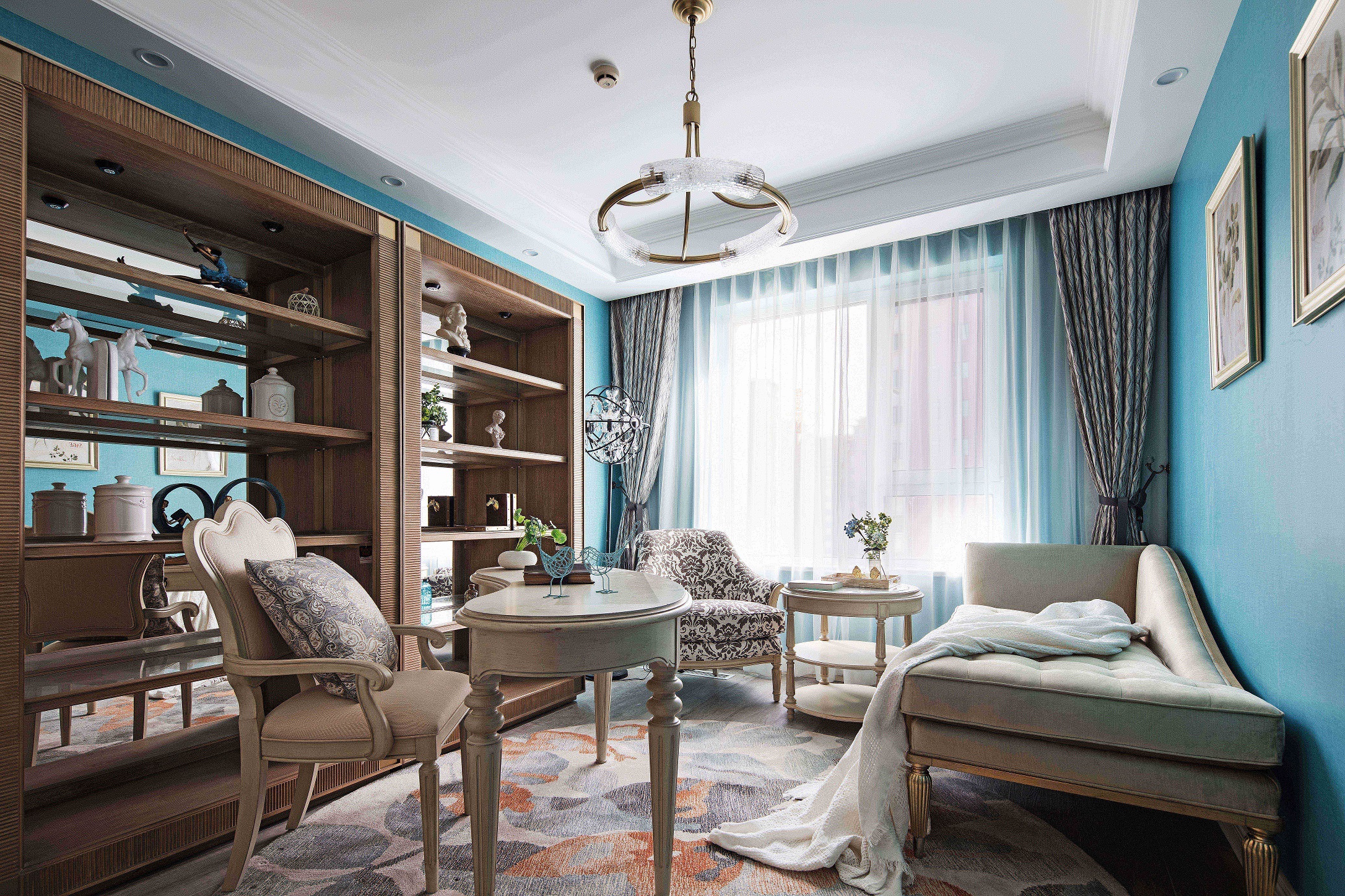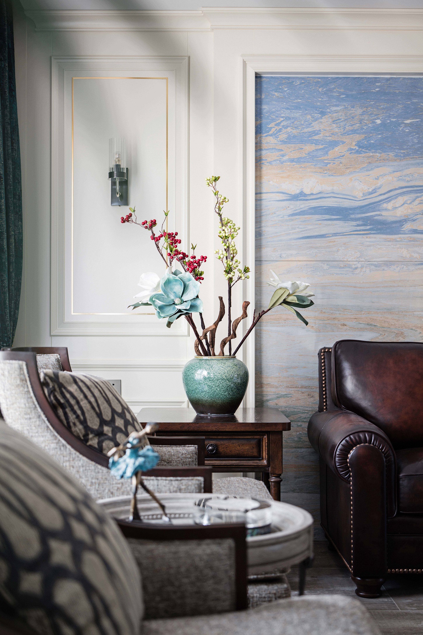 全屋采用乳胶漆材质,局部点缀壁纸,乳胶漆贴合美式设计风格带来自然的质感。墙面尽量通过颜色变化和软装来体现风格 ,摒弃掉繁杂造型,在设计中不断倡导去风格化,因为作为私人住宅来讲,风格显得没那么重要,更重要的是满足家庭不同成员之间不同的风格喜好。同时给房子留有变化的可能和条件,我们在这套房子里基本采用了简洁的处理方法,同时也加入了美式的元素。每一个空间根据家具、软装的不同体现了不同的风格感受,既满足了不同空间、不同人的喜好,又给了10年以后、20年以后家具、软装的调整变化留有余地。