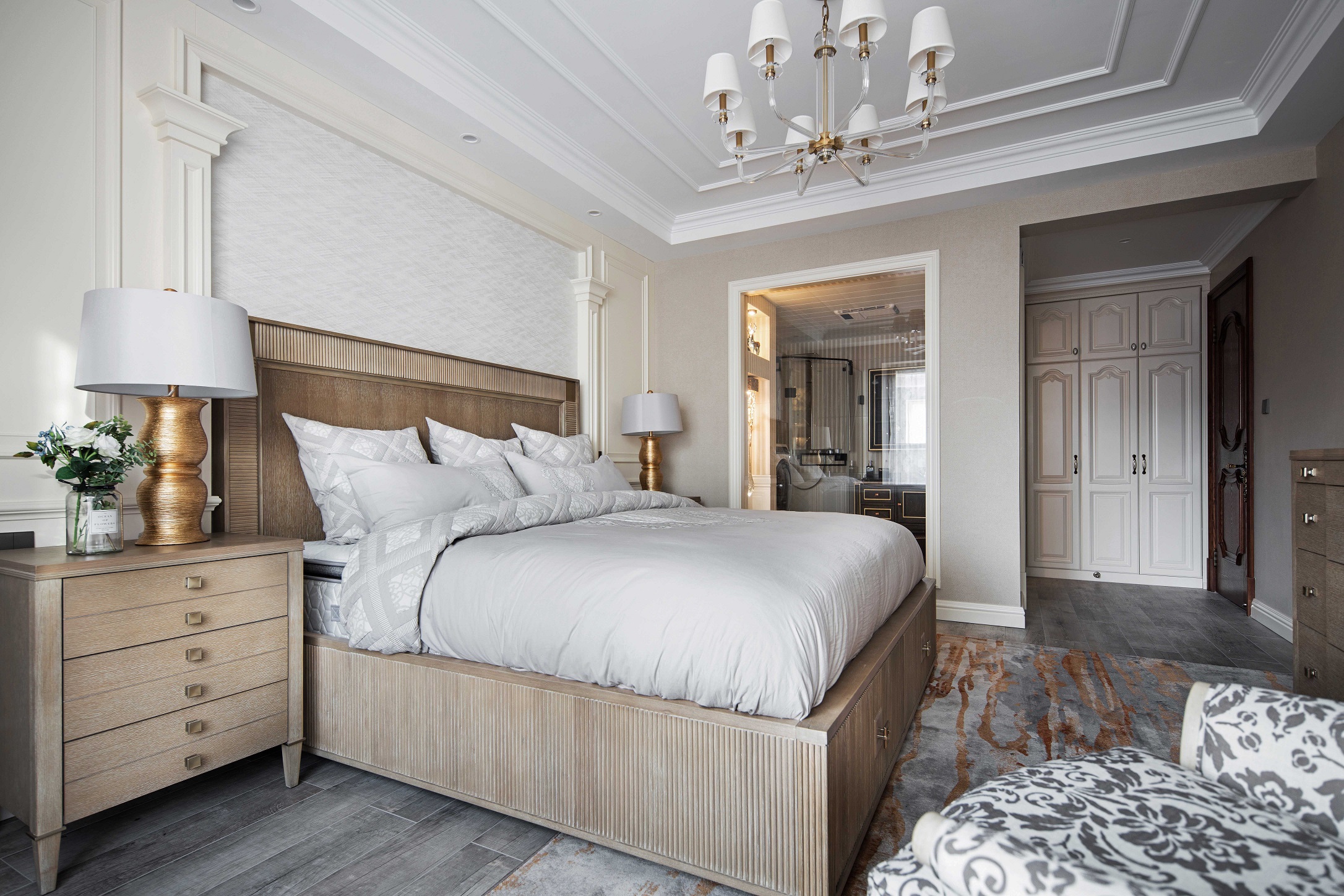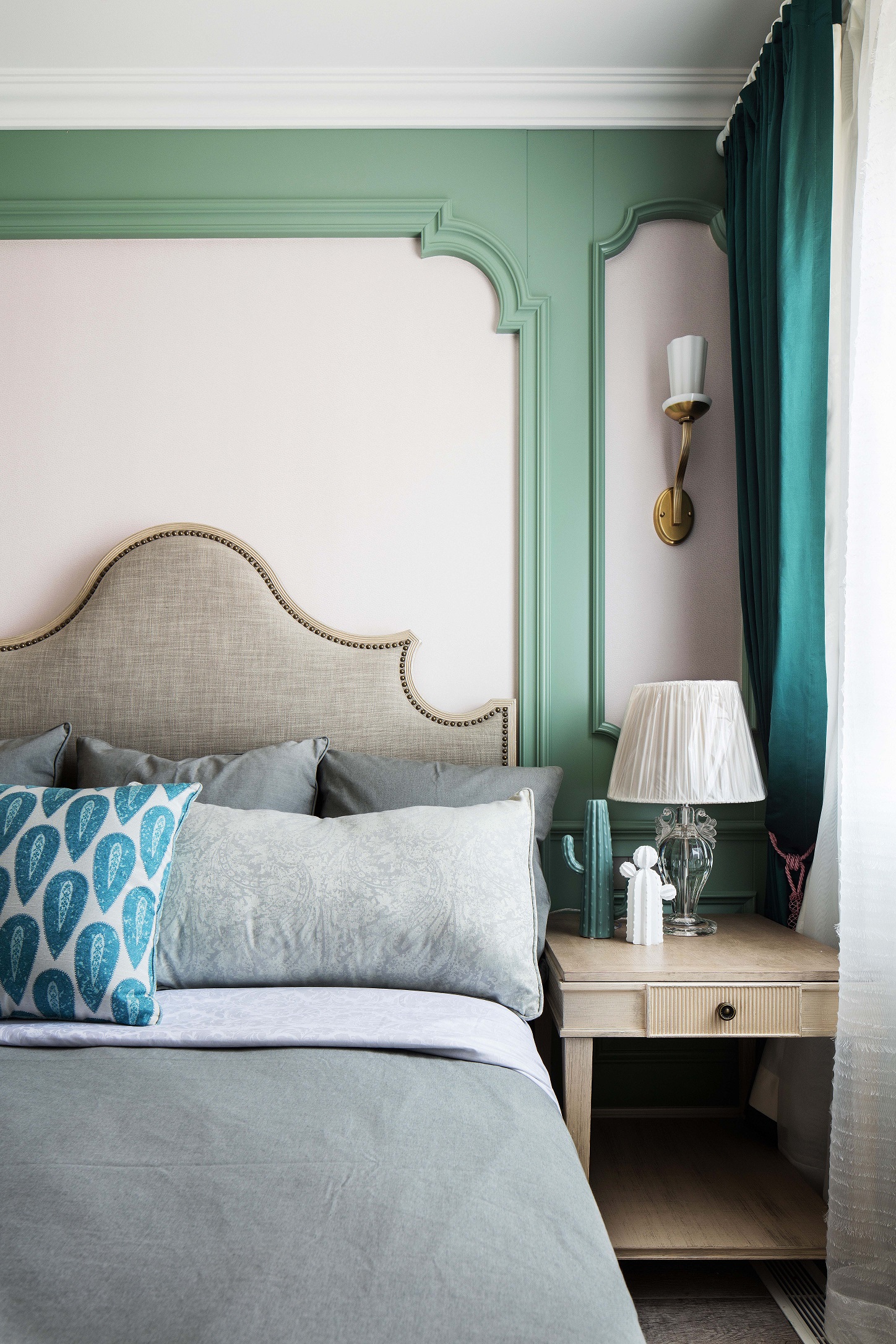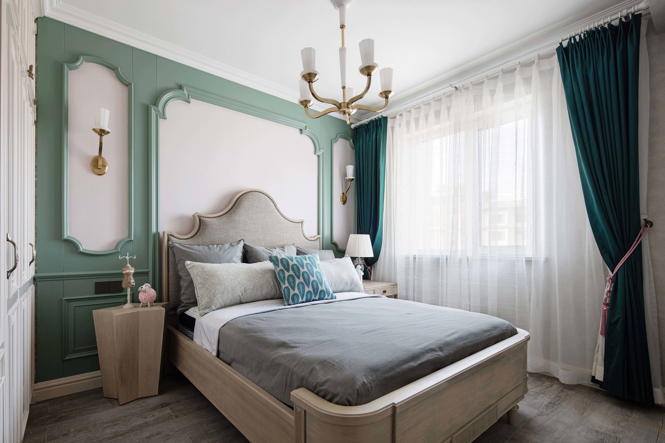全屋采用乳胶漆材质,局部点缀壁纸,乳胶漆贴合美式设计风格带来自然的质感。墙面尽量通过颜色变化和软装来体现风格 ,摒弃掉繁杂造型,在设计中不断倡导去风格化,因为作为私人住宅来讲,风格显得没那么重要,更重要的是满足家庭不同成员之间不同的风格喜好。同时给房子留有变化的可能和条件,我们在这套房子里基本采用了简洁的处理方法,同时也加入了美式的元素。每一个空间根据家具、软装的不同体现了不同的风格感受,既满足了不同空间、不同人的喜好,又给了10年以后、20年以后家具、软装的调整变化留有余地。
