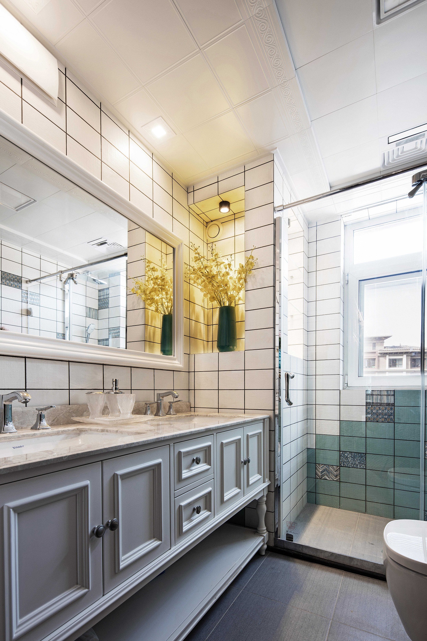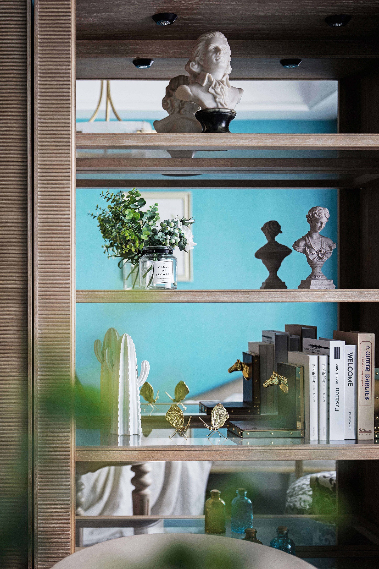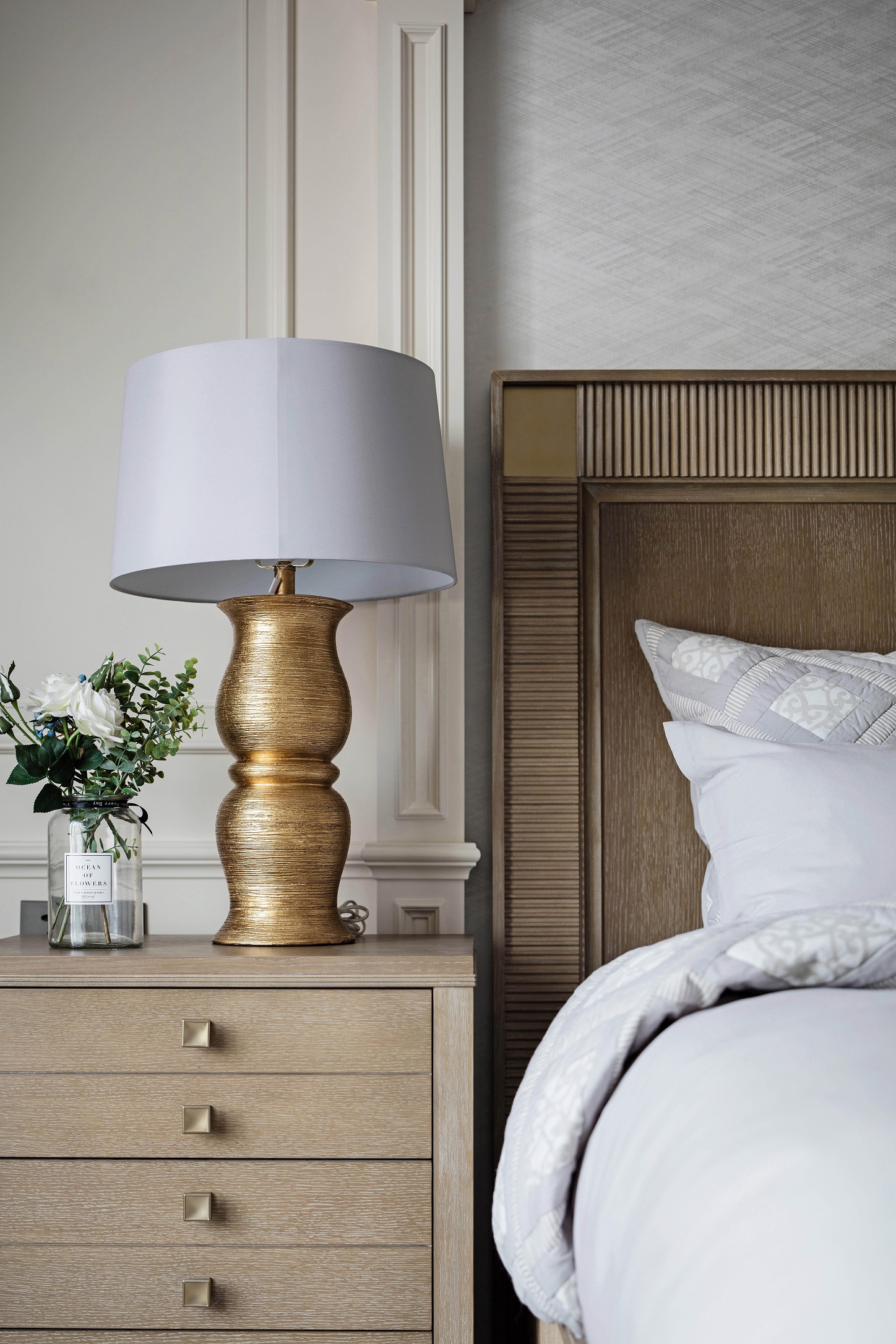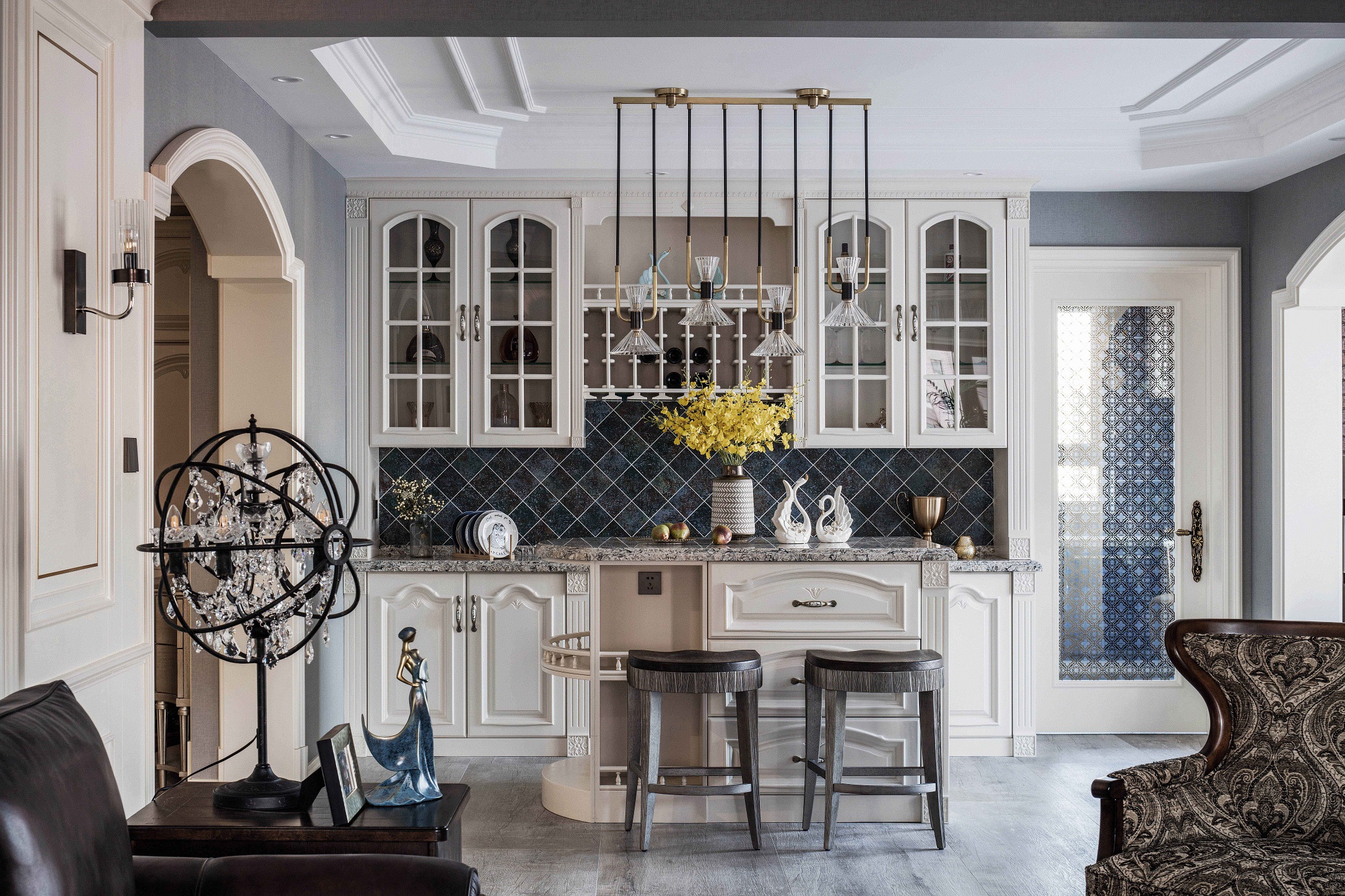 全屋采用乳胶漆材质,局部点缀壁纸,乳胶漆贴合美式设计风格带来自然的质感。墙面尽量通过颜色变化和软装来体现风格 ,摒弃掉繁杂造型,在设计中不断倡导去风格化,因为作为私人住宅来讲,风格显得没那么重要,更重要的是满足家庭不同成员之间不同的风格喜好。同时给房子留有变化的可能和条件,我们在这套房子里基本采用了简洁的处理方法,同时也加入了美式的元素。每一个空间根据家具、软装的不同体现了不同的风格感受,既满足了不同空间、不同人的喜好,又给了10年以后、20年以后家具、软装的调整变化留有余地。