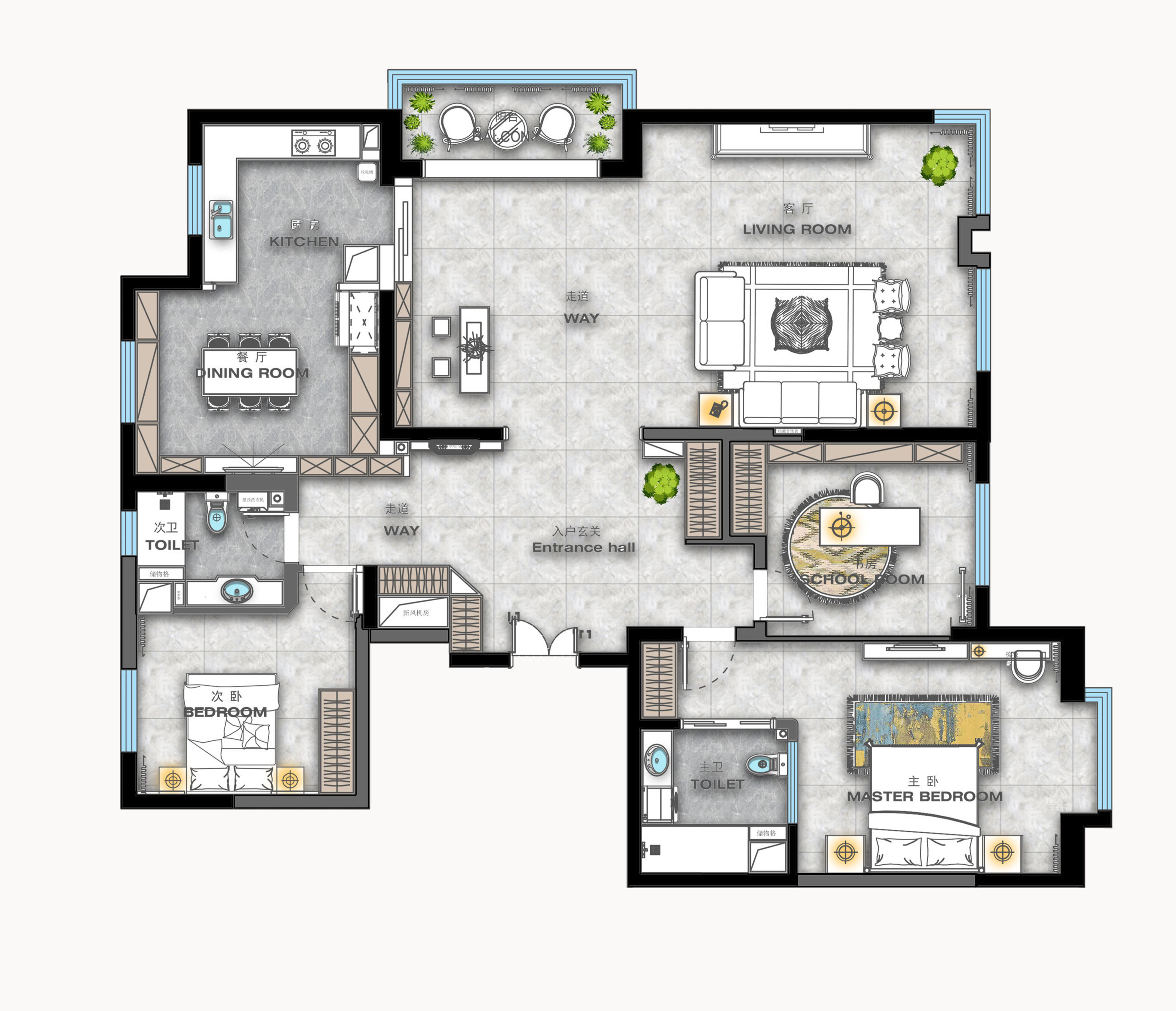 业主为40多岁夫妻俩,和女儿一同居住。女业主狂野个性,喜欢原始自然的居住环境,希望回到家可以放松下来。男业主细腻沉稳,喜欢大地色系,希望在起居空间和家人有更多互动。女儿个性张扬又可爱,希望自己的空间相对独立。夫妻俩希望把自己认为最好的,最时尚的,最新颖的,自己没有尝试过的统统都搬进自己的新家。遇到这样的客户我第一步做的就是分析屋主现在的生活场景,解码他们真正的需求,而后和屋主一起做加减法,把真正的需求留下,把钱砸在关键点上,从而优化屋主的生活状态。