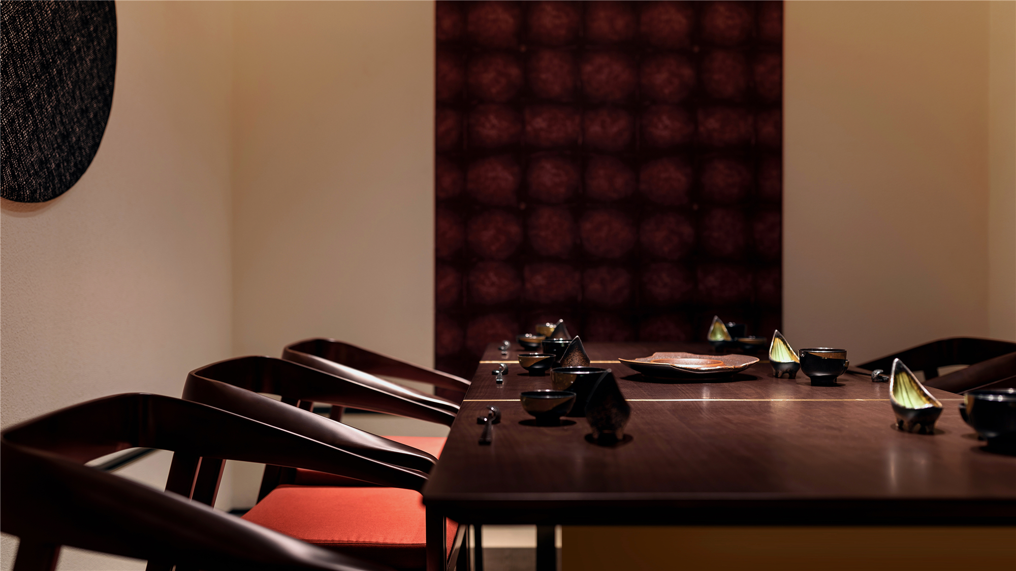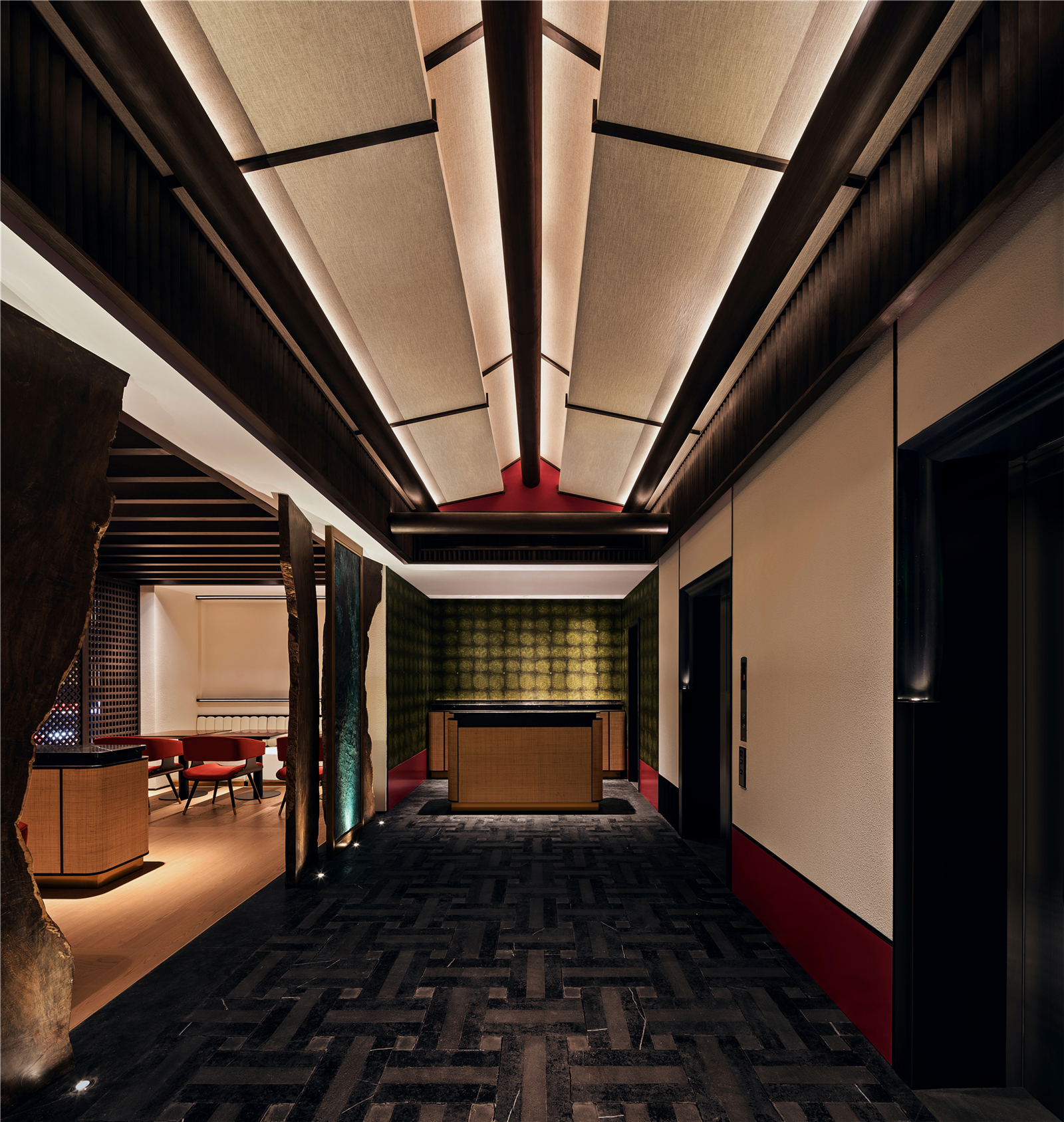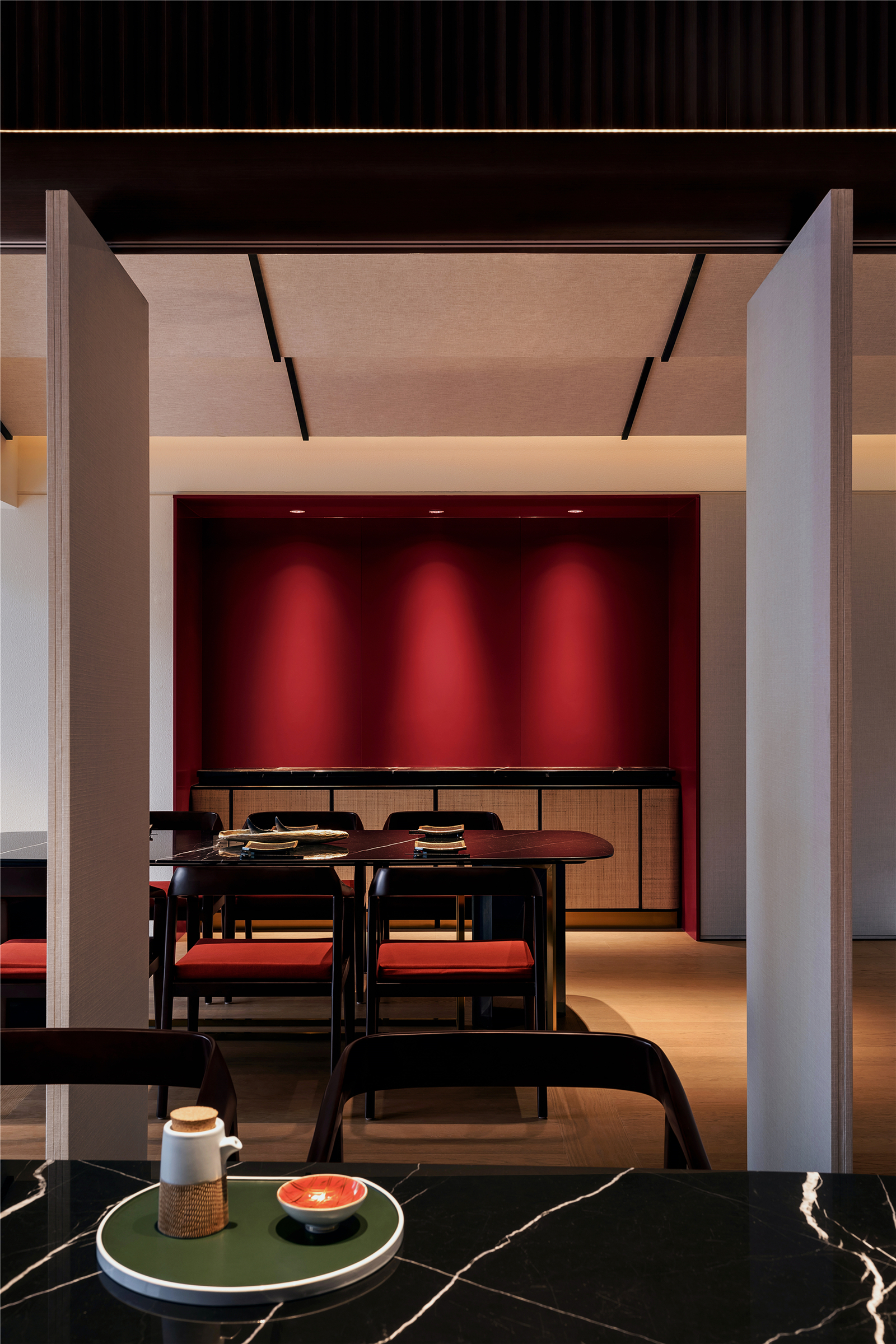 项目定位:与中国建筑的宏大壮美相比,日本建筑以洗练、素洁见长,更关注建筑的结构构造、材料质感及色泽明度,擅于以小见大,细微处见真知。本案为一家高端日式料理店,得德设计担纲室内设计,紧扣日本建筑的简素内核,大胆写意,细腻描摹,将日本传统文化意象演绎得精细、独到,“接手本案时,无论是元素提炼、技法表达还是空间布局,我们都希望通过意象的解构、重组,创造出全新的日式用餐体验。”