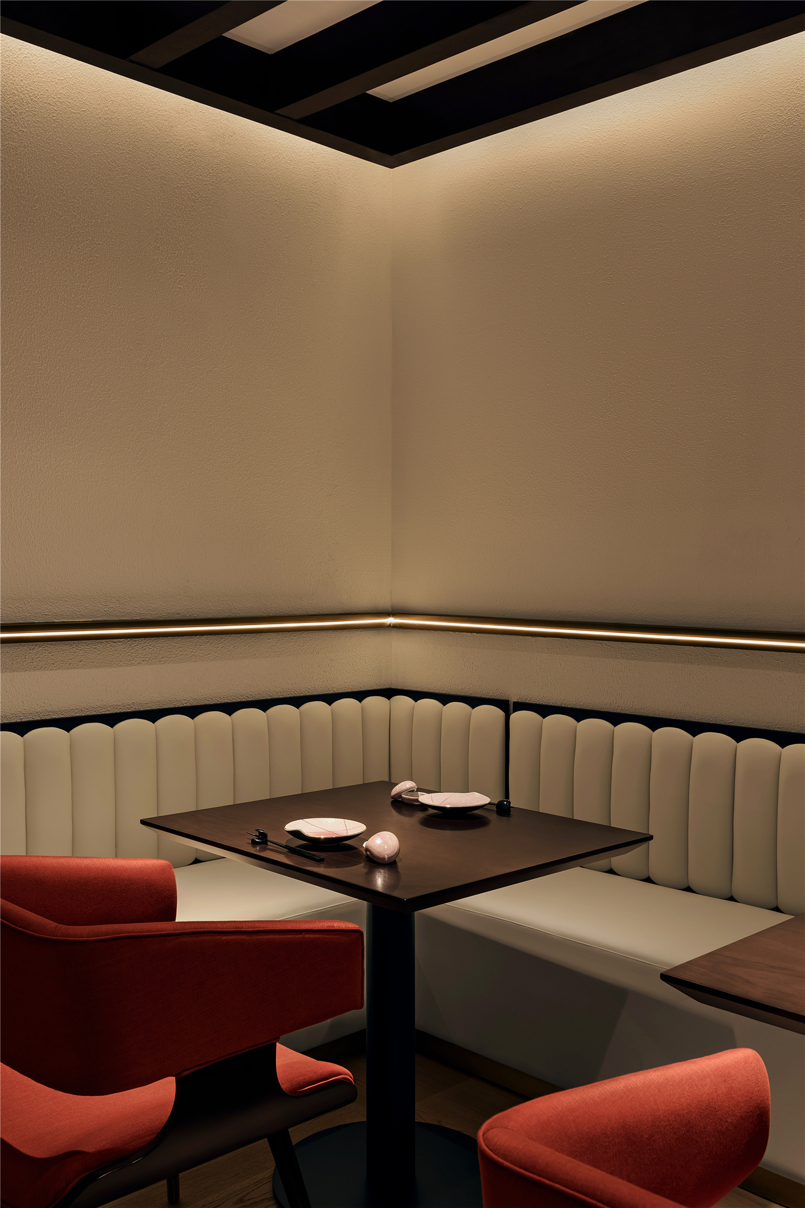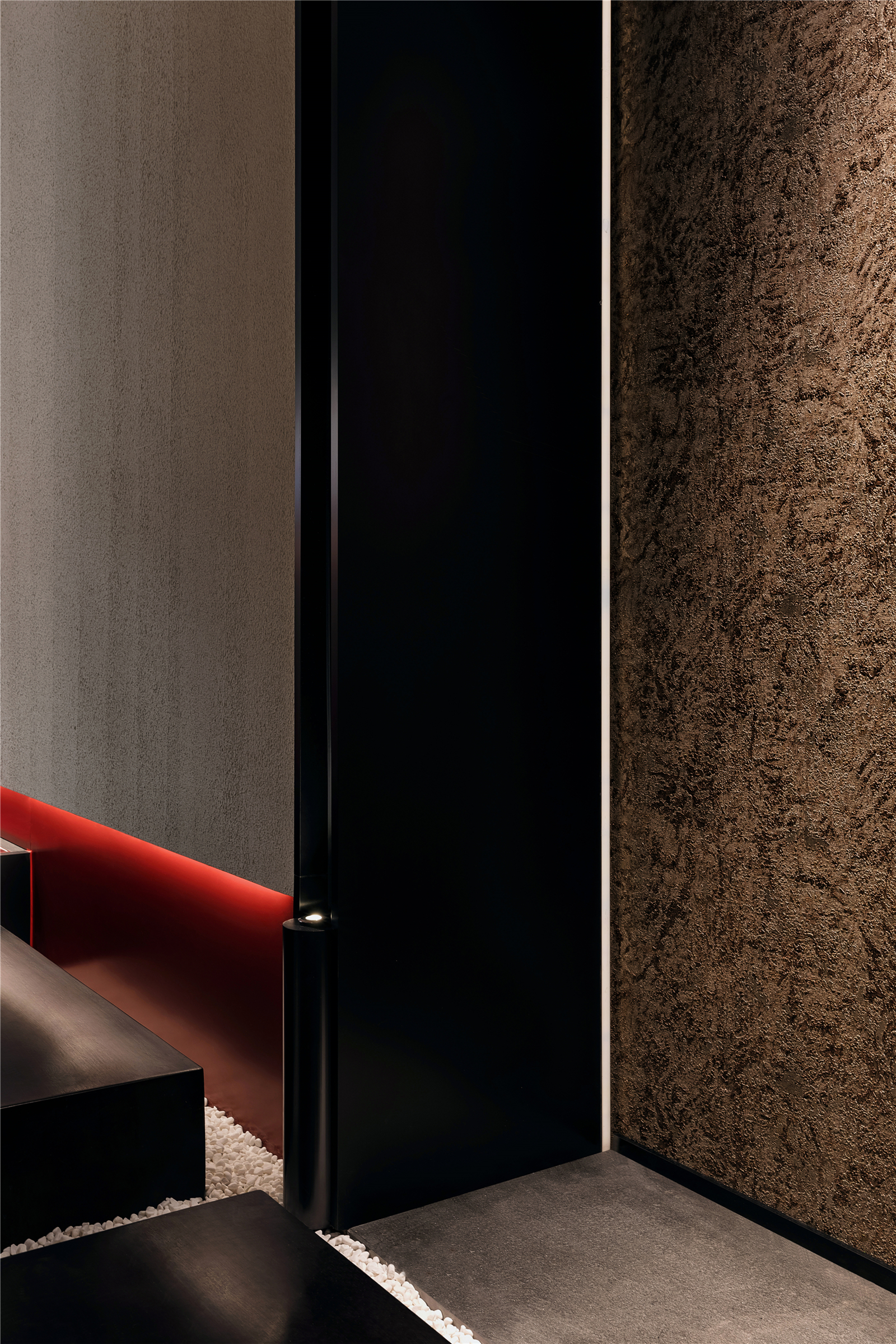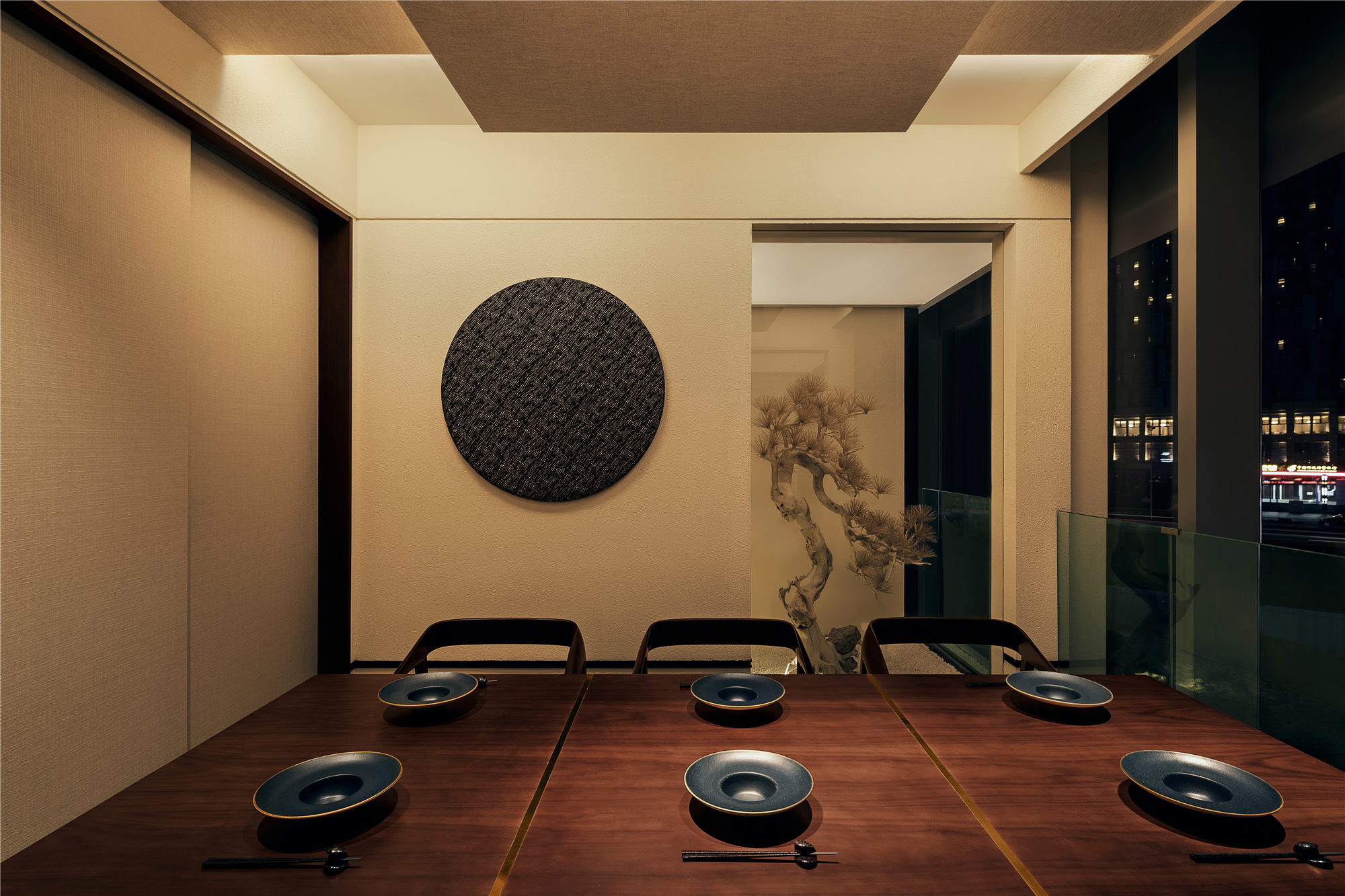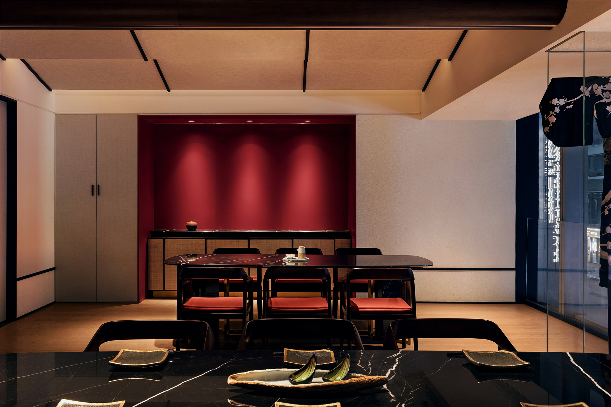 日式传统精粹融合现代设计精神,守拙出新,方能缔造出独特的体验感。日式榻榻米坐席营造的是朴拙的东方调性,而长桌型态则是呼应现代的自由精神,二者在本案中圆融互通。精致细腻的墙纸质感,对应的是墙面肌理涂料粗犷而恣意的表达,材质肌理的对比与反差,纳入矛盾美学的思索,就犹如步入日式庭园赏枯山水,侘寂之美于此情此景中了然于心,蓦然顿悟了。