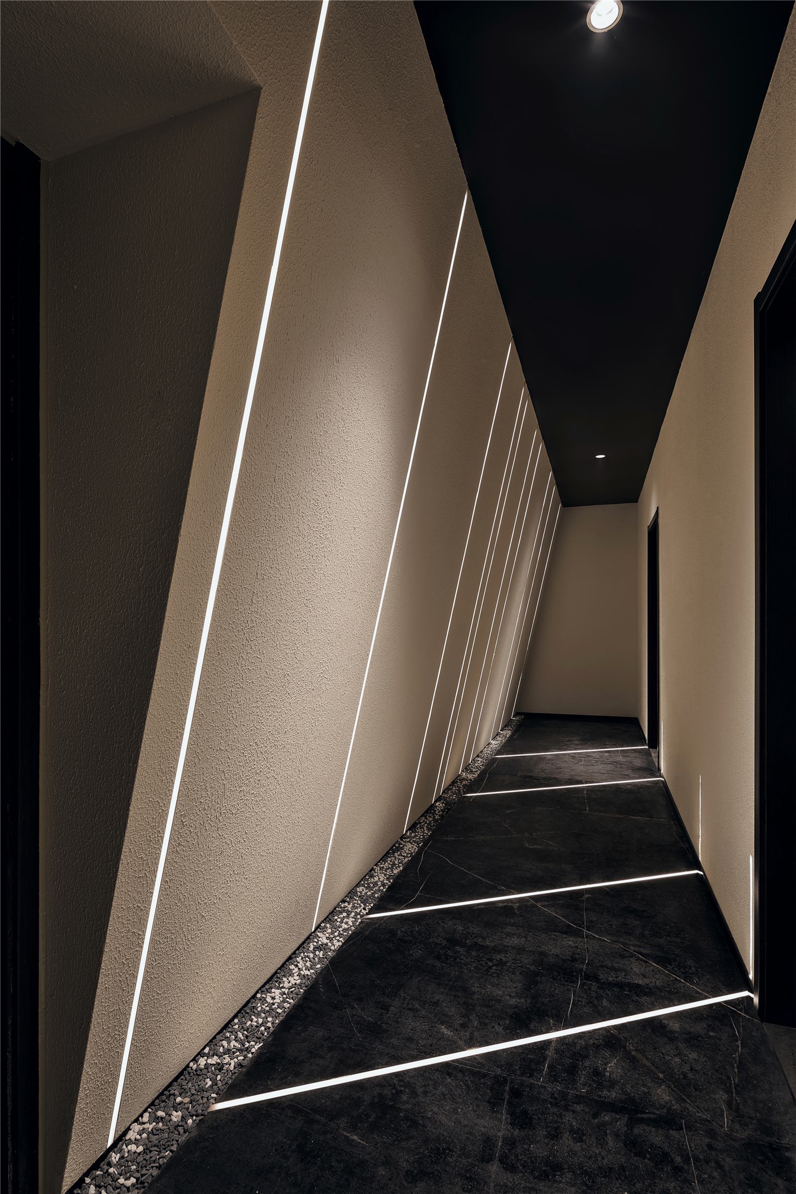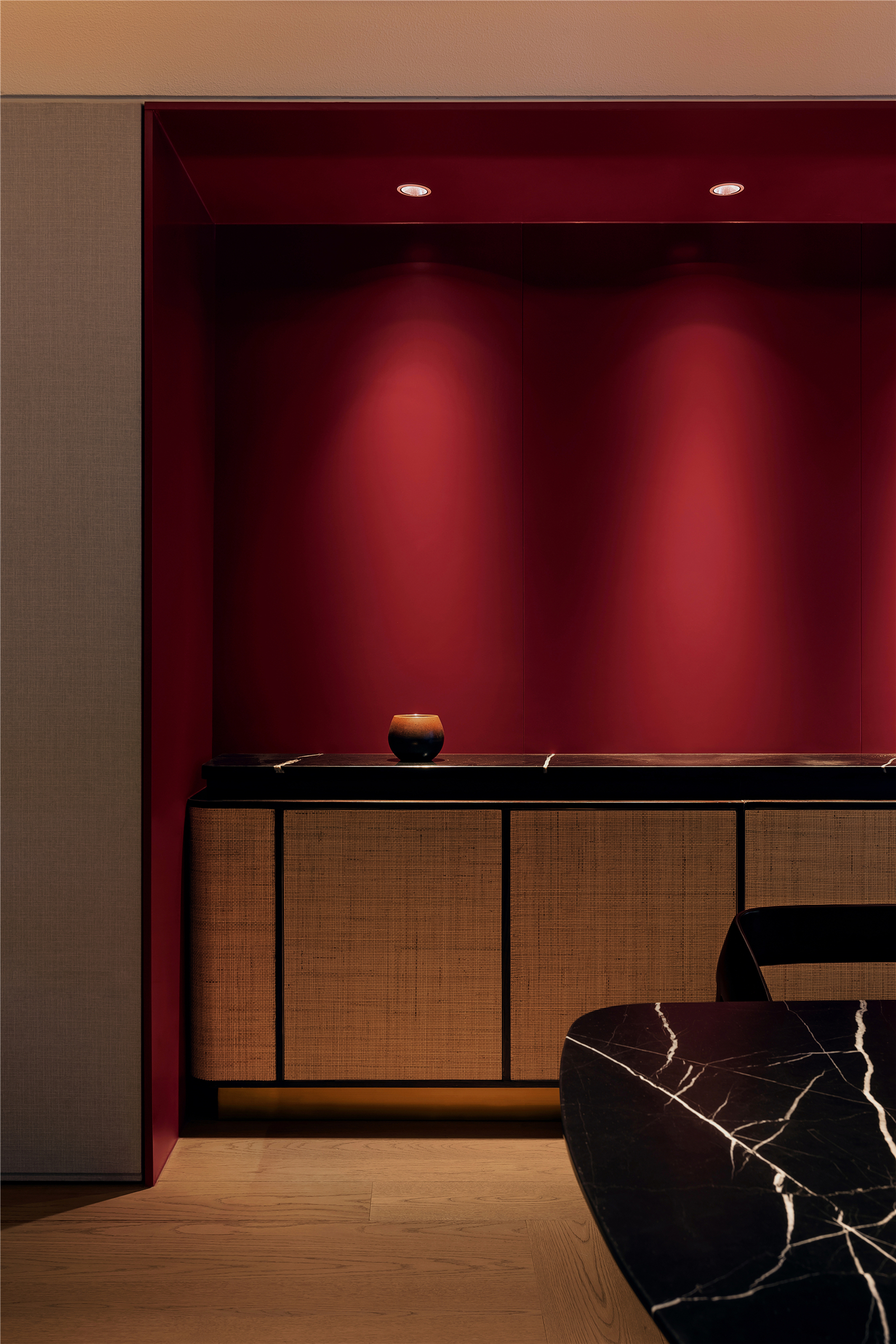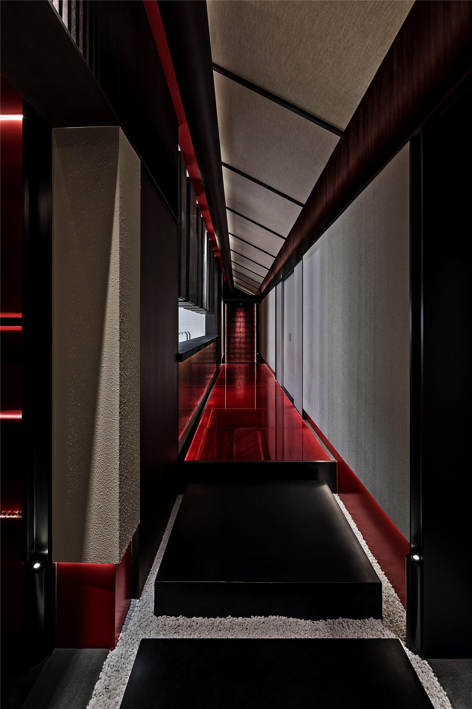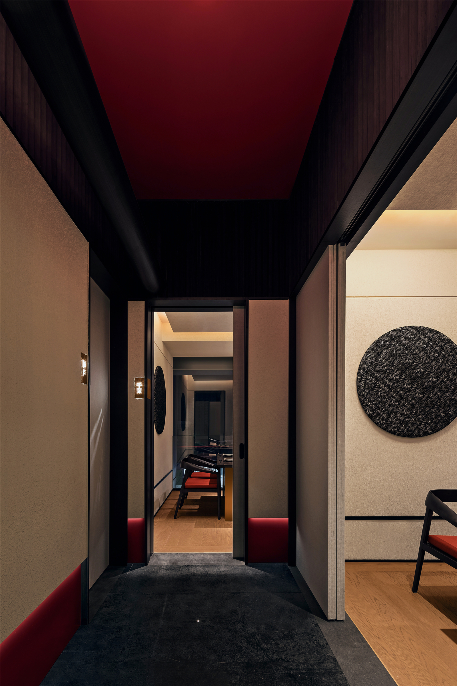 日式传统精粹融合现代设计精神,守拙出新,方能缔造出独特的体验感。日式榻榻米坐席营造的是朴拙的东方调性,而长桌型态则是呼应现代的自由精神,二者在本案中圆融互通。精致细腻的墙纸质感,对应的是墙面肌理涂料粗犷而恣意的表达,材质肌理的对比与反差,纳入矛盾美学的思索,就犹如步入日式庭园赏枯山水,侘寂之美于此情此景中了然于心,蓦然顿悟了。