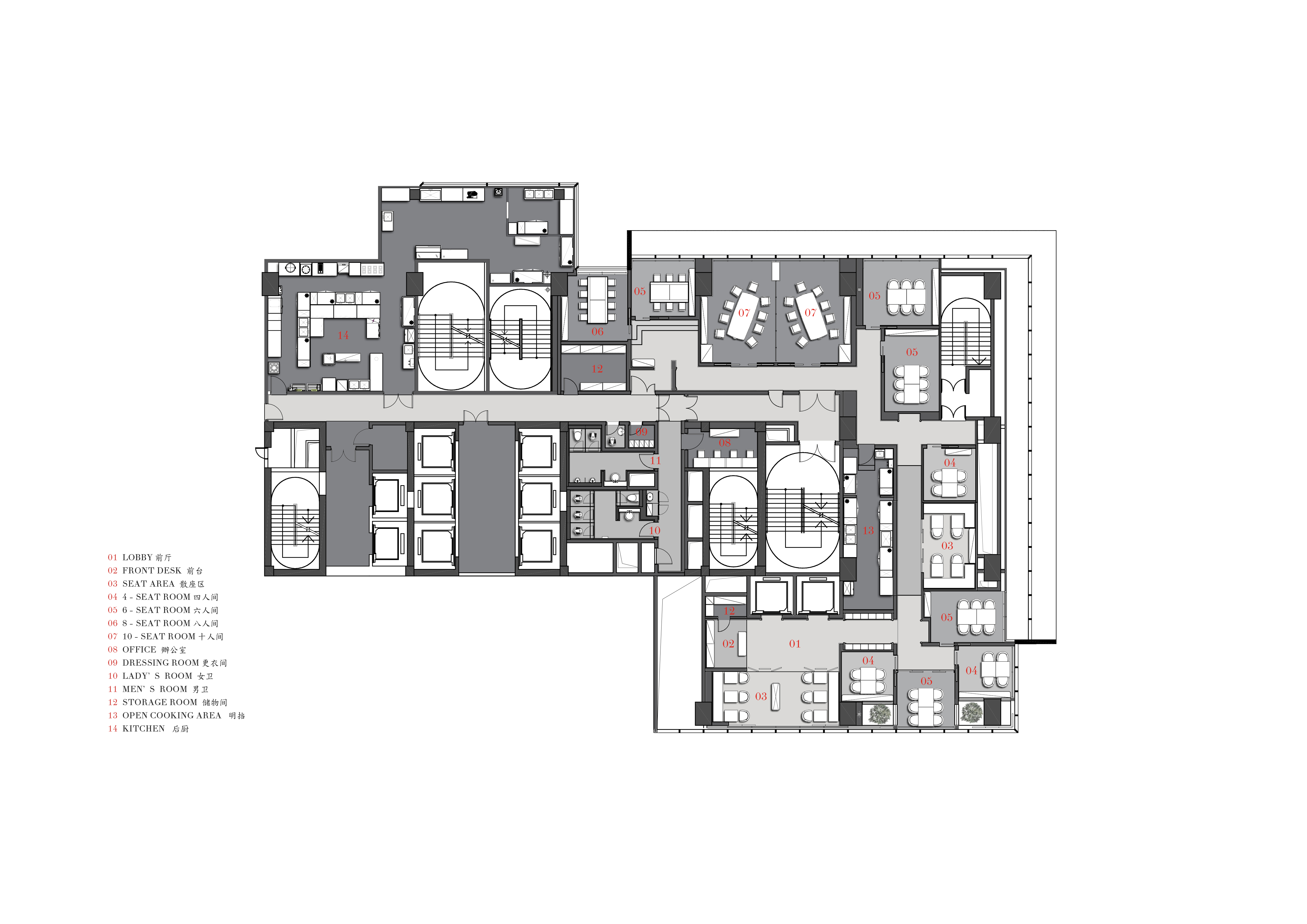 从接待台起,设计团队以“口”字型进行动线规划:散客区、六人、八人、十人包间依次铺排,将最美的风景让位给包间,引自然景观入室,以建筑技法描摹出写意庭院的用餐氛围;后厨、办公及洗手间等置于最末端。这一以直线布排优化出最短距离的设计思路,有效解决了日式料理店送餐动线长的难点,也充分考量了商业转化率及利用率。而房与房之间借由日式折叠推拉门,让主通道的门墙尽可能规整,追求极致的简素之美。 -