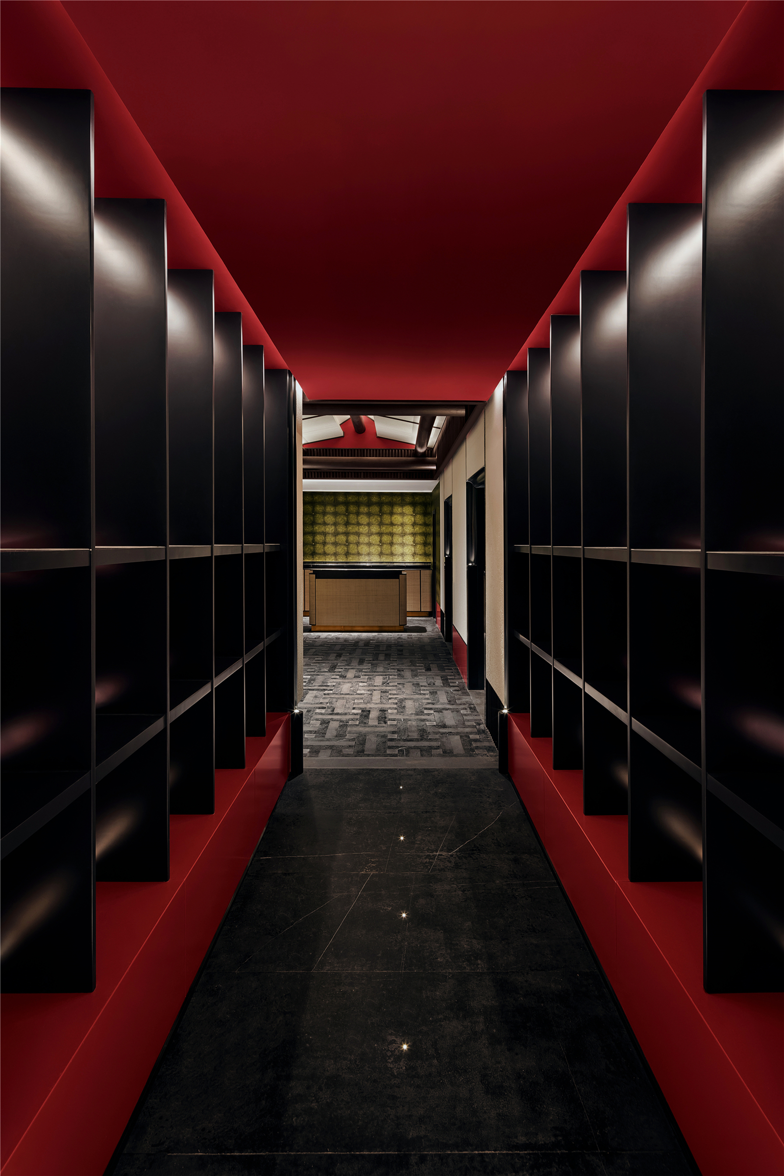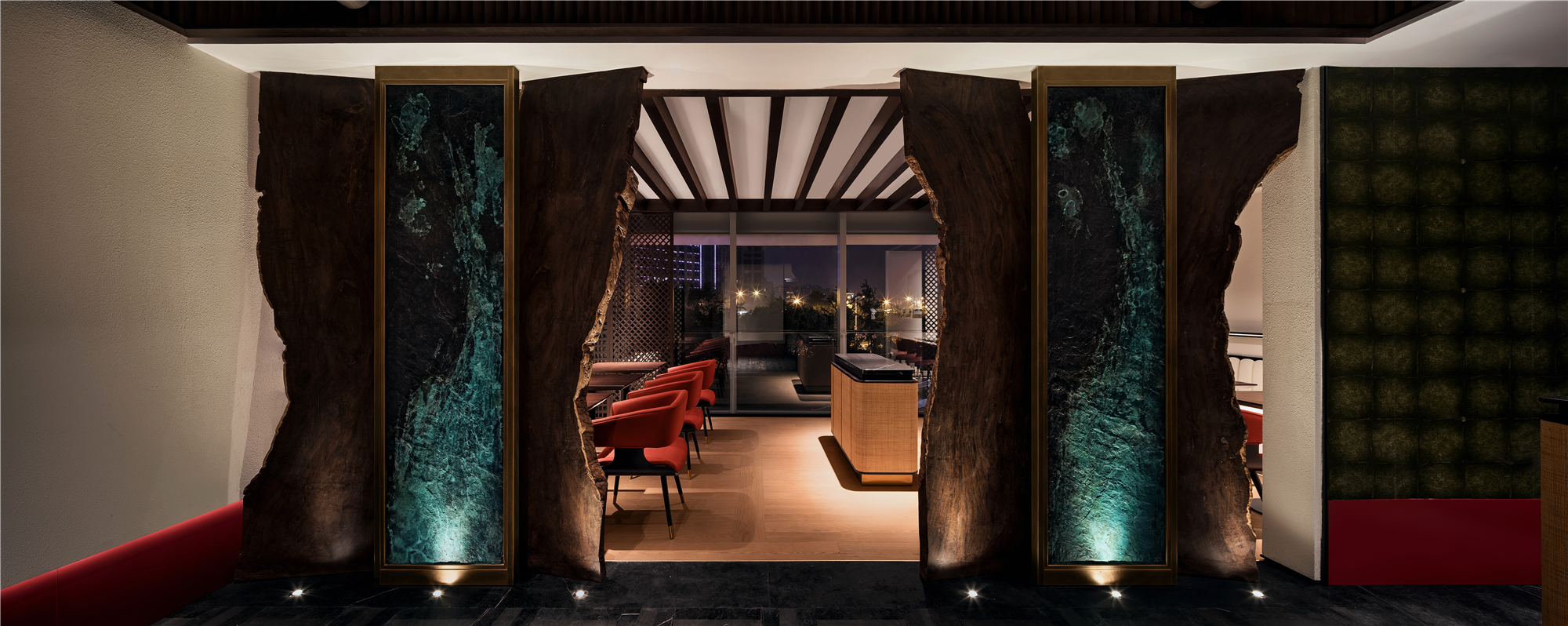 极具吸睛的“蝴蝶谷”屏风装置,是以蓝绿酸洗做旧处理的铜板造型,配搭上年代感的实木木板,形塑出展翅迎客的蝴蝶。斑驳的铜绿呼应了日本建筑铜构件常年曝露在湿润海洋性气候而形成的氧化效果,其内蕴的守静、致远,与日本审美观极为相契。 -