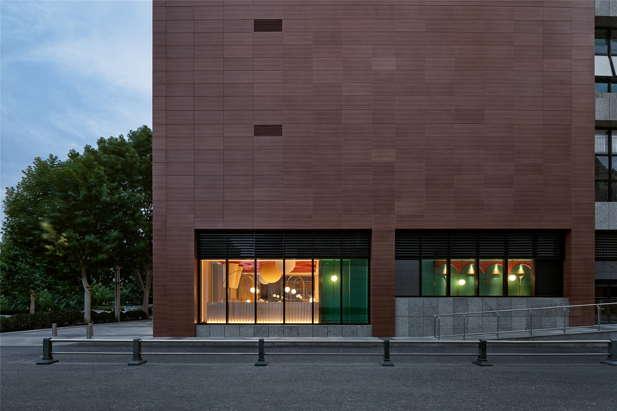 古代崇尚“天圆地方”的朴素哲学,圆代表了“无限”可能,这一设计语汇在甜品店中无处不在。入口颇具装饰意味,融“圆”于方正之中,既有尺度稍大的双环,也有单孔圆形开窗,连招牌也定制成椭圆形,比例上拿捏精到,造型上又富有变化。