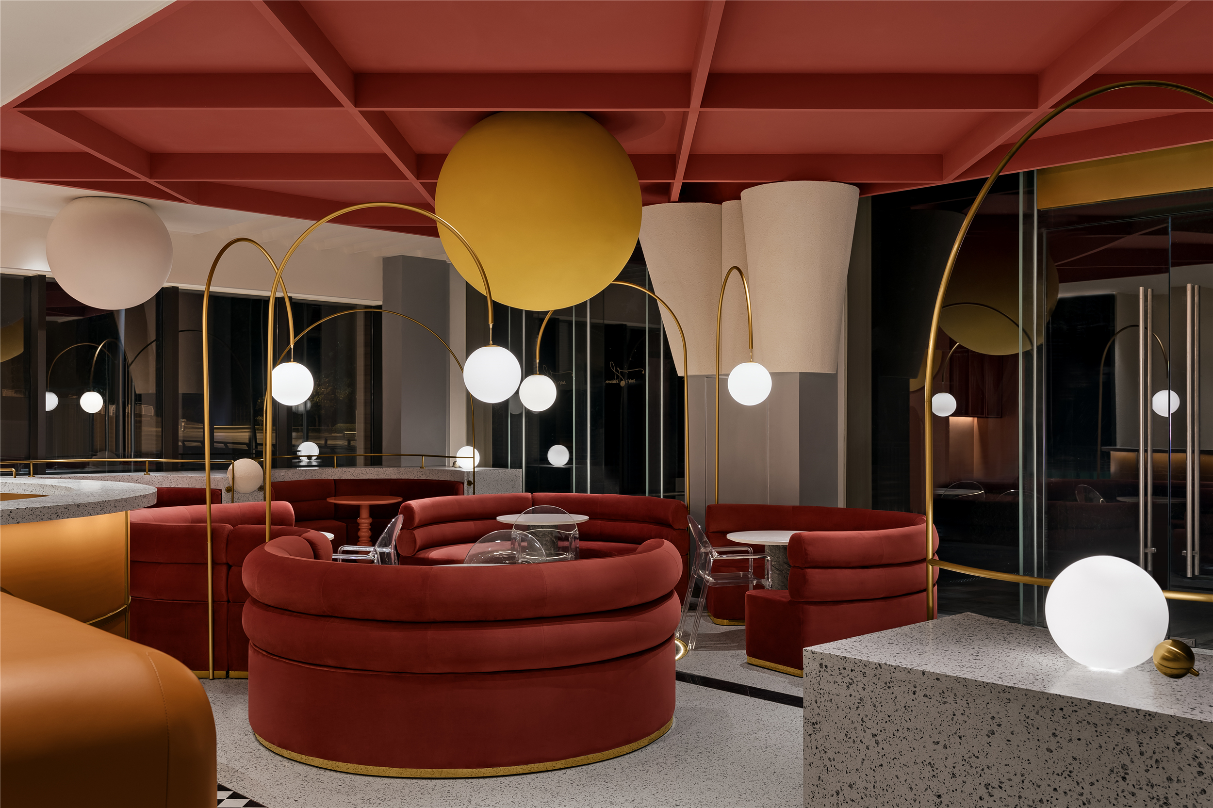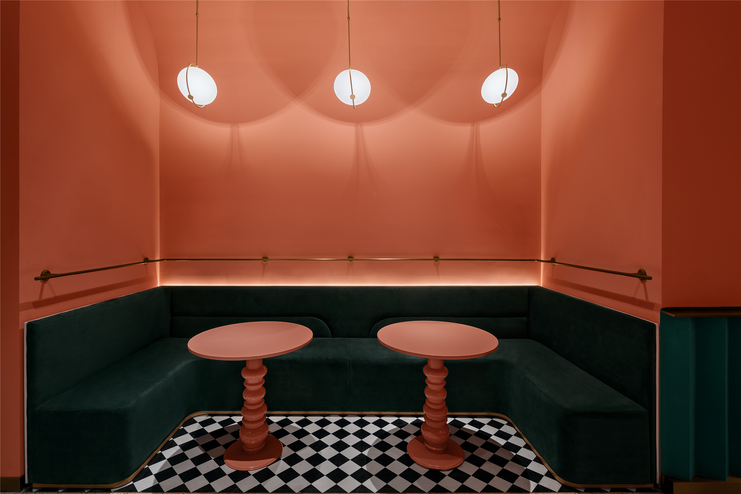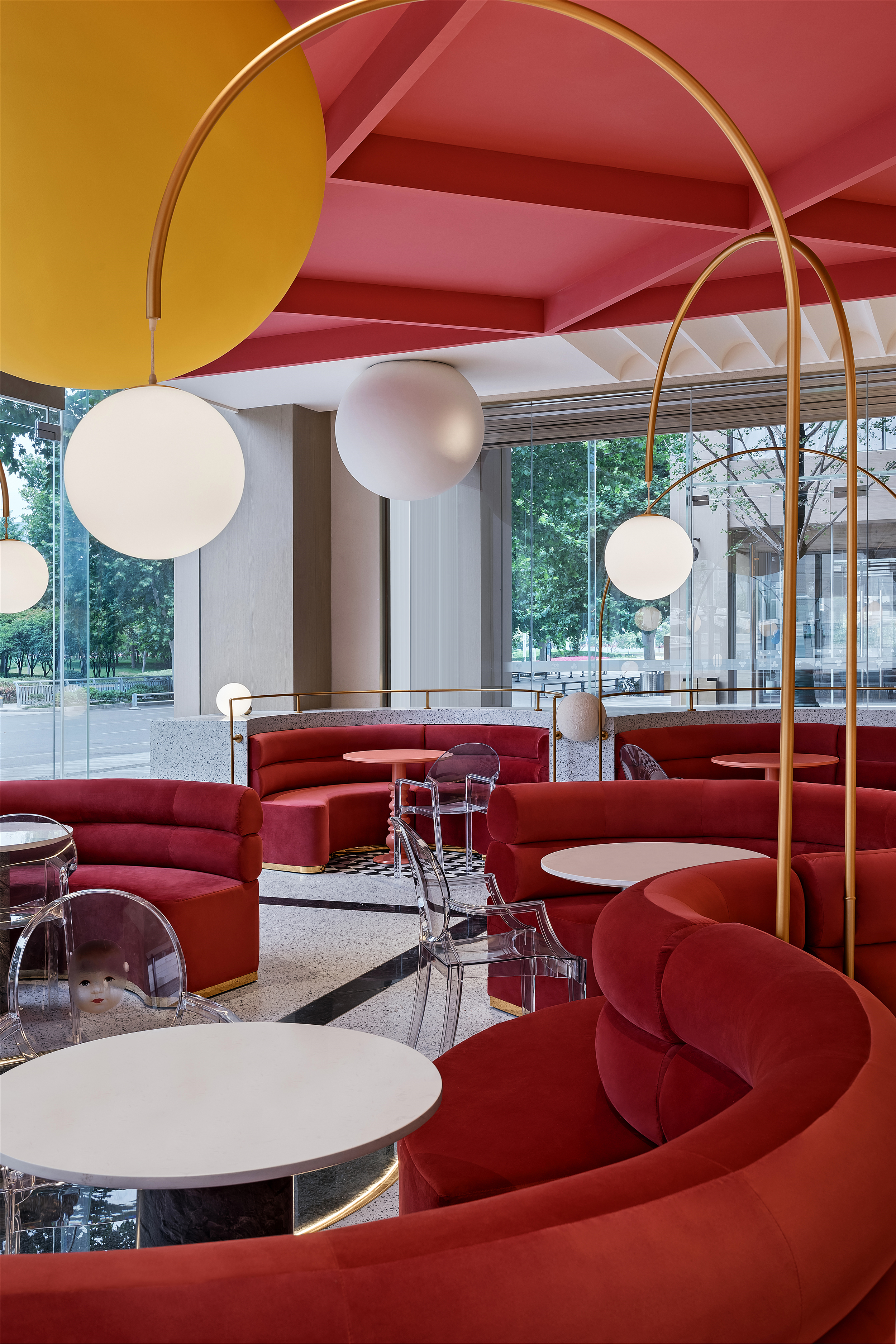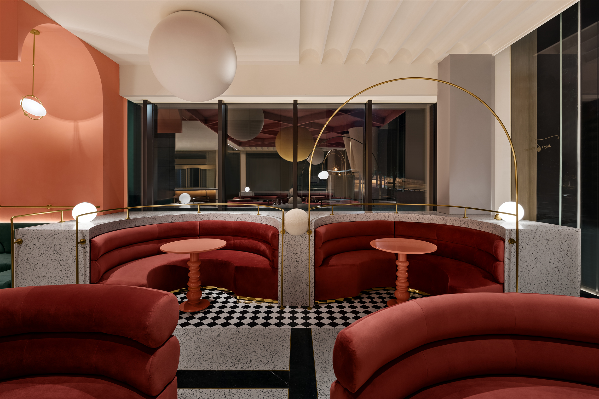 樱桃红用餐区的场域最大,同色系格纹吊顶之下是对称的天鹅绒沙发,魅惑撩人。两侧分别为珊瑚橘及奶油色用餐区,搭配松树绿软垫沙发,气质上更趋向清新、自然。家具设计也趋向设计感,譬如桌子造型灵感来源于意大利品牌VENINI早期大师作品的手稿设计,桌柱试图还原玻璃制品的轻盈、精巧之美。 -