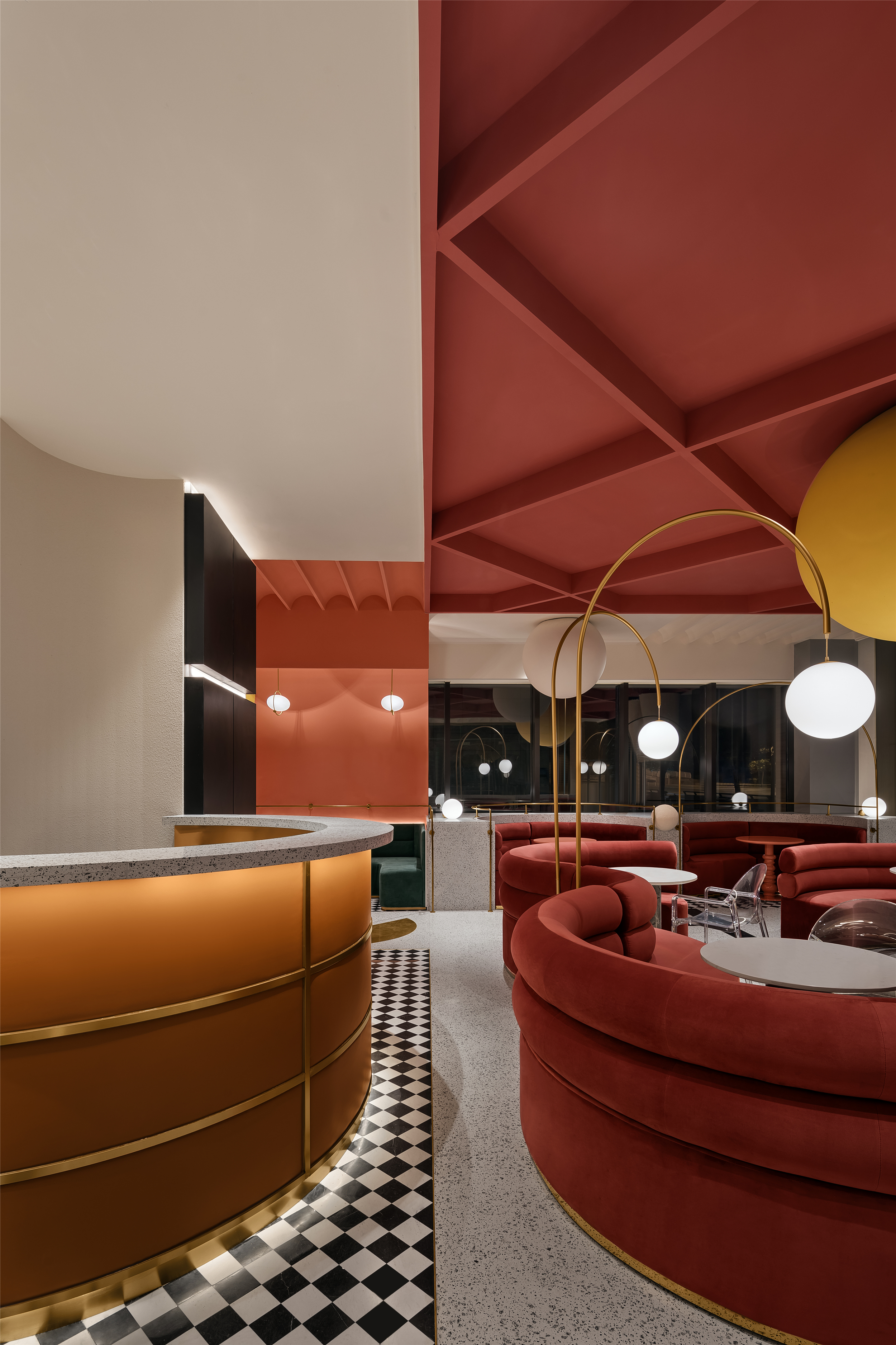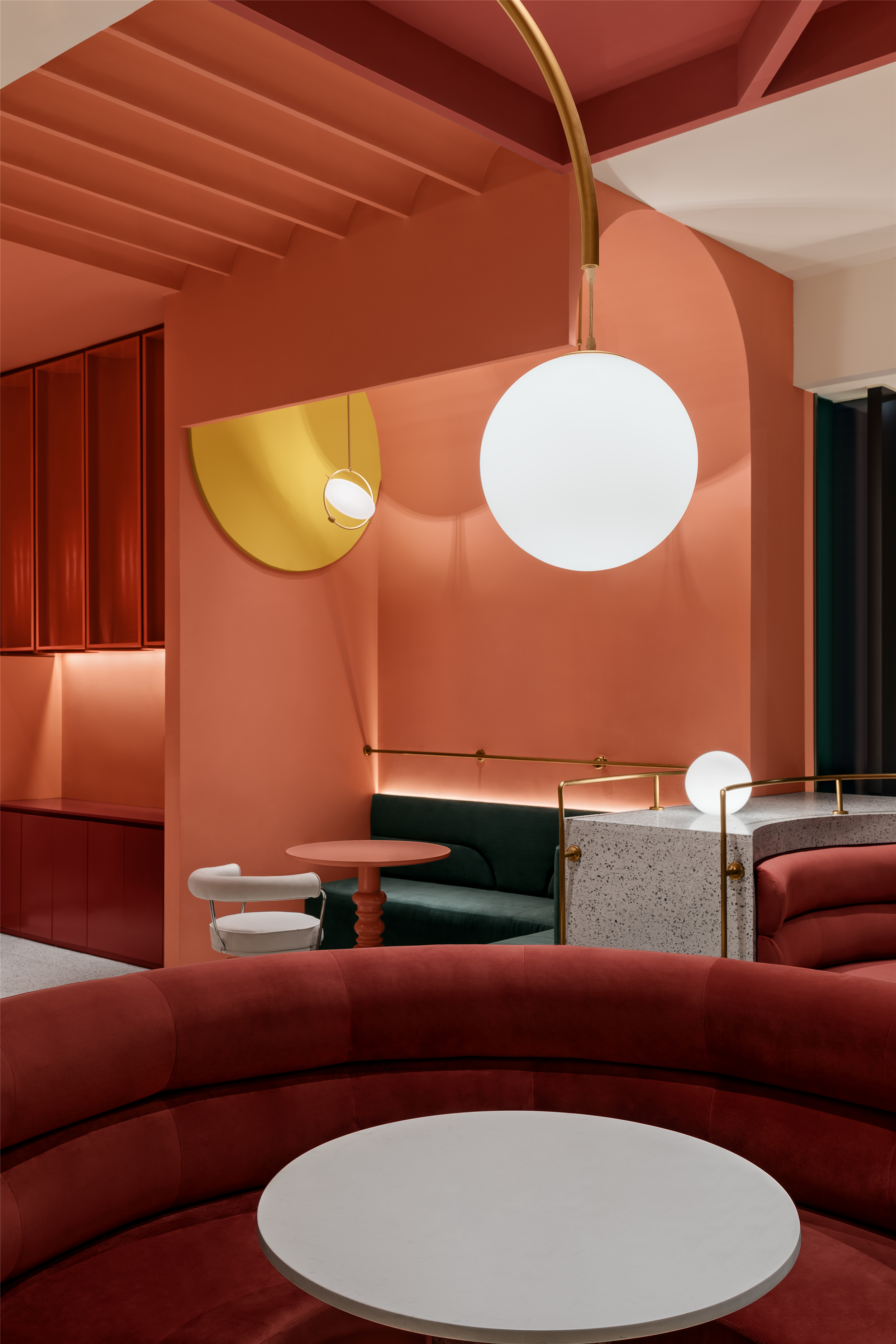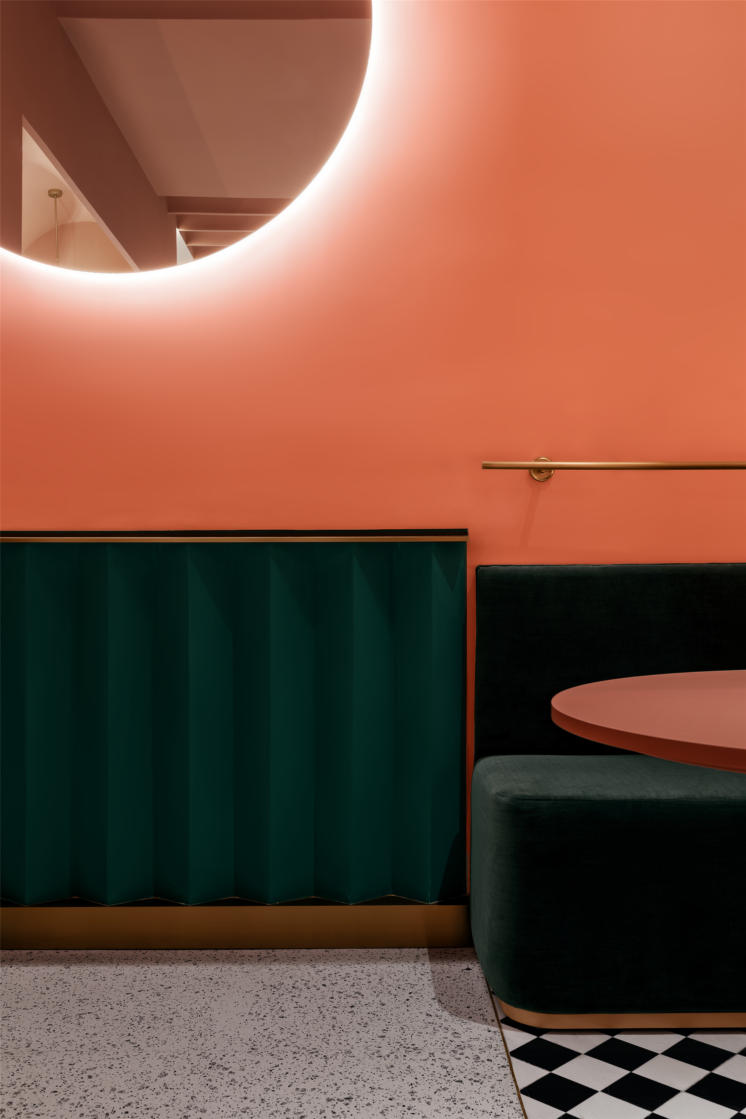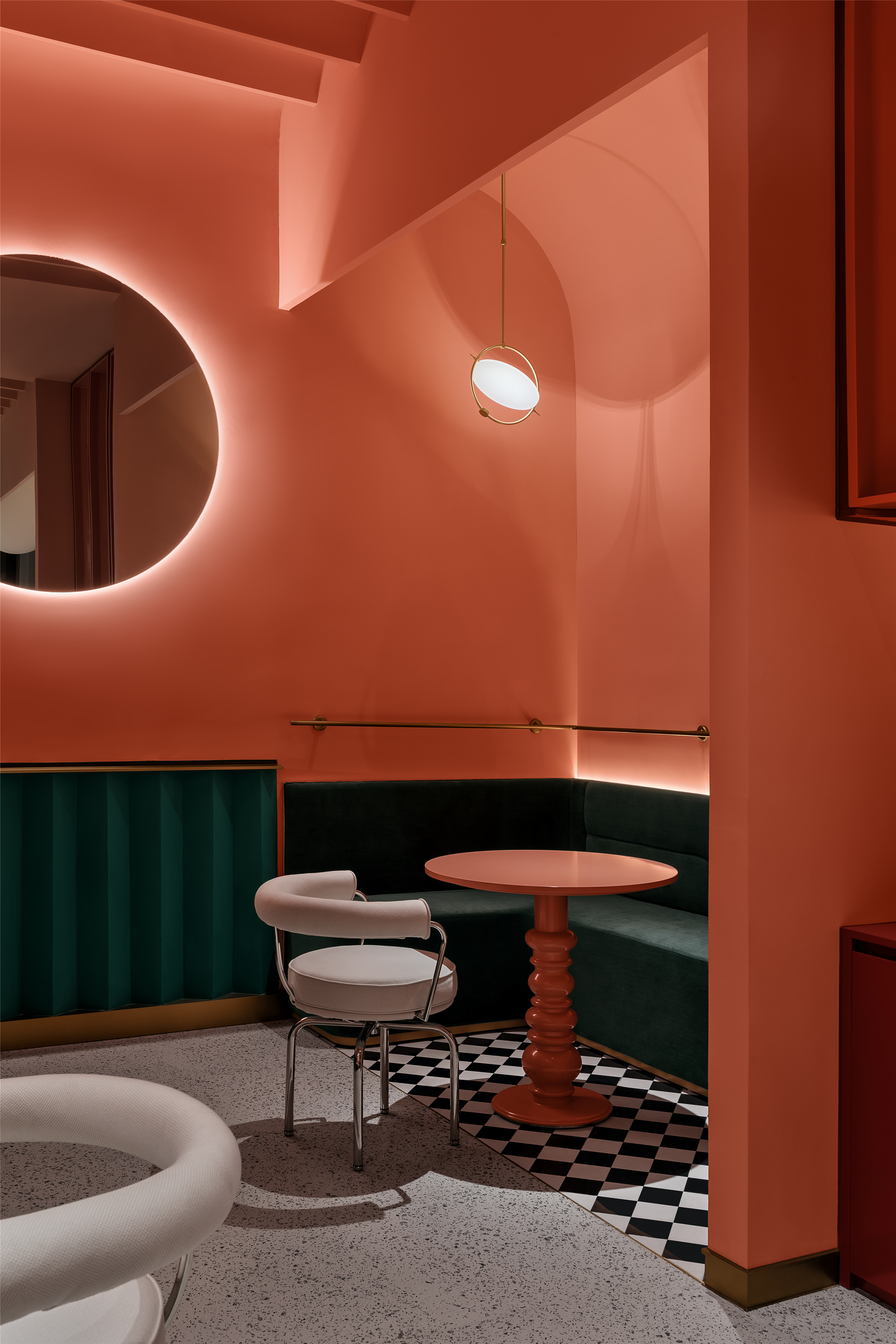 樱桃红用餐区的场域最大,同色系格纹吊顶之下是对称的天鹅绒沙发,魅惑撩人。两侧分别为珊瑚橘及奶油色用餐区,搭配松树绿软垫沙发,气质上更趋向清新、自然。家具设计也趋向设计感,譬如桌子造型灵感来源于意大利品牌VENINI早期大师作品的手稿设计,桌柱试图还原玻璃制品的轻盈、精巧之美。 -