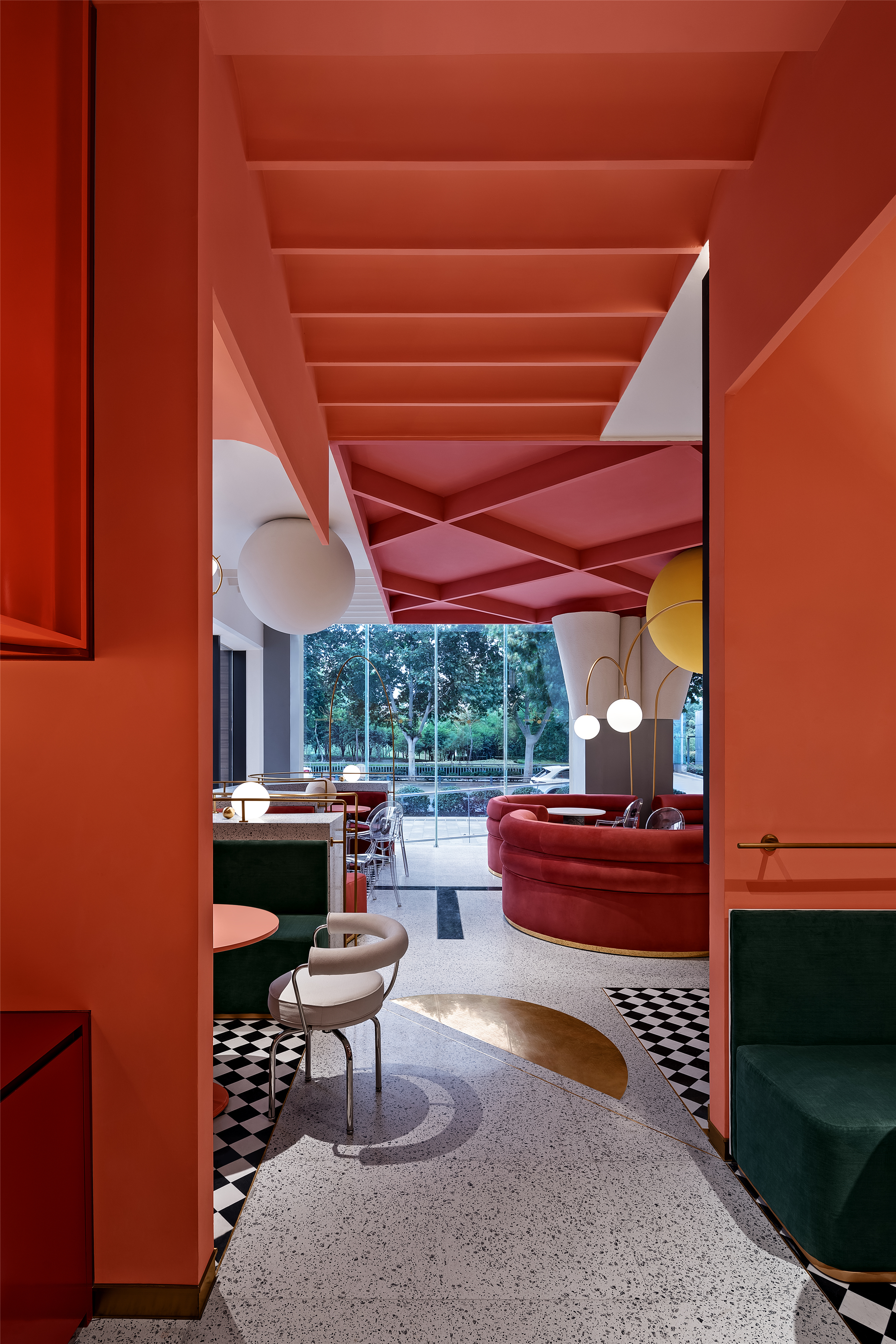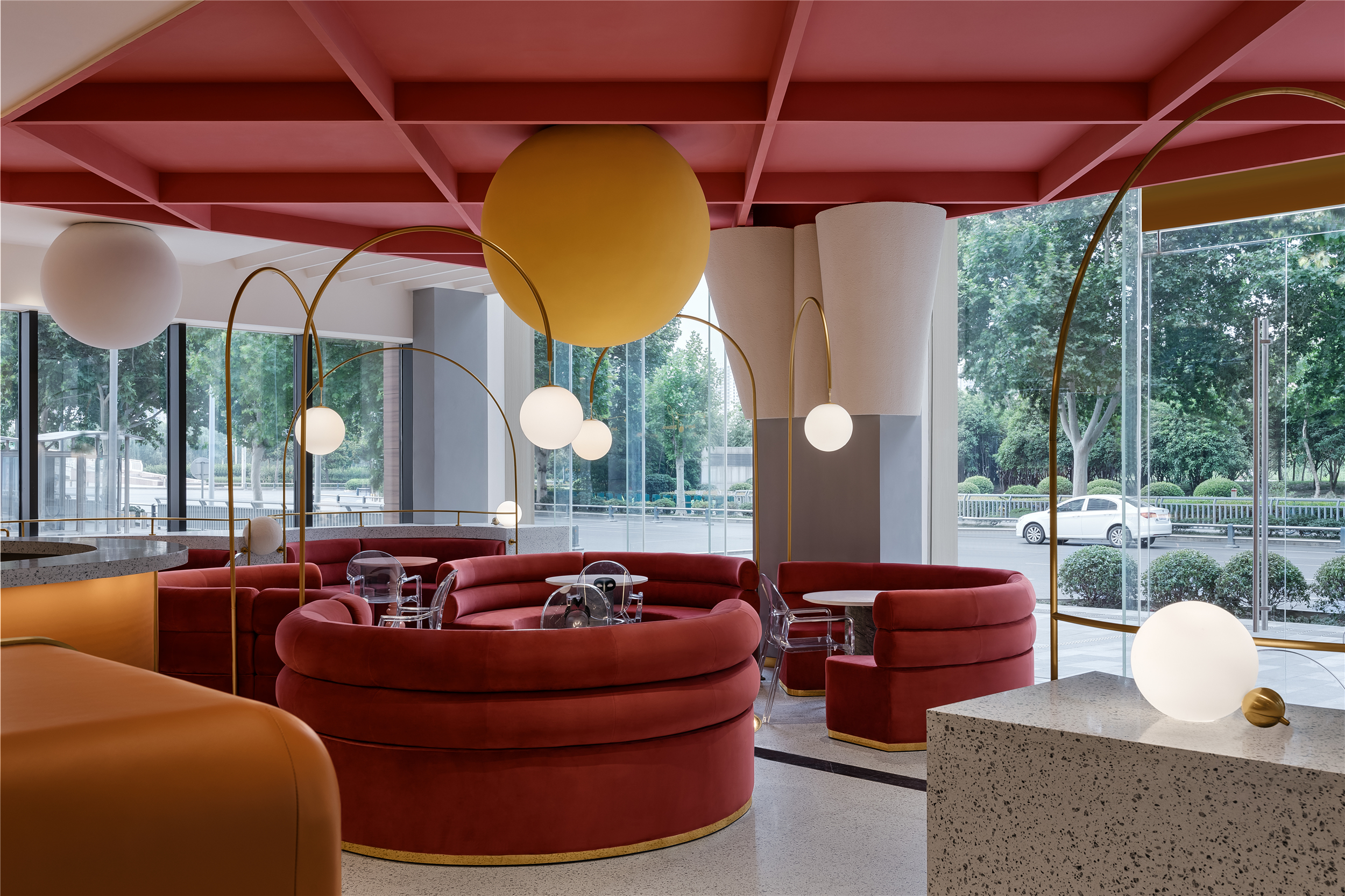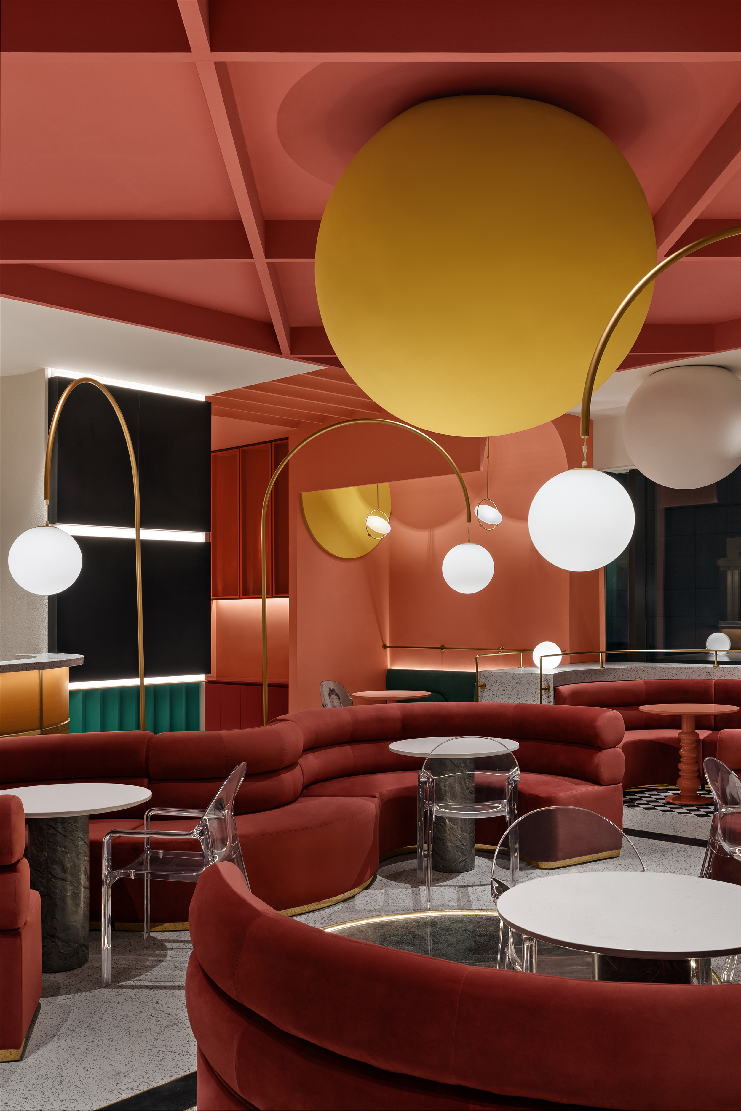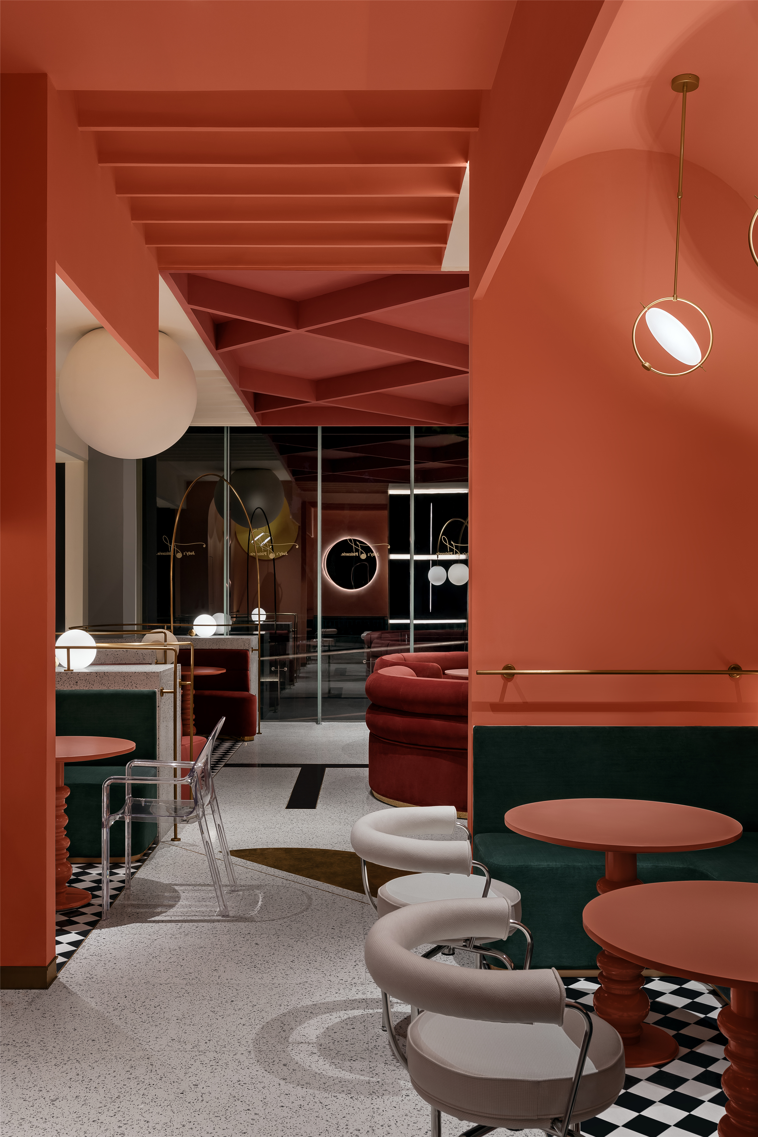 樱桃红用餐区的场域最大,同色系格纹吊顶之下是对称的天鹅绒沙发,魅惑撩人。两侧分别为珊瑚橘及奶油色用餐区,搭配松树绿软垫沙发,气质上更趋向清新、自然。家具设计也趋向设计感,譬如桌子造型灵感来源于意大利品牌VENINI早期大师作品的手稿设计,桌柱试图还原玻璃制品的轻盈、精巧之美。 -