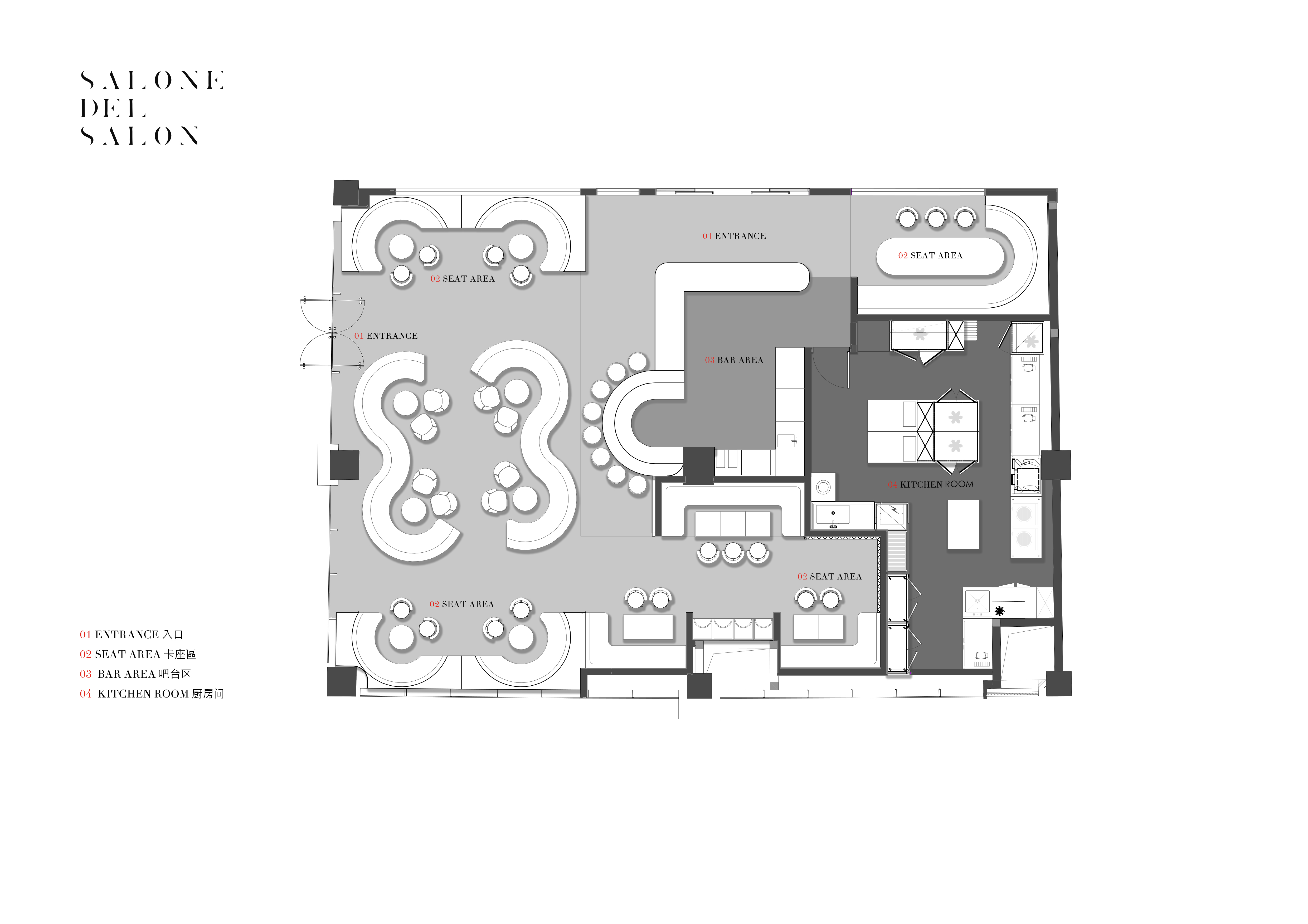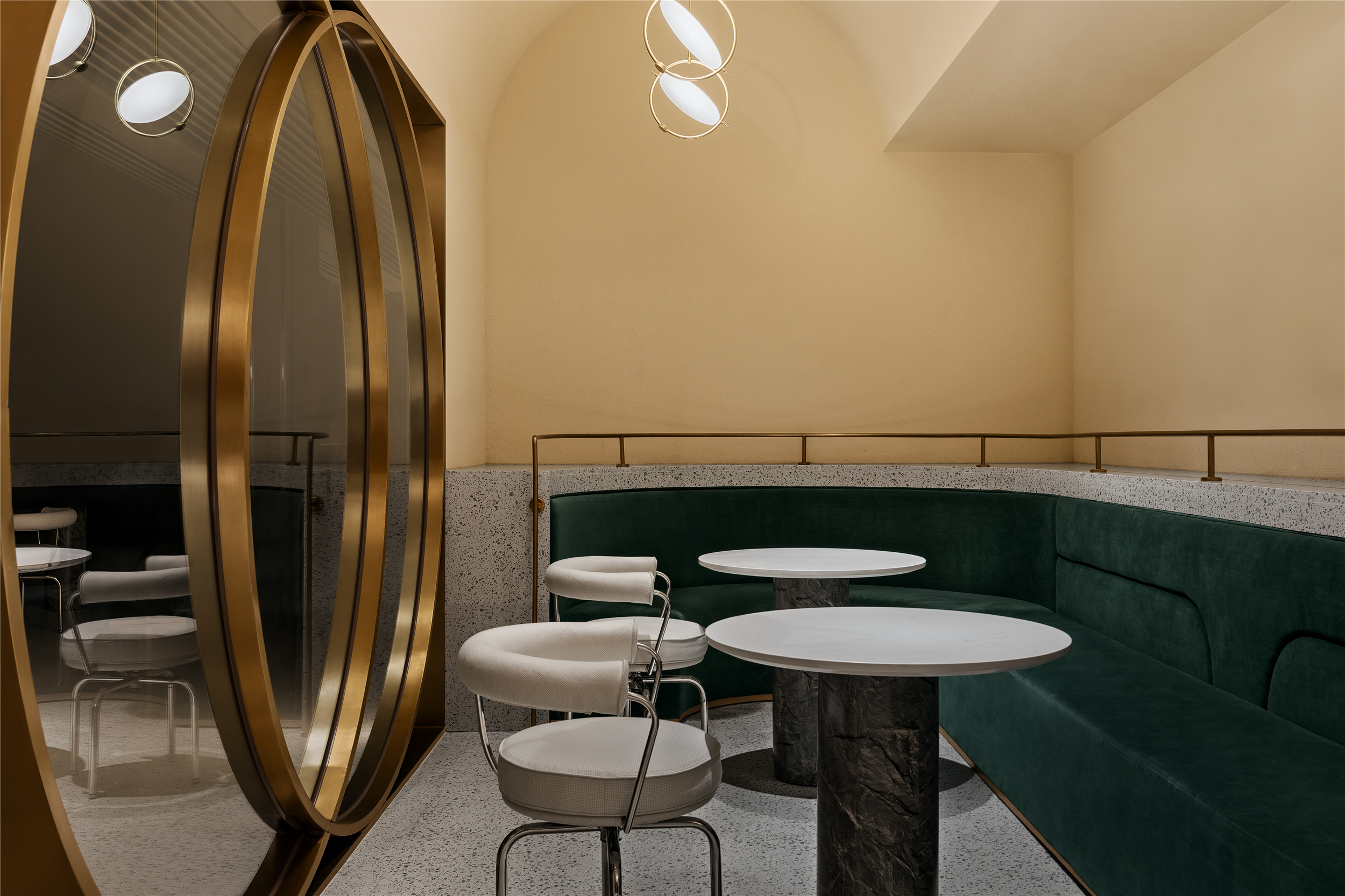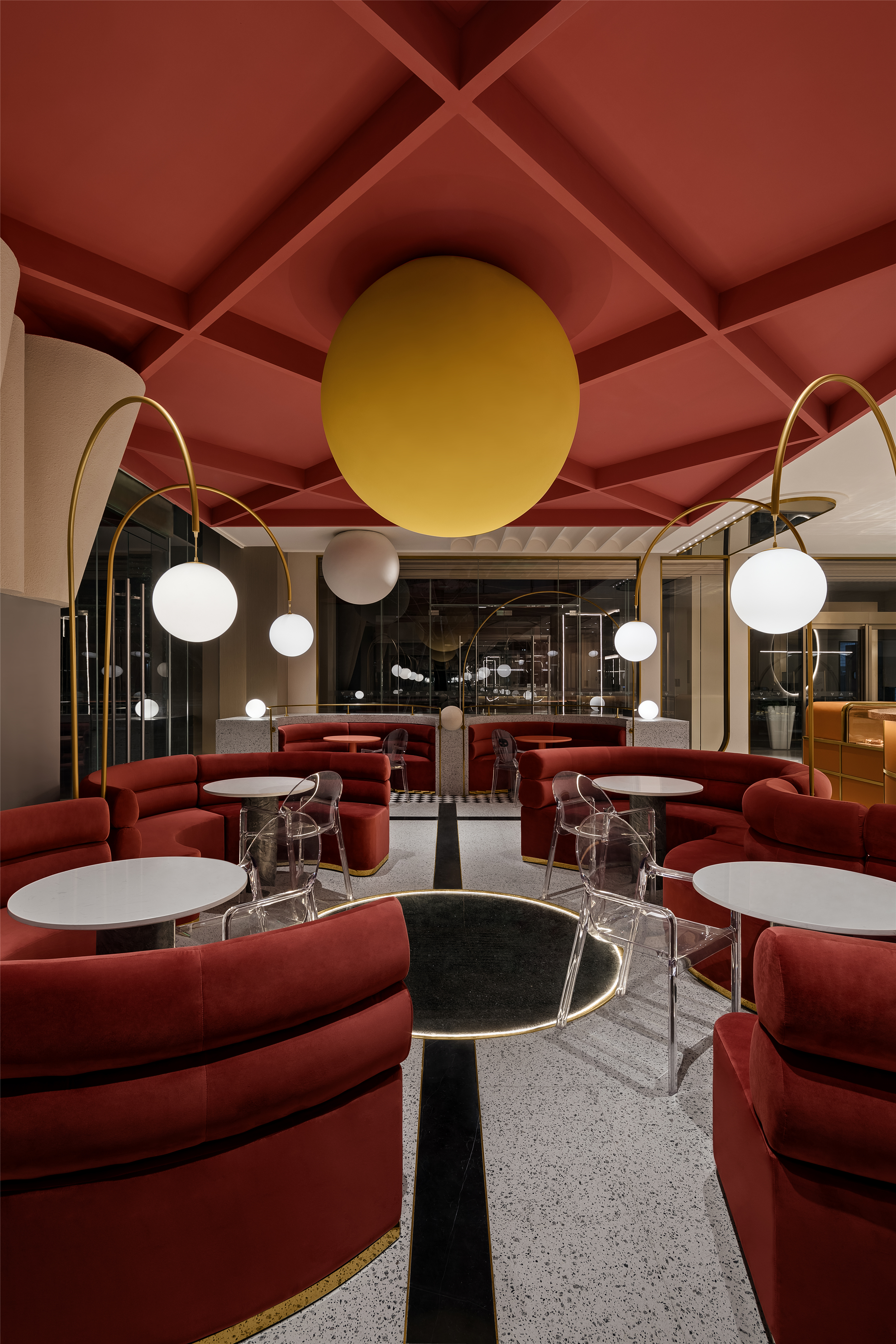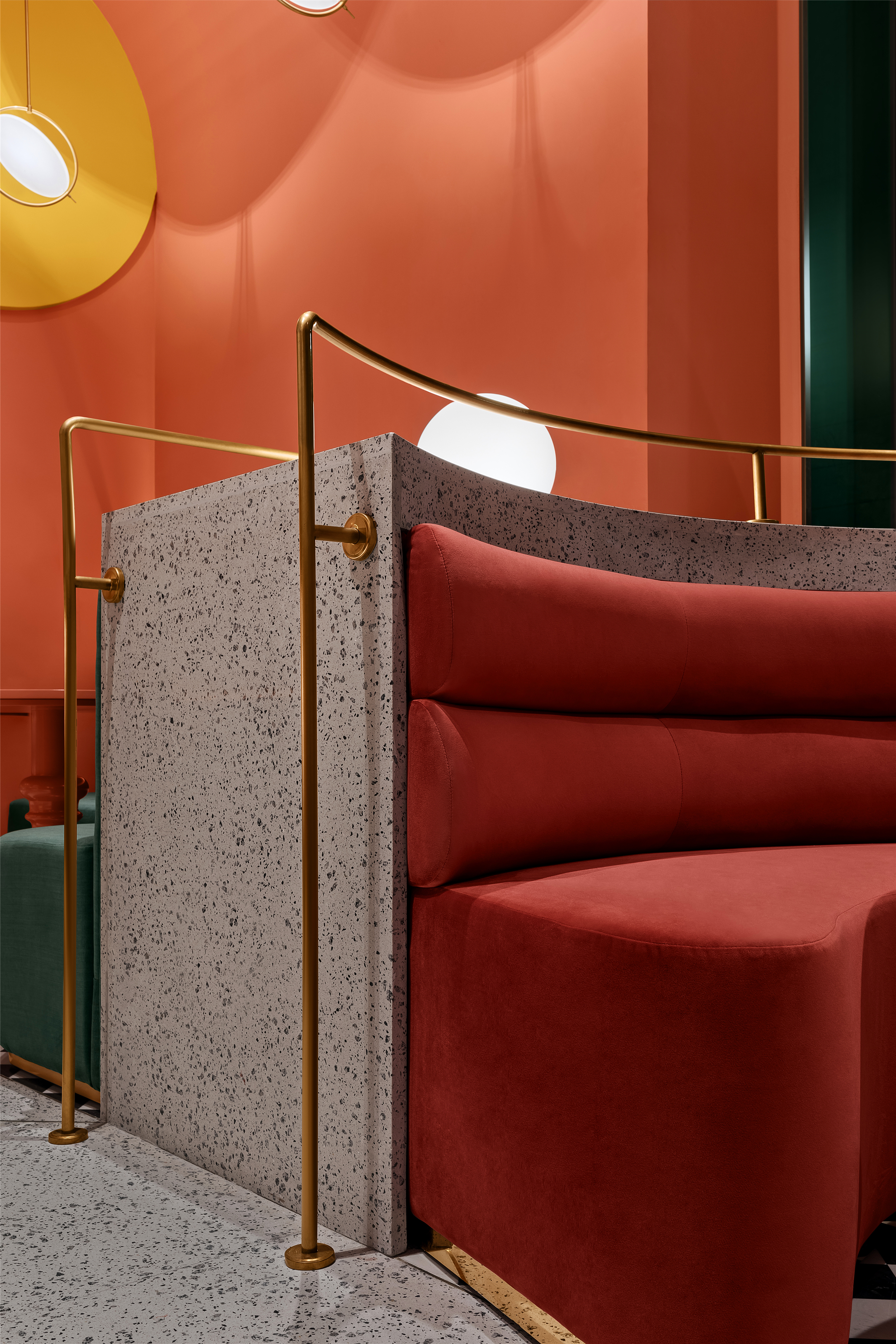 樱桃红用餐区的场域最大,同色系格纹吊顶之下是对称的天鹅绒沙发,魅惑撩人。两侧分别为珊瑚橘及奶油色用餐区,搭配松树绿软垫沙发,气质上更趋向清新、自然。家具设计也趋向设计感,譬如桌子造型灵感来源于意大利品牌VENINI早期大师作品的手稿设计,桌柱试图还原玻璃制品的轻盈、精巧之美。 -