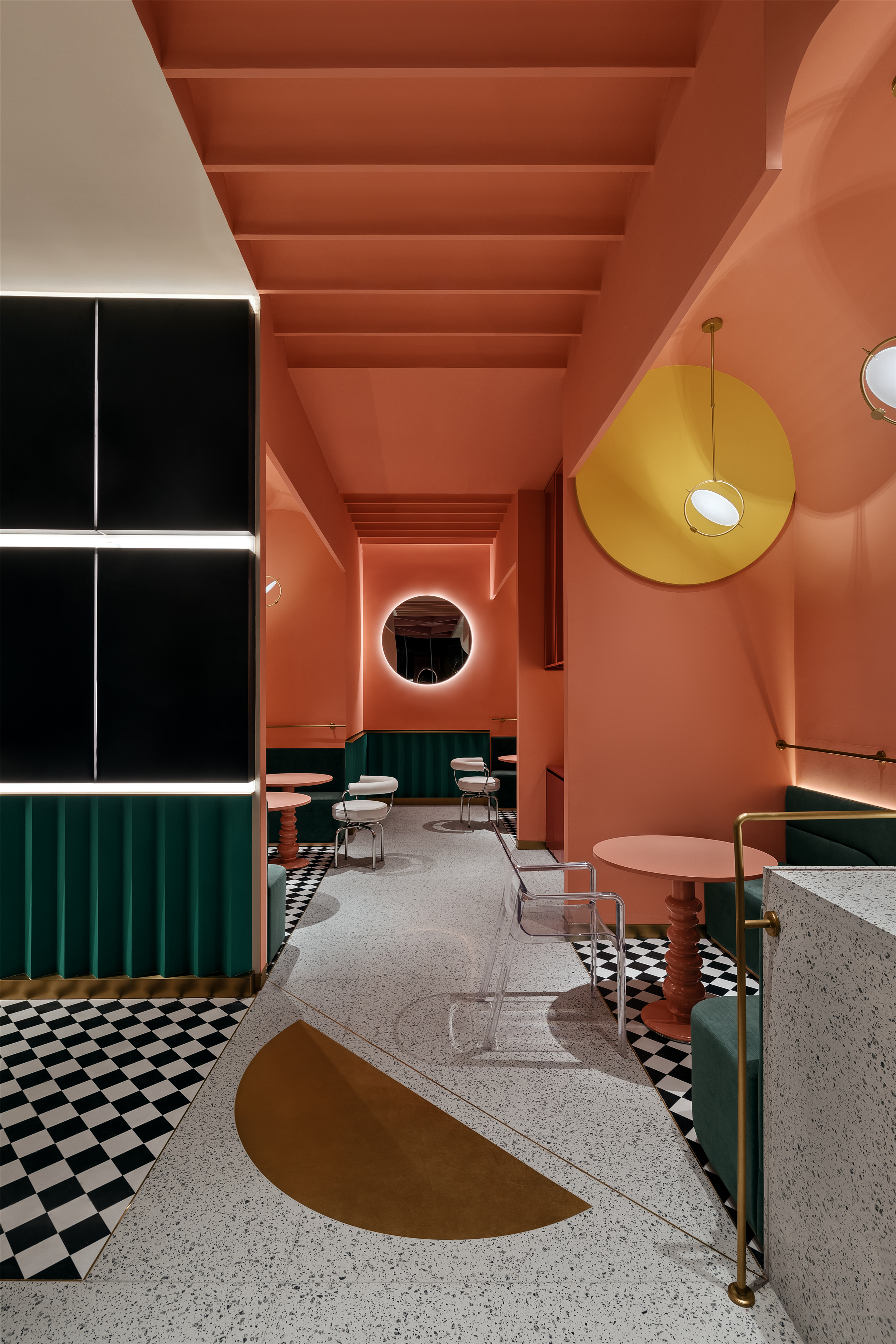 项目定位:“每个人的童年记忆都是色彩斑斓的,甜甜圈、糖果屋、甚至是街边的糖葫芦,这些点点滴滴的色彩,圈圈圆圆的种种,编织在我的童年里。”设计师沙龙在阐析Judy's Patisserie朱迪法式甜品屋的灵感来源时这样说道,“我把这种对童年的情感寄托赋予甜点店。因为甜,所以想到了色彩;因为圆,又忆到了无限。”