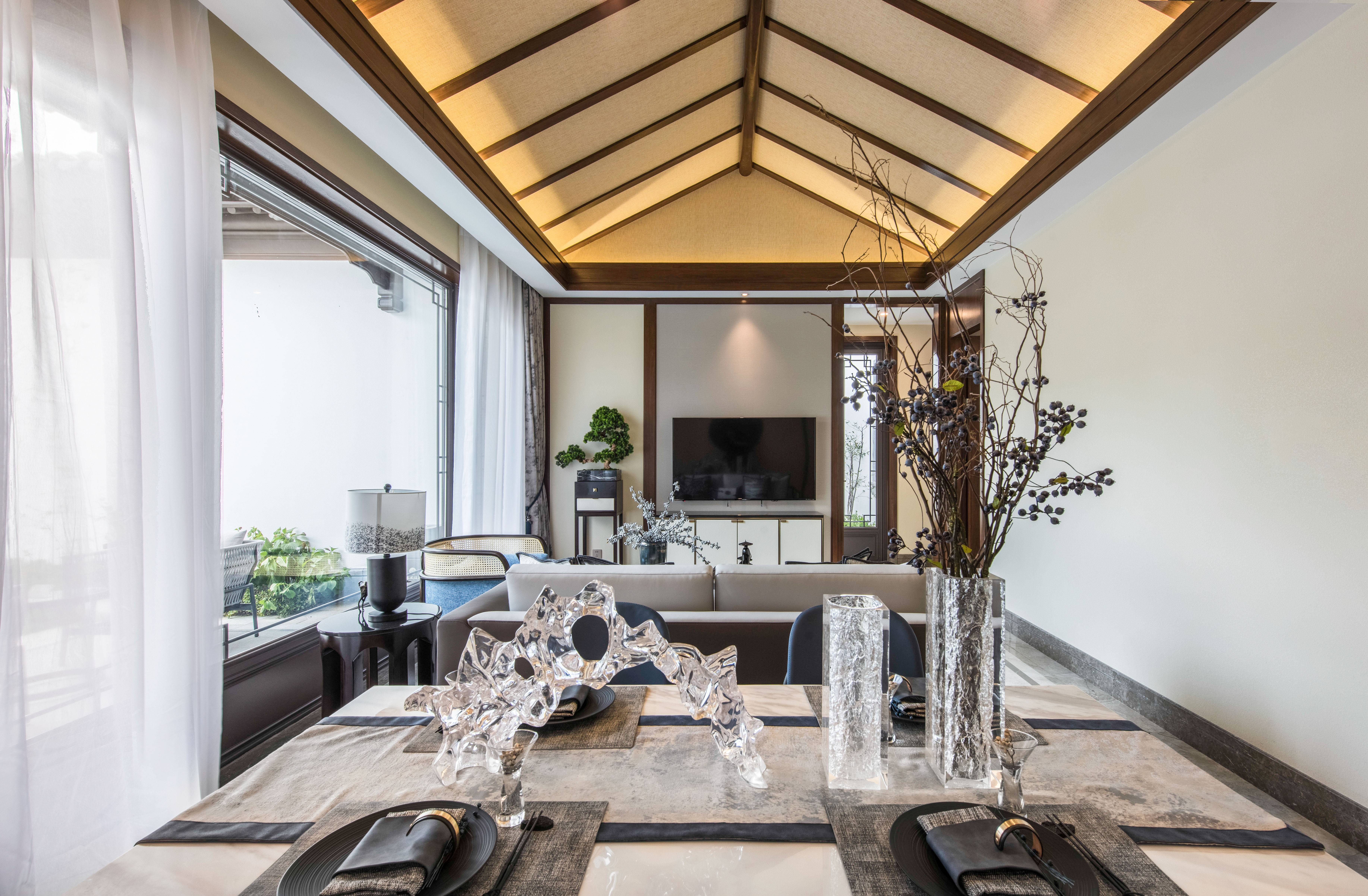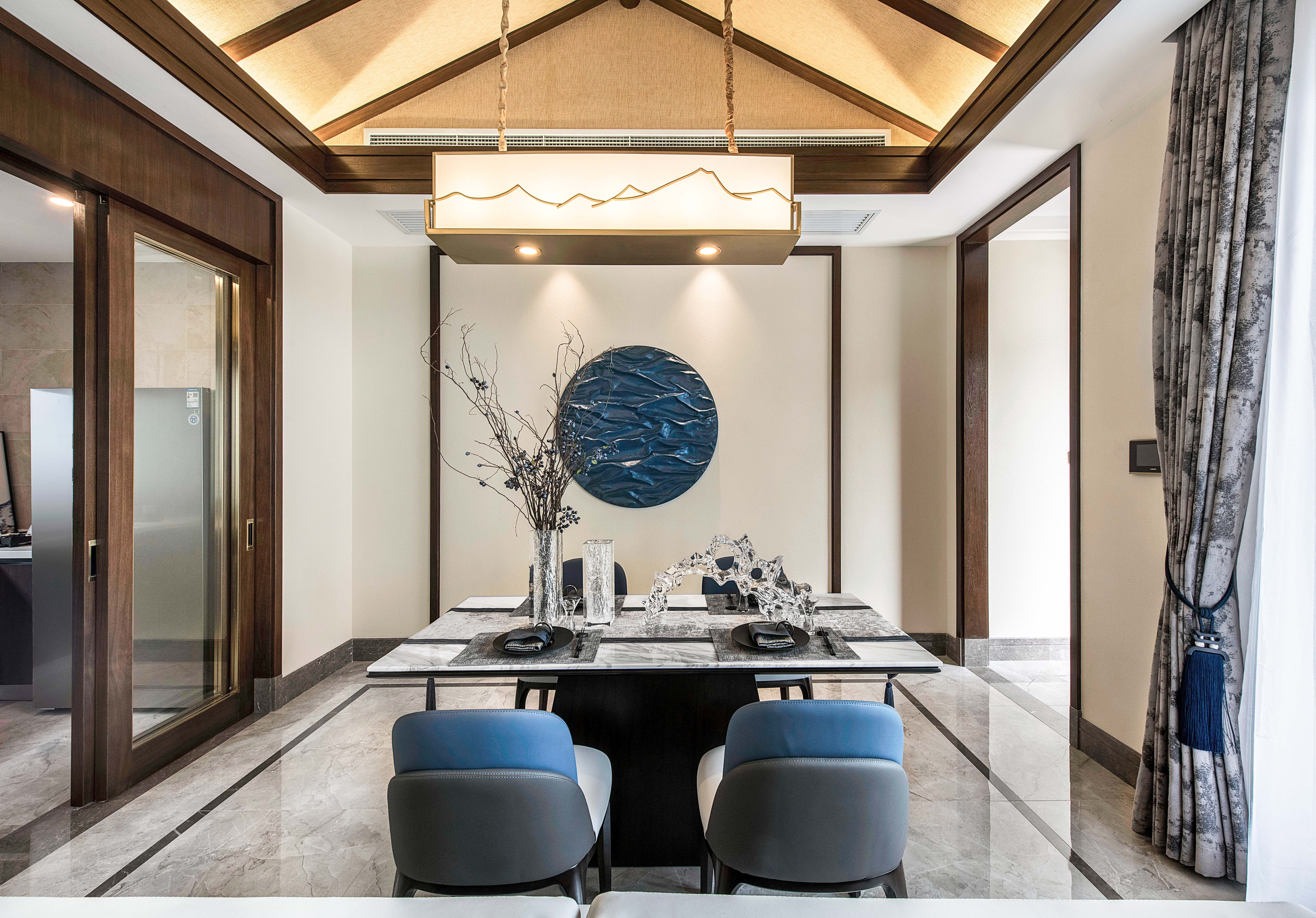 图10餐厅:餐厅吊灯上的纹理如同高山,而餐桌上的玻璃饰品则是流水;守一方高山流水,泊一片淡雅心境。一家人能够天天围着餐桌坐下来其乐融融的一起吃饭,人生要奋斗的高山流水也就是这样了吧。