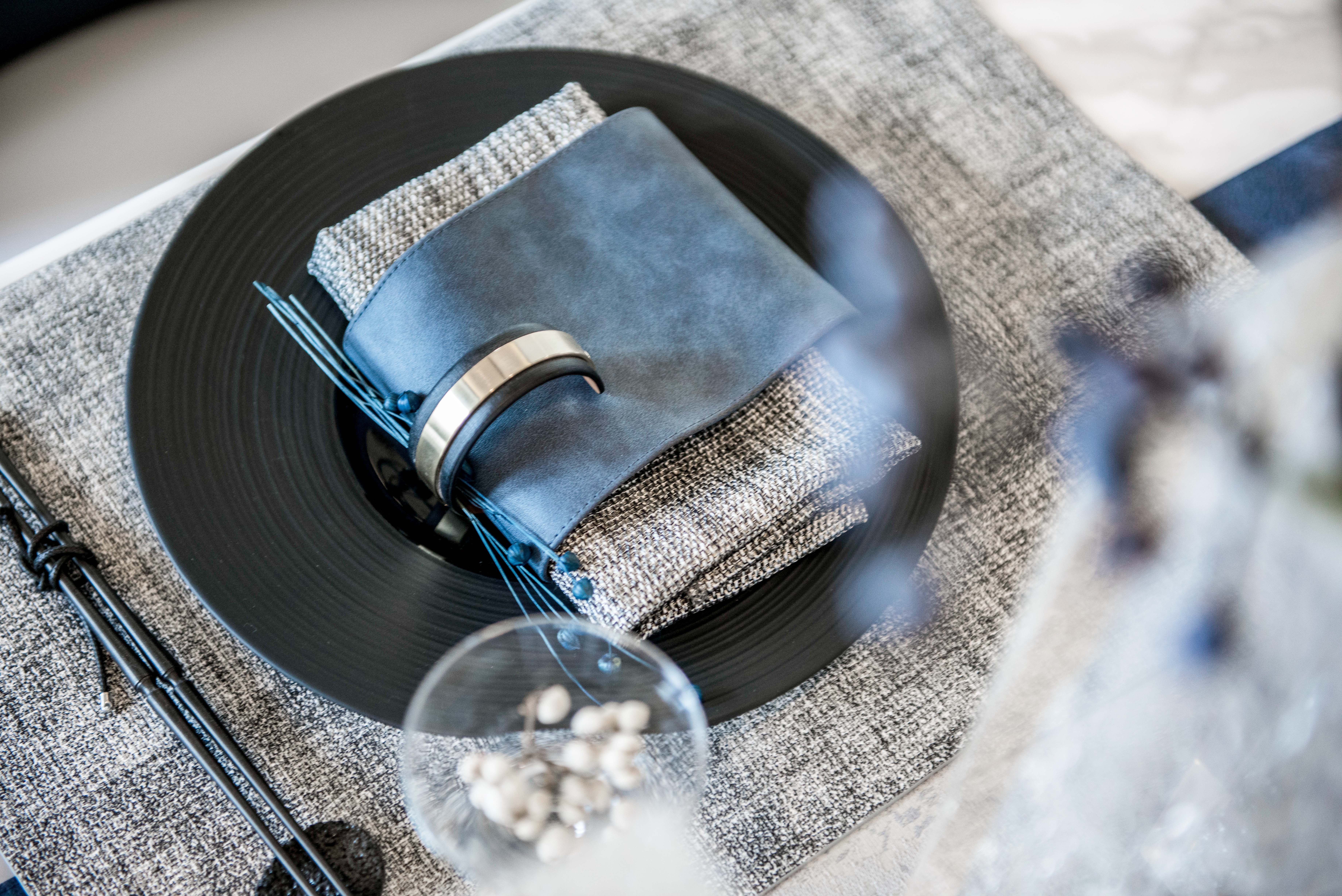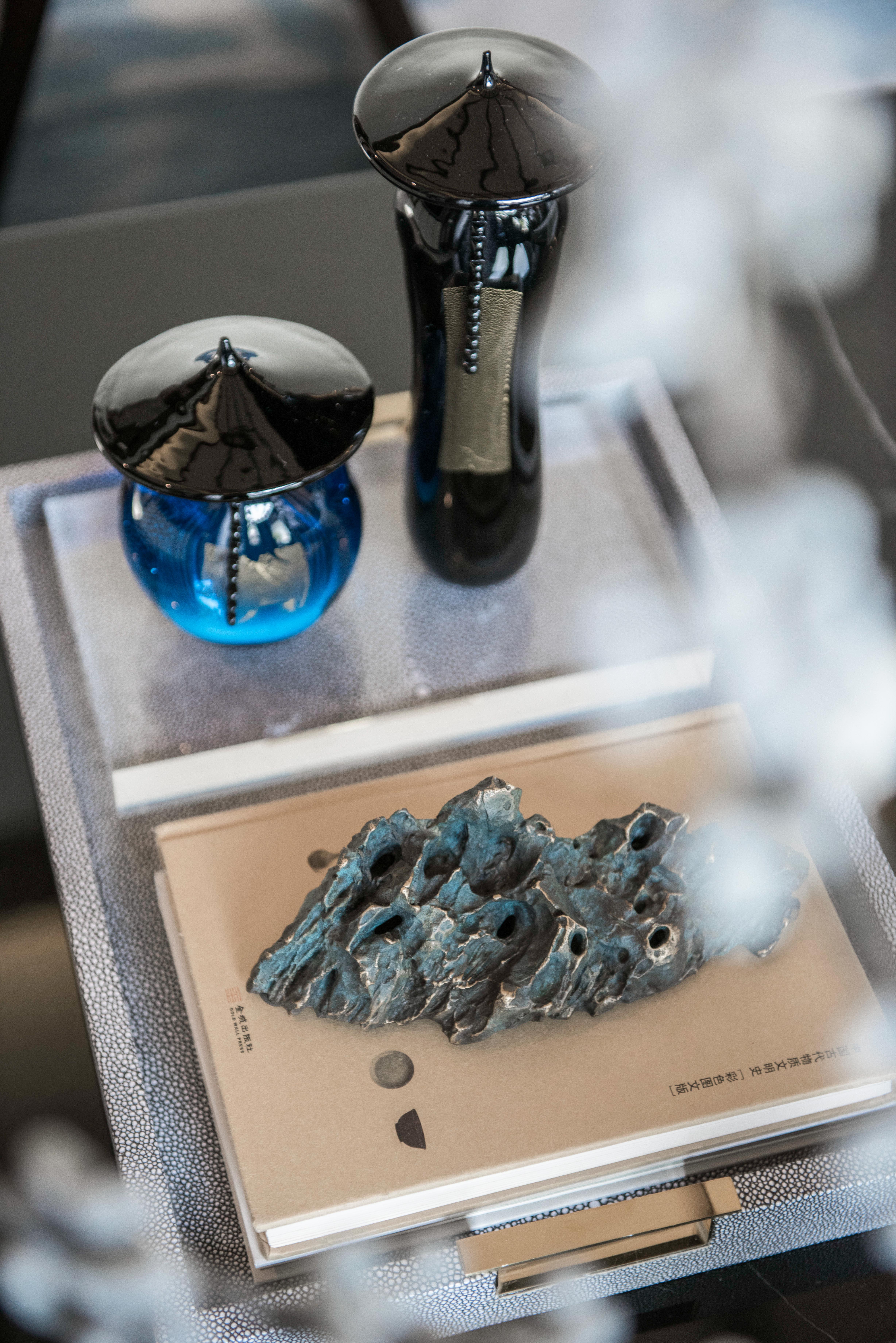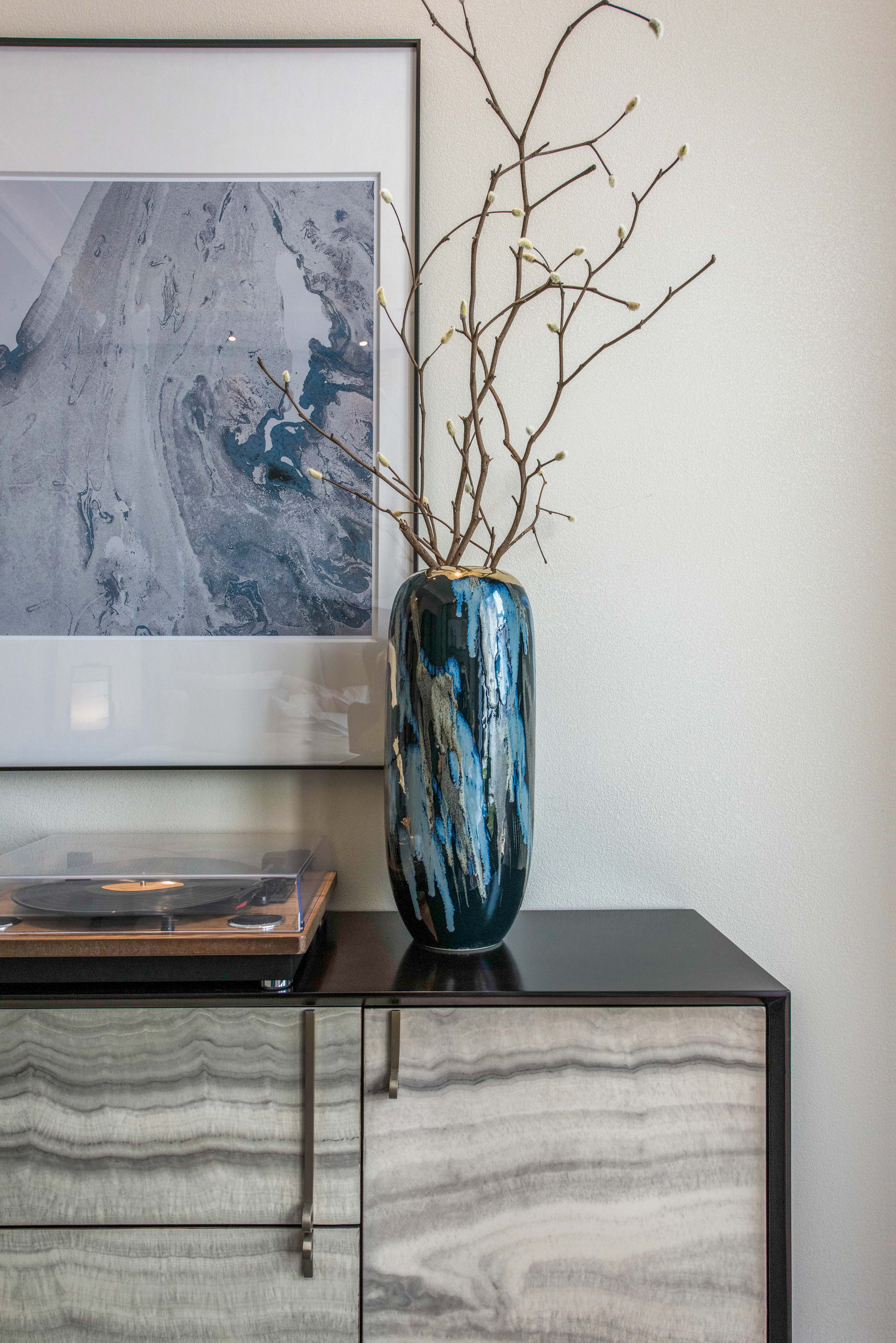 图9餐厅:立体凹凸波浪纹壁饰布局抽象,深邃蓝色婉如流动的海水,意象具有张力。邂逅餐桌上枯枝花艺便成为明月,打造出如诗般古雅梦幻的意境。