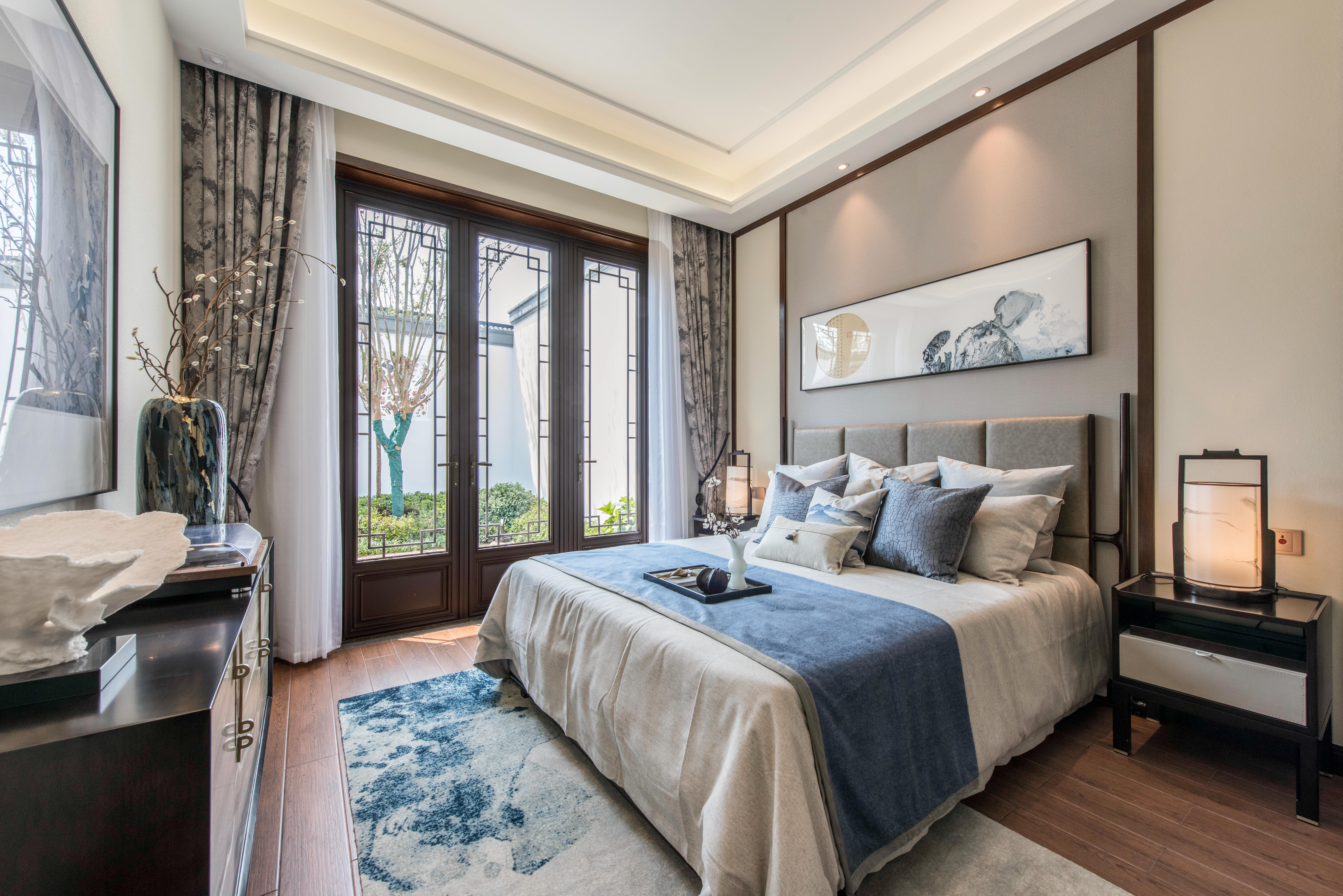 图12主卧:进入主卧则被床头和床尾两侧的装饰画吸引,山水画作的诗意绵邈,在有限的空间中营造出无限的东方意韵。