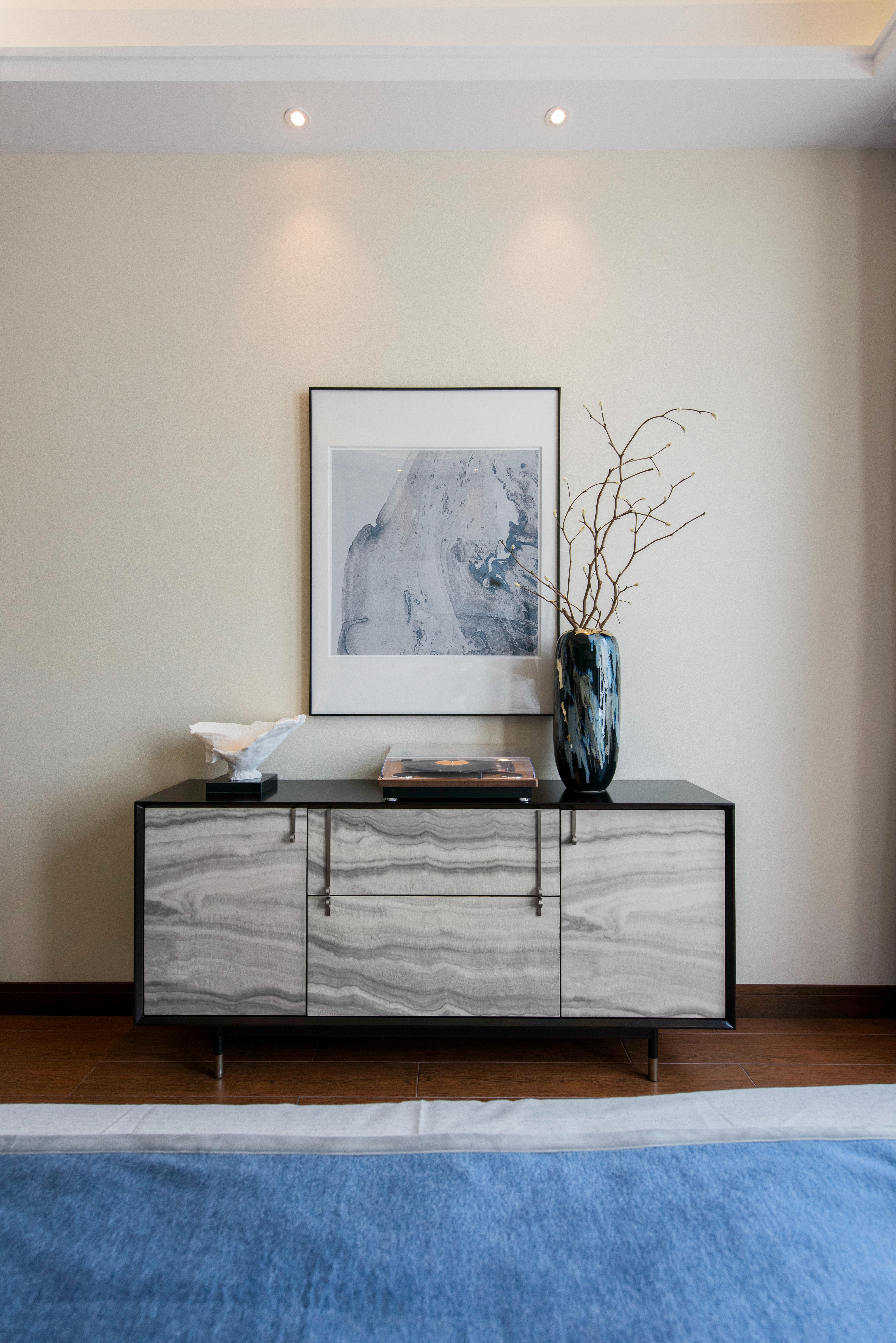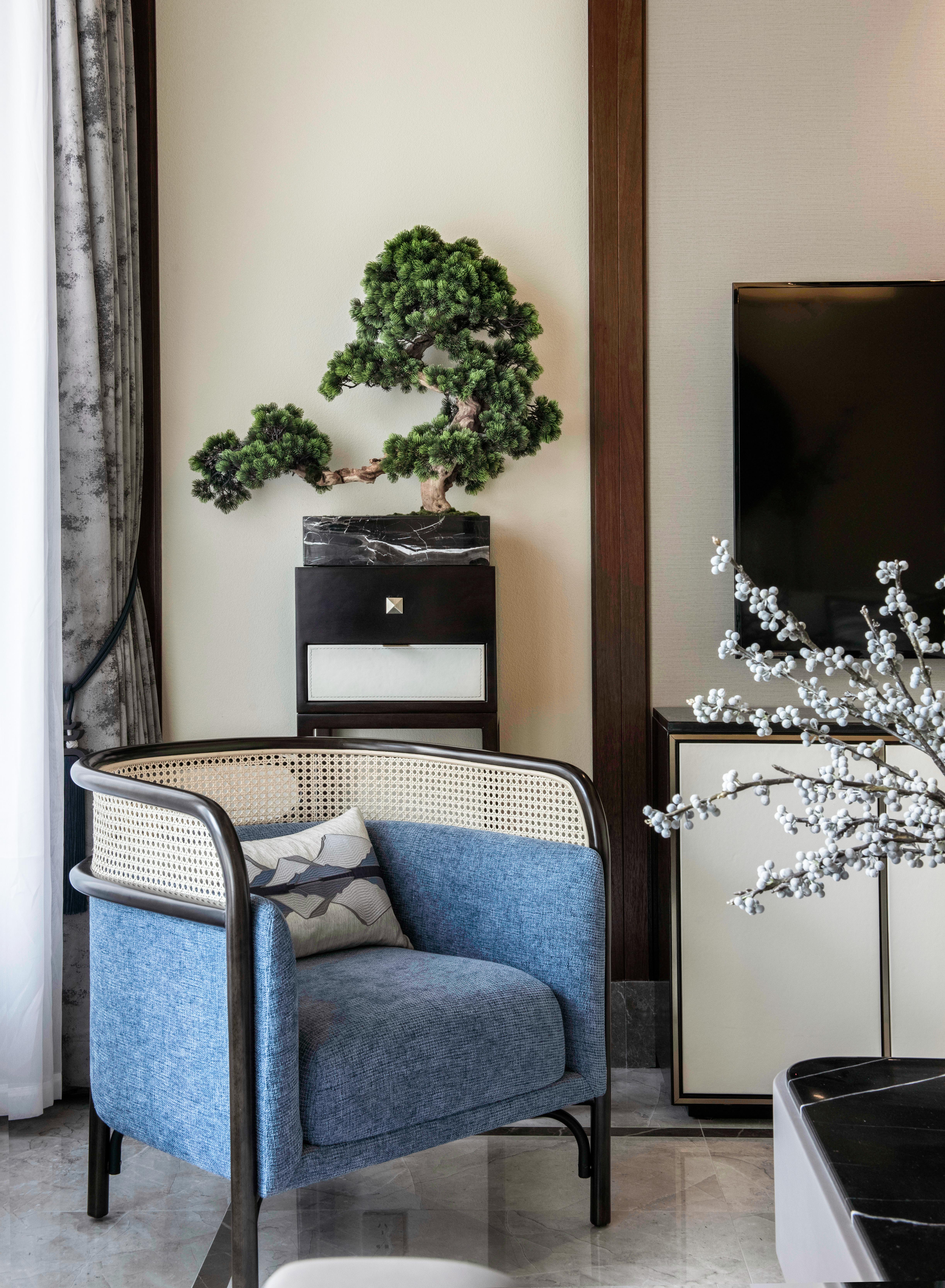 图3客厅:步入客厅,深邃蓝令人着迷,就像它的名字一样,拥有大海一样的深邃与神秘,这种颜色保留了深色系带来的质感