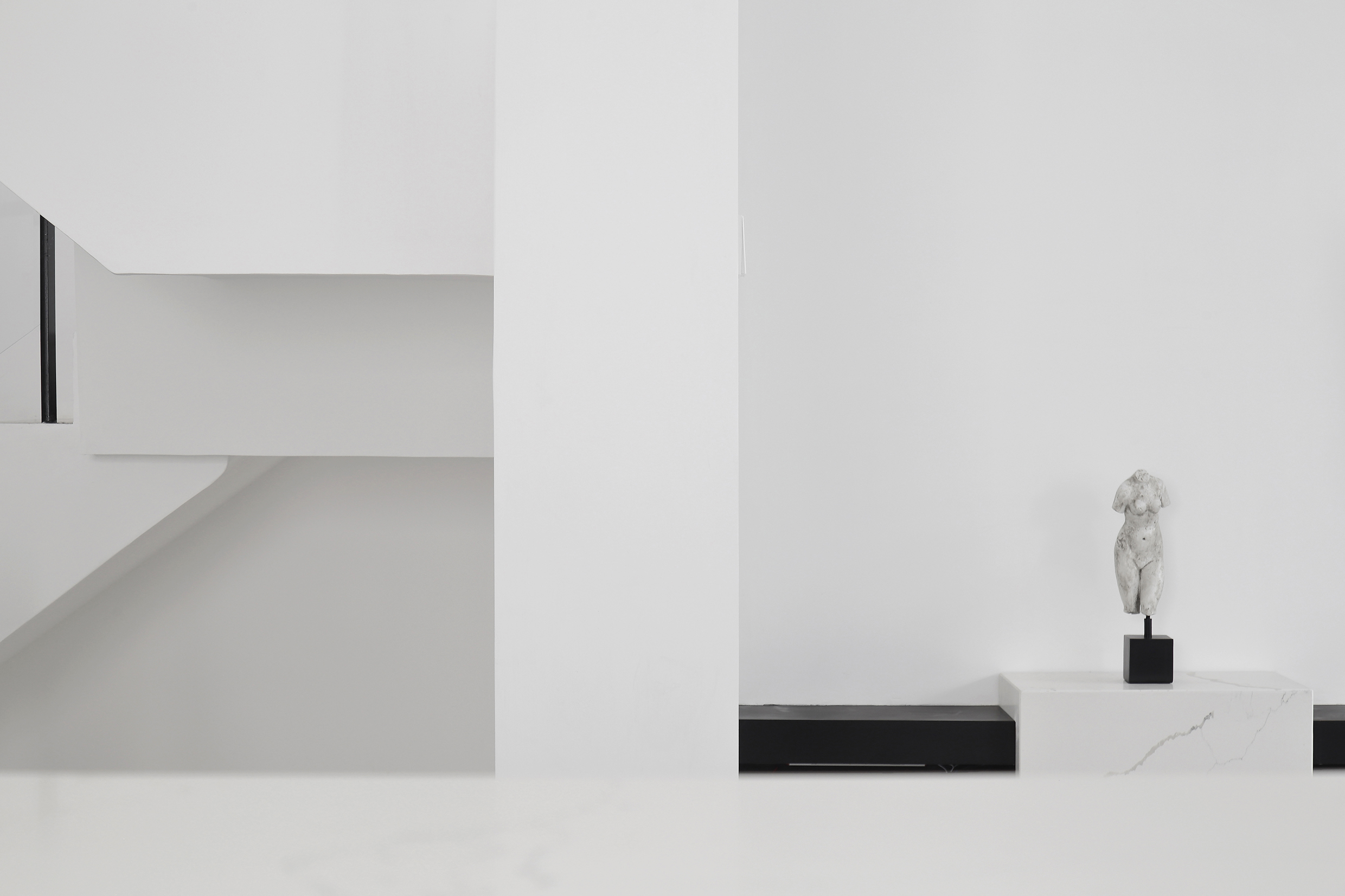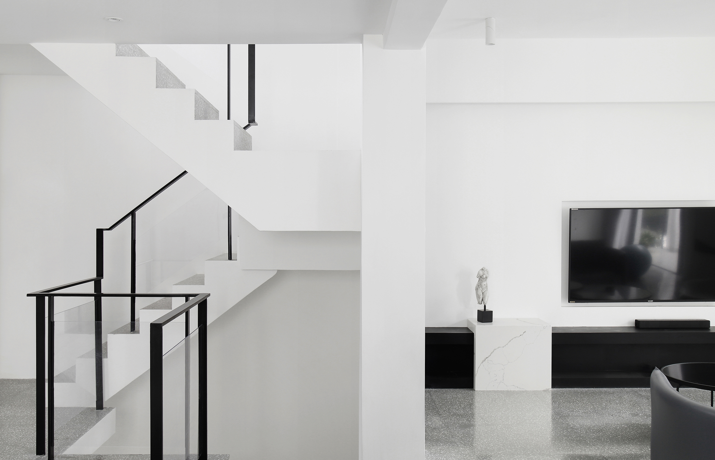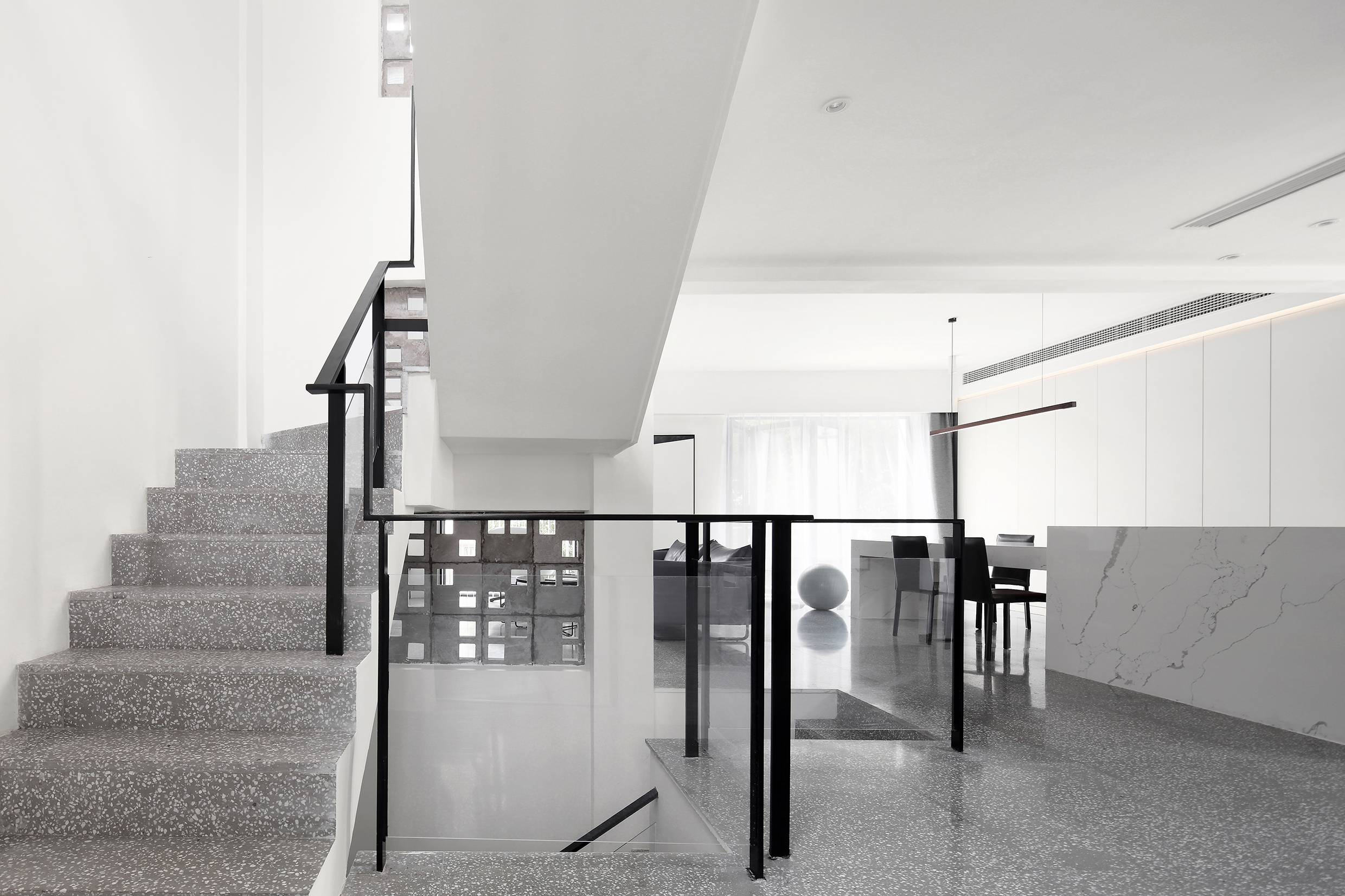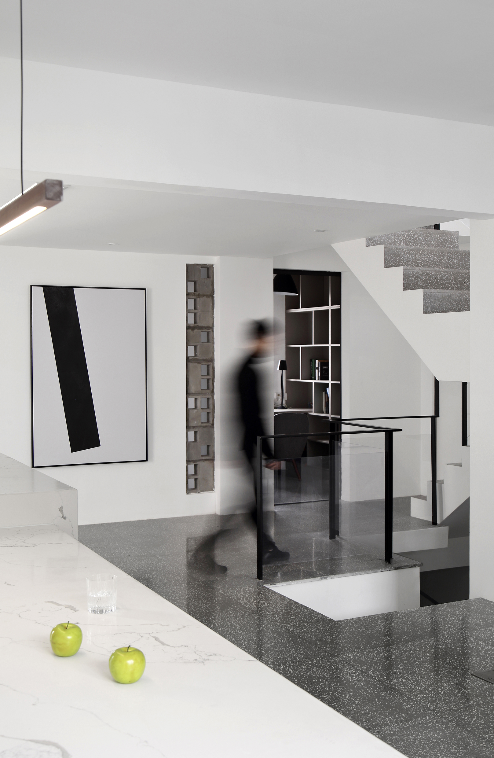 从门厅的楼梯上来后便进入客厅。整个空间的基础色调只有黑、白、灰三种颜色,线条感极强的黑色楼梯扶手在白色背景下呈现出建筑的美感。