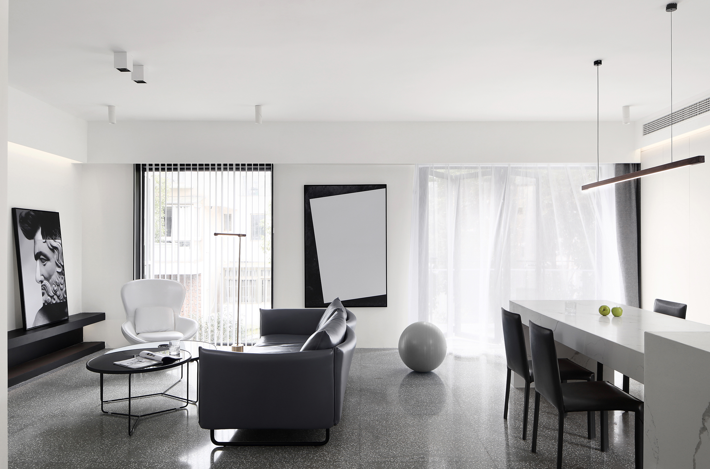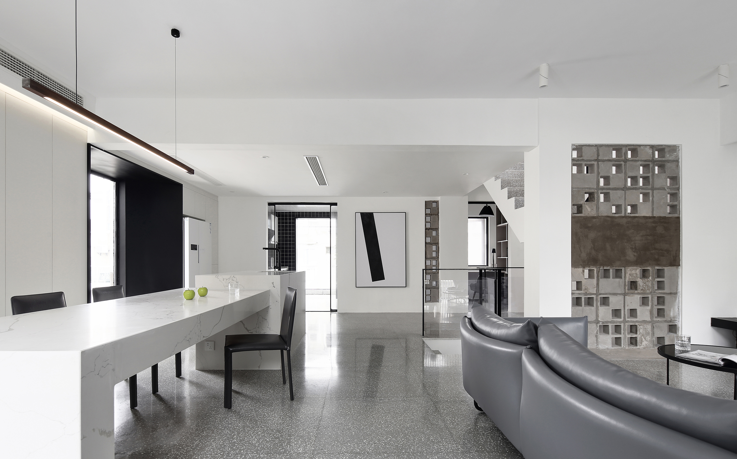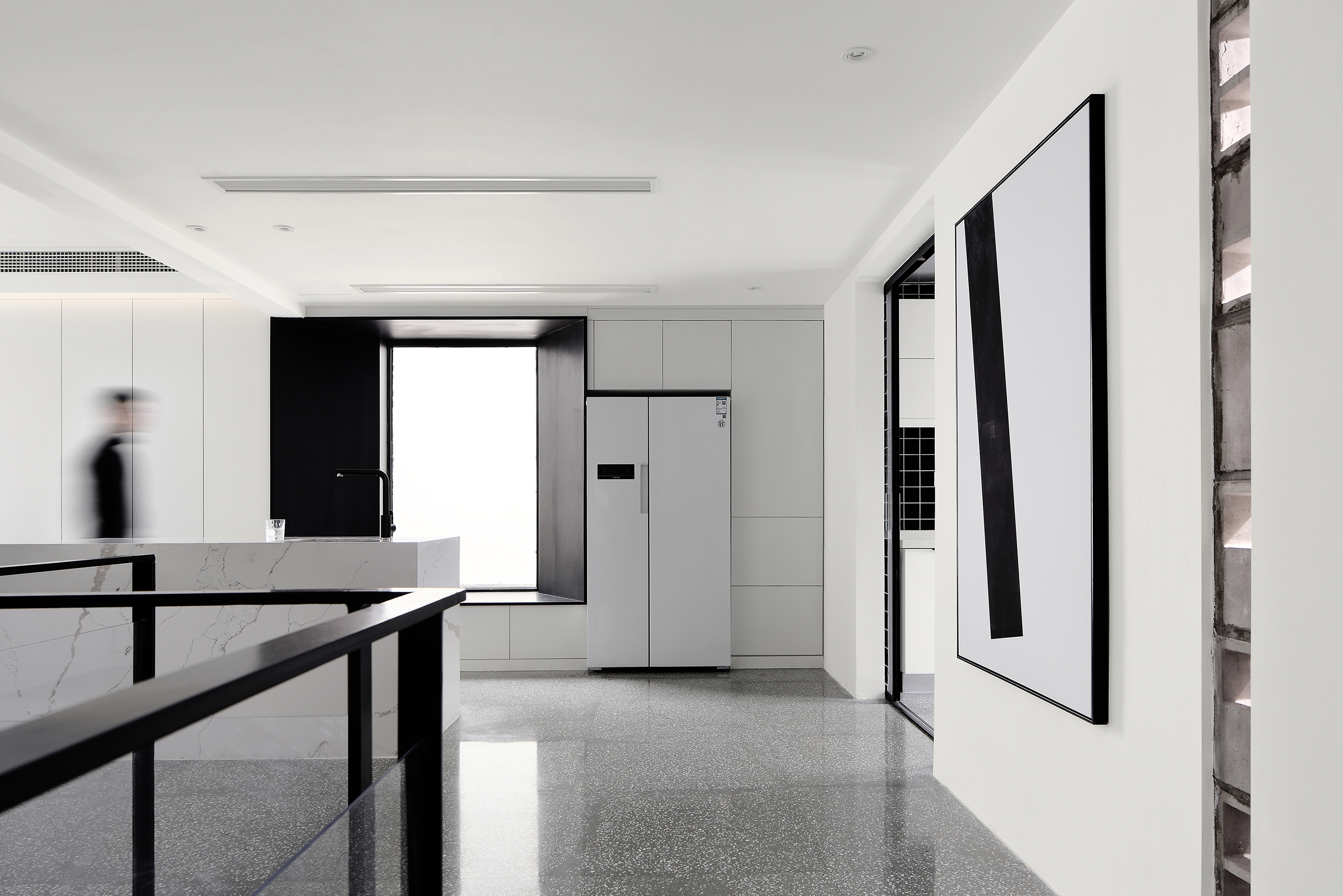 为了营造出通透大气的空间感受,我们将所有窗户改为落地窗。收起所有的色彩,整个空间里只留下光影与黑白。