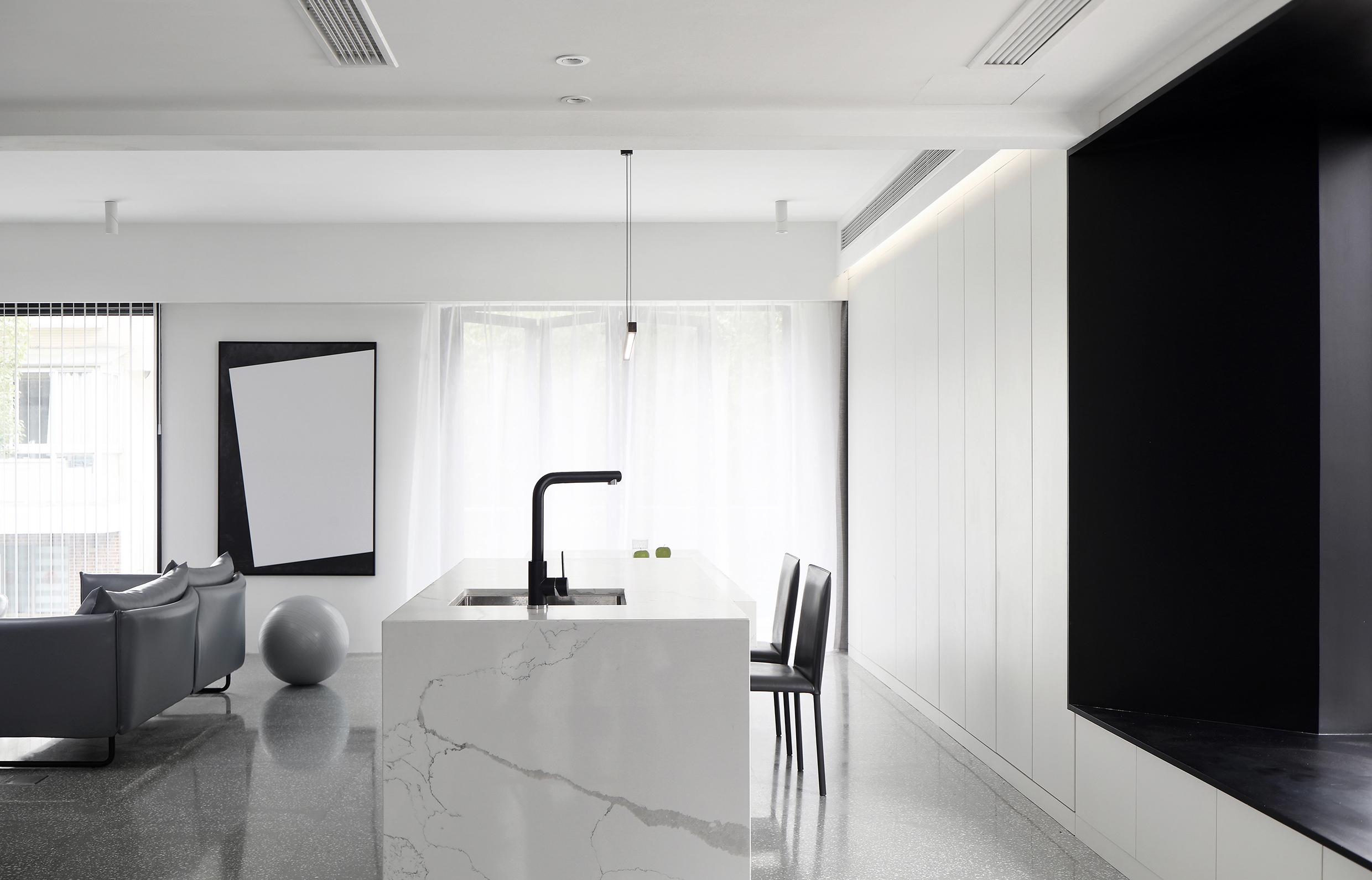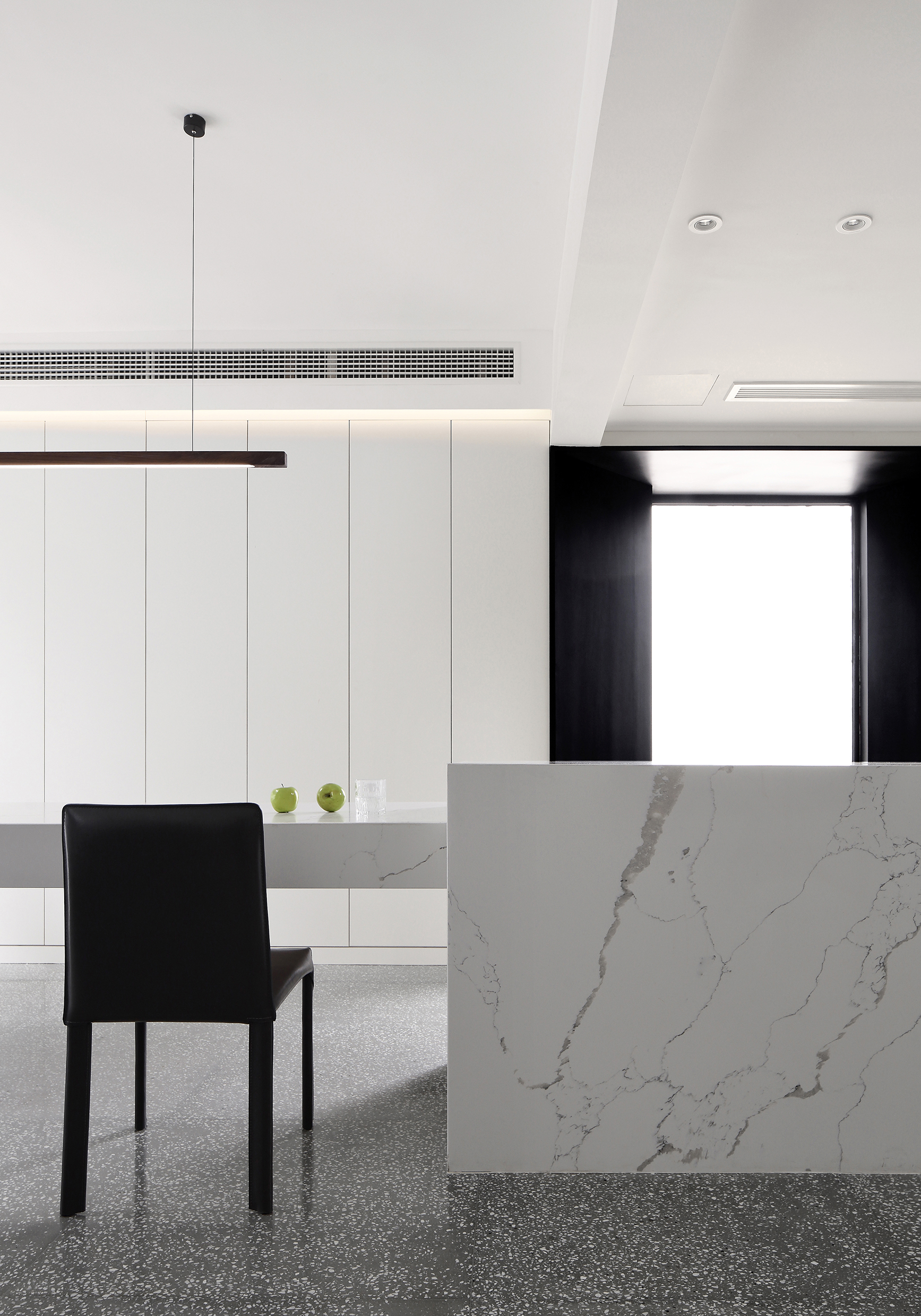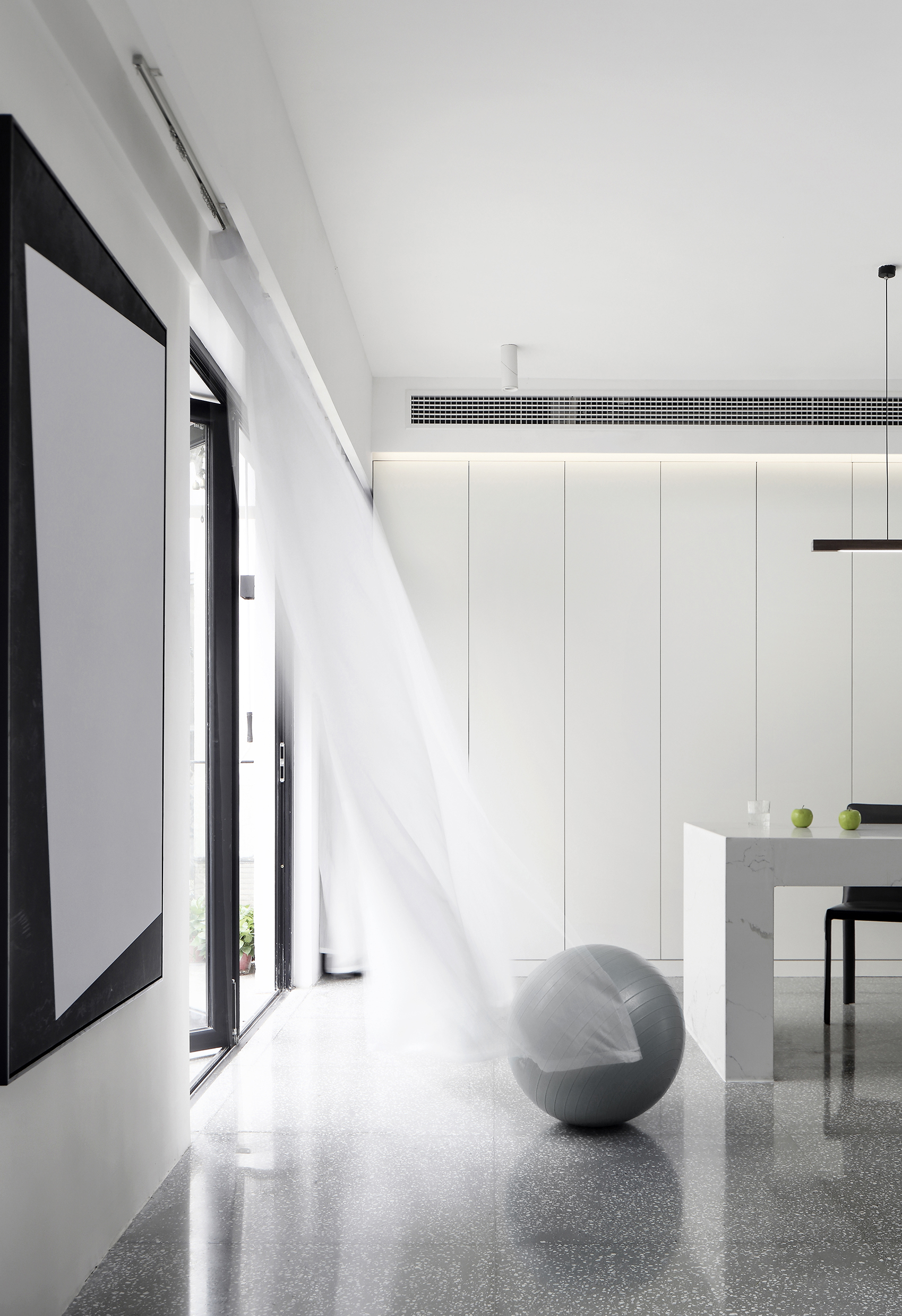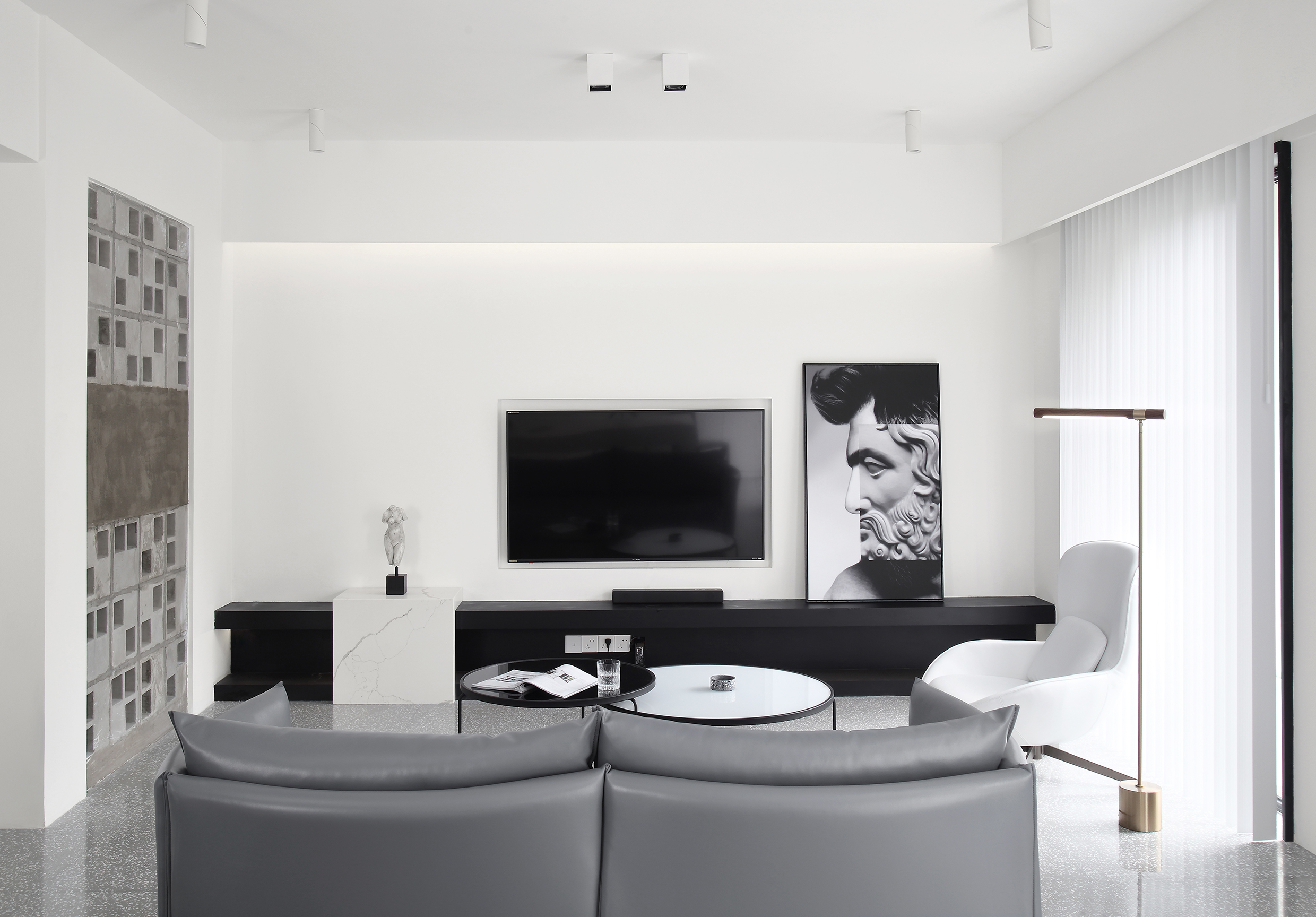 为了营造出通透大气的空间感受,我们将所有窗户改为落地窗。收起所有的色彩,整个空间里只留下光影与黑白。