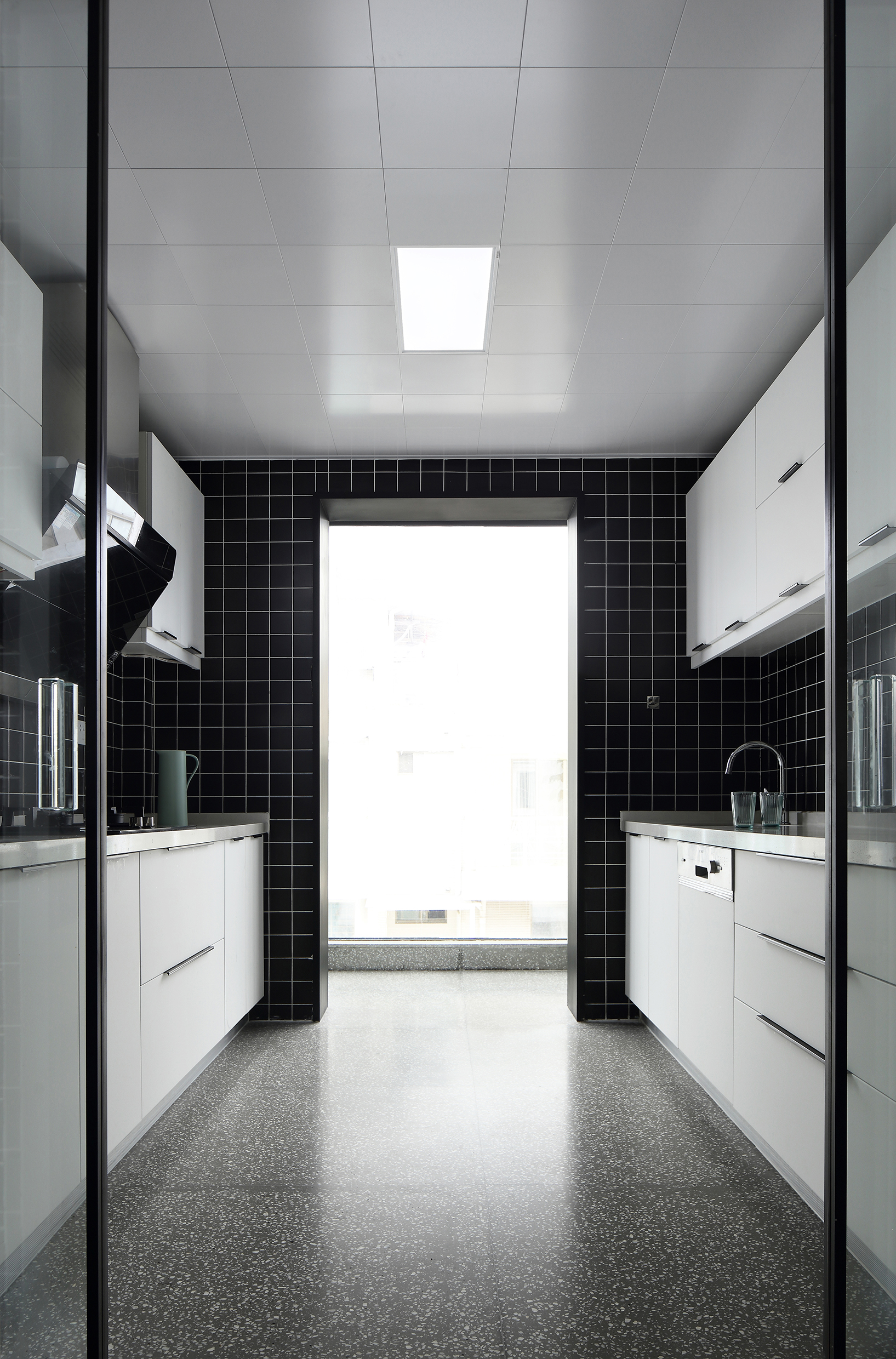 厨房区域采光优越,储物充足。黑框玻璃门可将自然光线引入客餐厅区域,令空间更加开敞明亮。