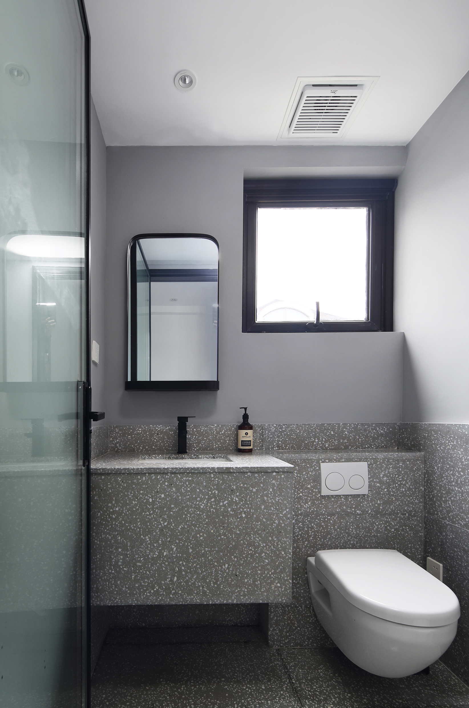 客卫洗手台面为预制的水磨石现场制作,与客厅地面以及楼梯选用了相同的材料,打造出整体性。