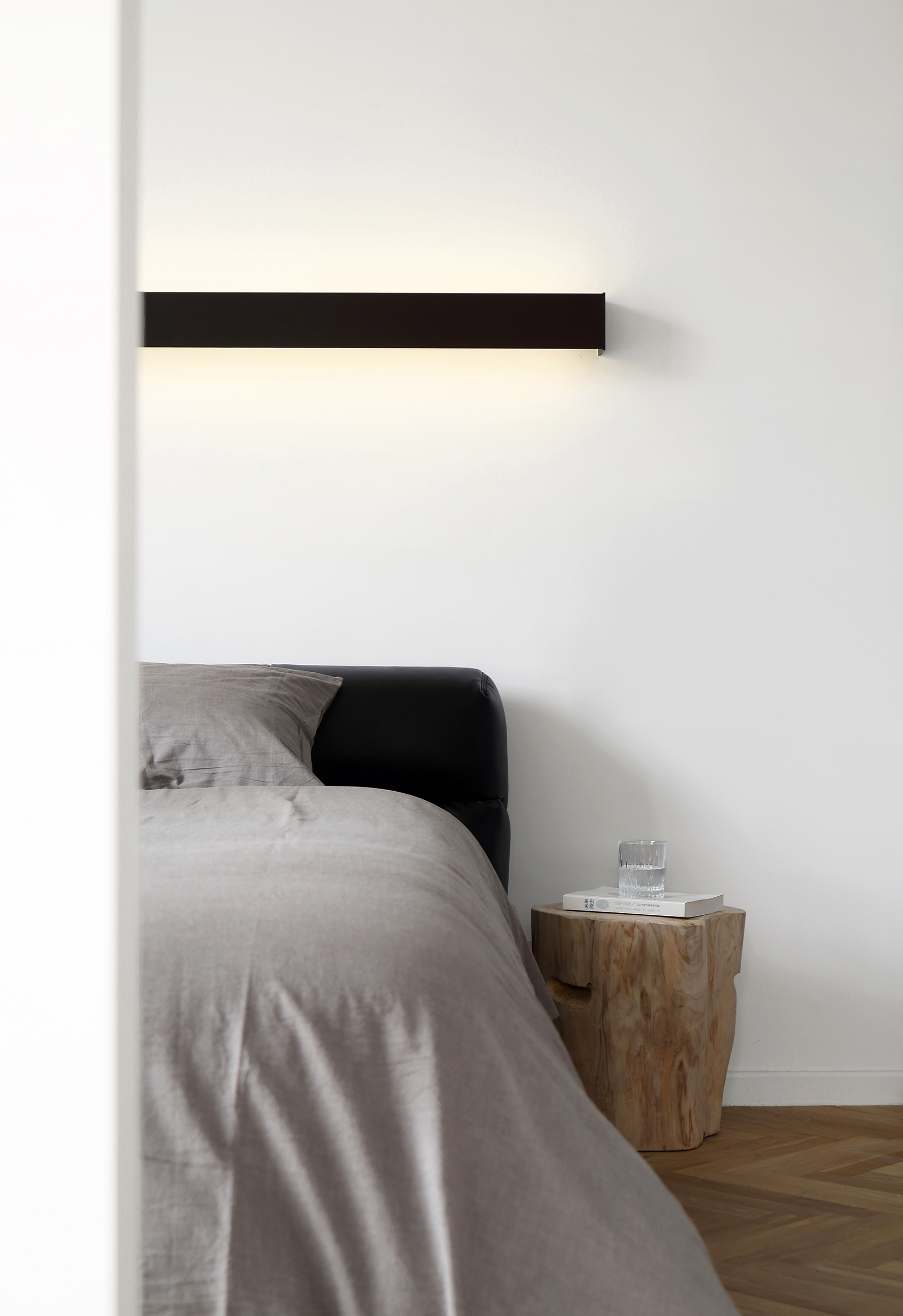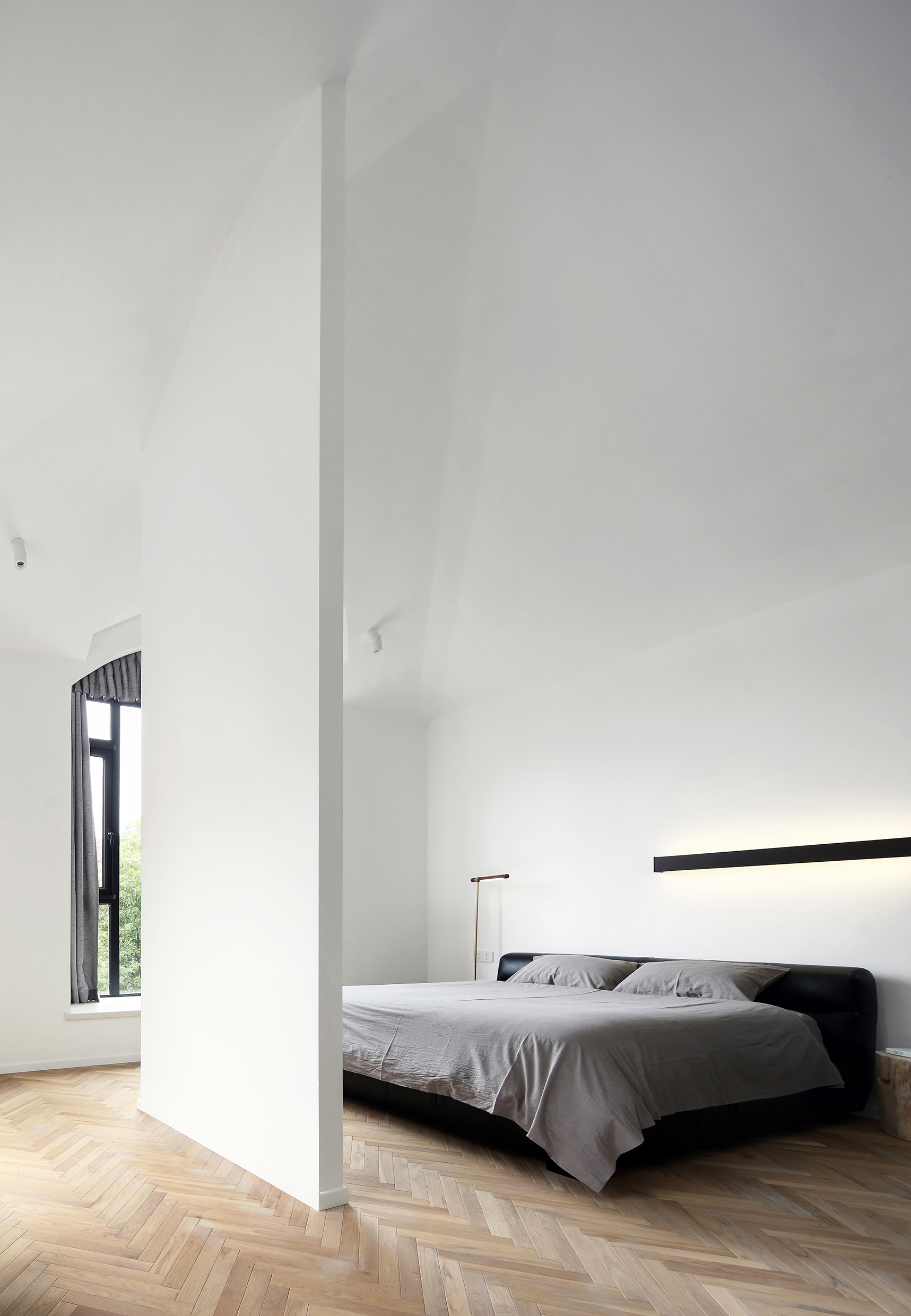 卧室面积很大,所以特意砌一堵墙作为隔断,同时也令空间更有趣。整个空间都没有做门套线和踢脚线,去掉传统室内设计的装饰性元素,打造出更加清晰的空间。