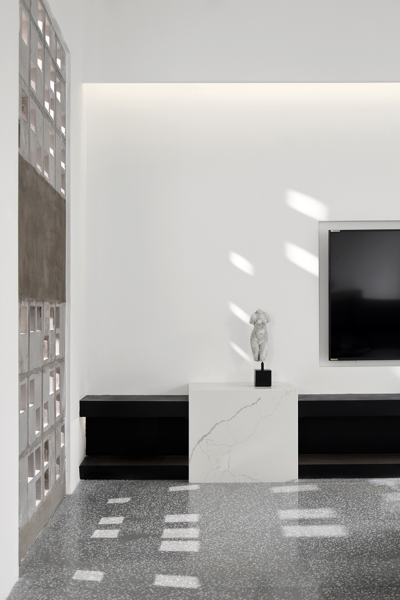 电视背景墙左侧墙体部分拆除,用混凝土自制的水泥孔砖替代,增加了整体空间的通透性,也起到装饰效果。电视柜为现场制作,白色的大理石台面消解了黑色的电视柜过长带来的单调感,亦是绝佳的陈列台。