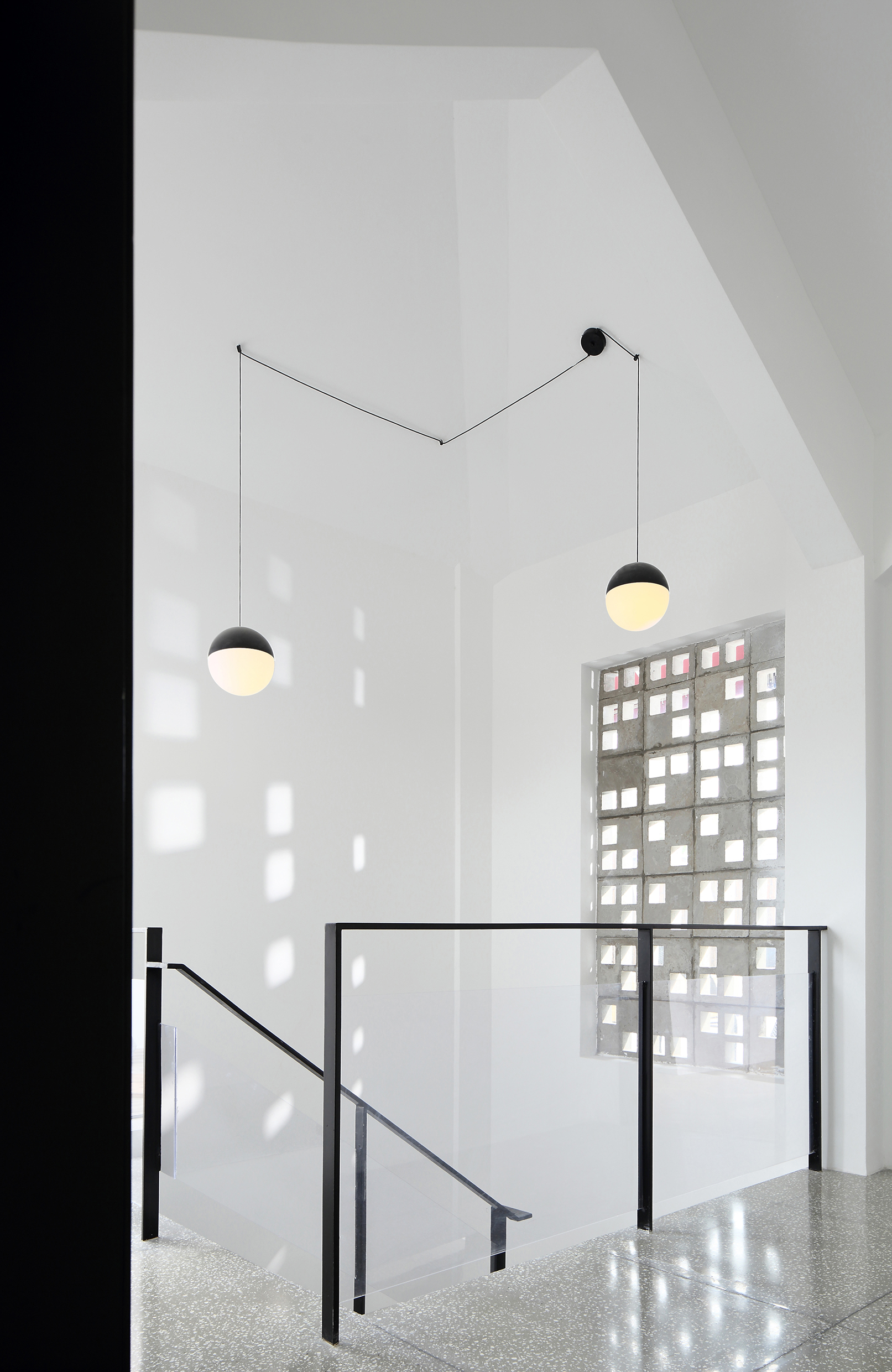 从二层望向一层的水泥孔砖墙,空间充满了光影的趣味性。