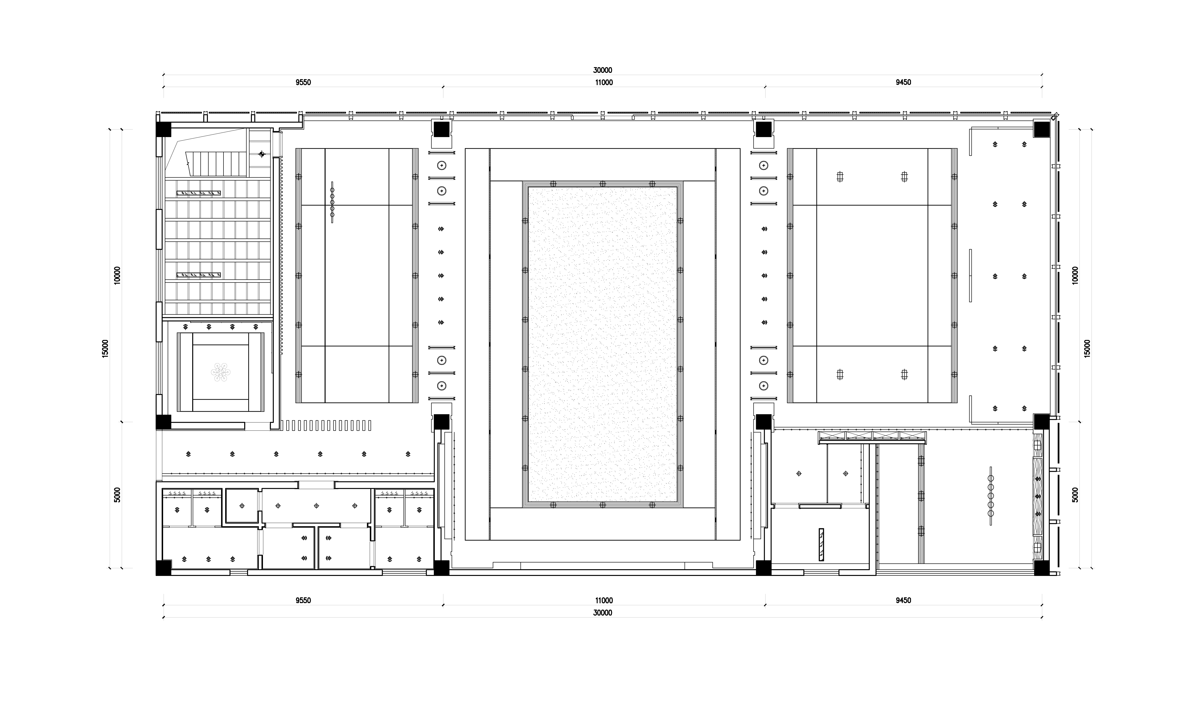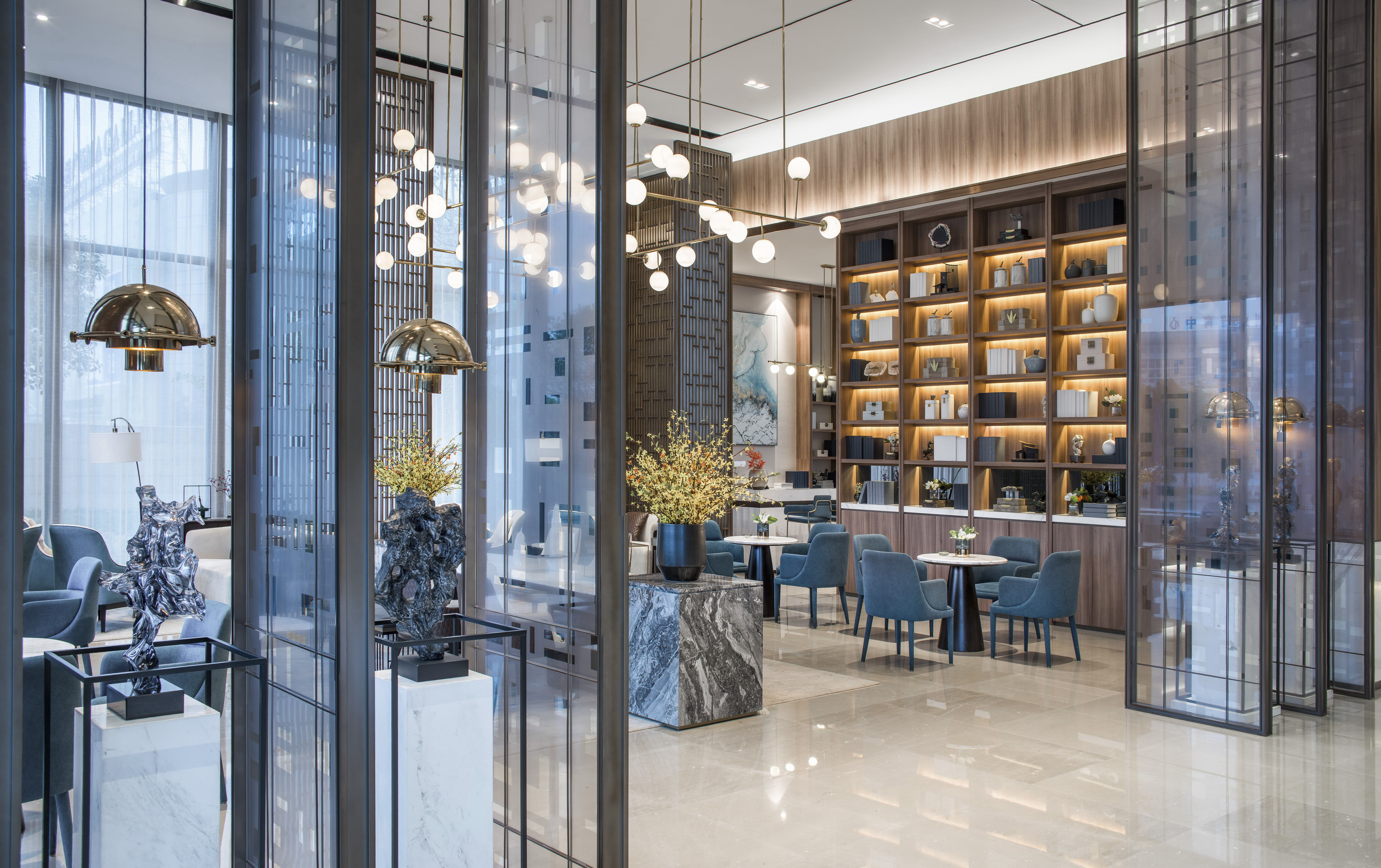 空间布局:本案从建筑设计开始着手,临街面用大面的玻璃幕墙彰显开放的态度,以达到足够的包容性,同时幕墙上端用纵向线条拉伸建筑的竖向高度。室内动线布置简洁明了,以营销展示区为中心点左右均衡布置,各功能区之间相互开放穿透,仅用屏风和装饰艺术品拉开空间层次,让购房者以轻松的体验达到售楼部的营销目的。