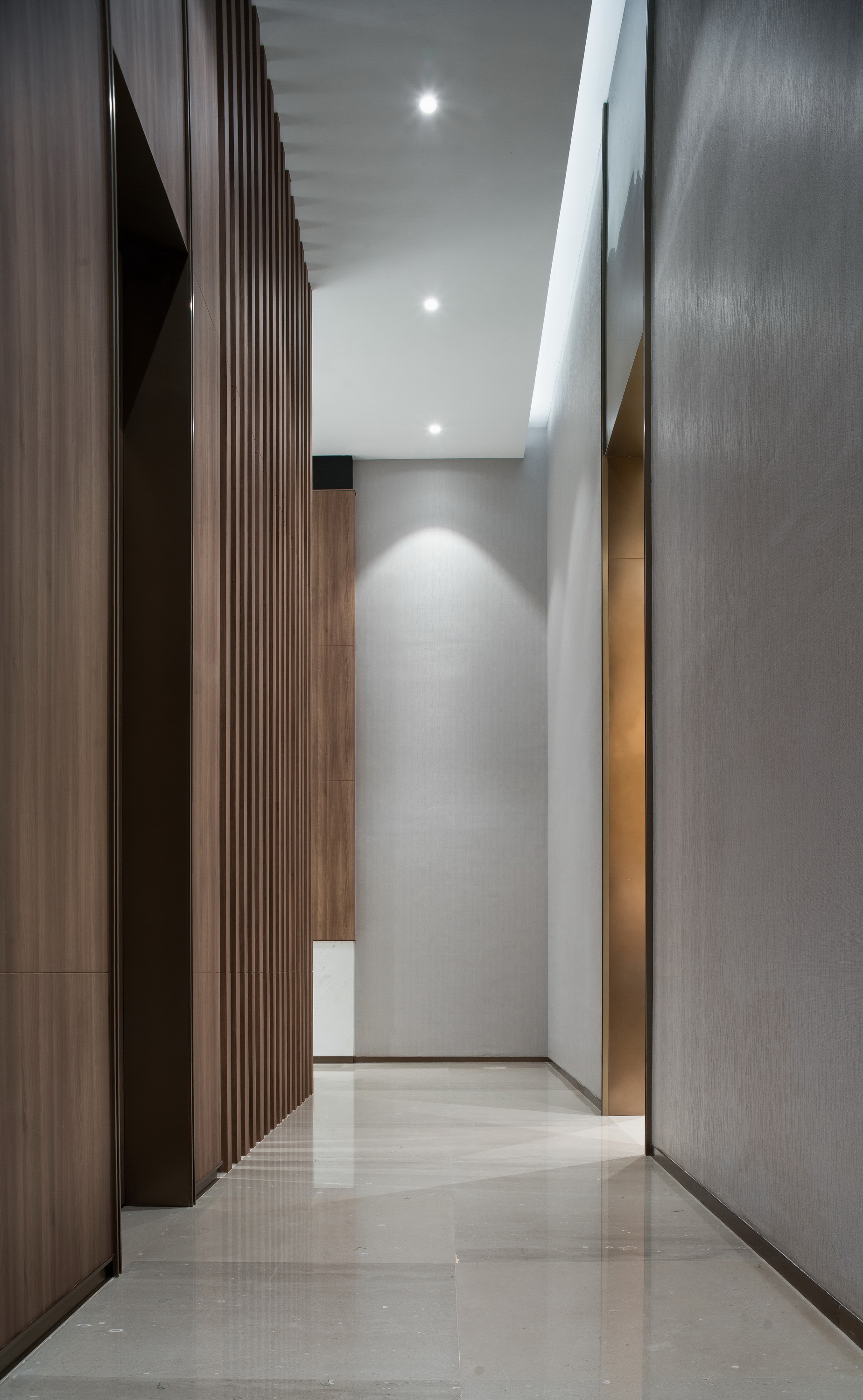 设计选材:地面用水泥灰色灰姑娘大理石整铺,墙面主要以木饰面为主,增强空间自然感以拉近跟体验者的距离,局部用不锈钢、白色石材以及皮质硬包体现都市感,重点背景用蓝色真丝墙布,用金箔影射“铜”的抽象图案,以符合项目所处铜都的在地性。金色代表大地沟壑,蓝色代表天空,整体空间现代时尚却又不失温度。