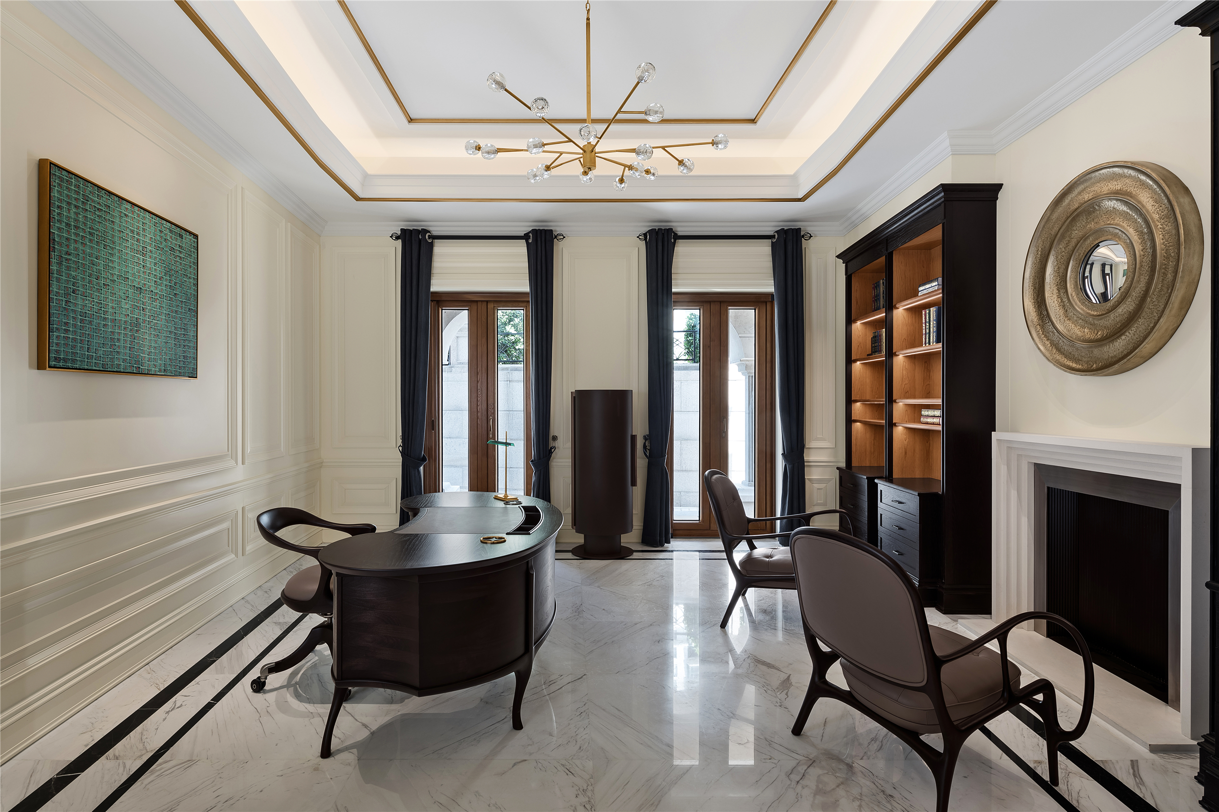 主背景墙壁炉上方的剔透镜面,反射出璀璨的Baxter吊灯以及对称的拱形造型,于虚实之间形成反复咏叹。大理石地面拼贴色调素雅,一方圆形地毯营造出场景效果,与对称布排、颇具秩序感的家私完美融合,选用的Ba -