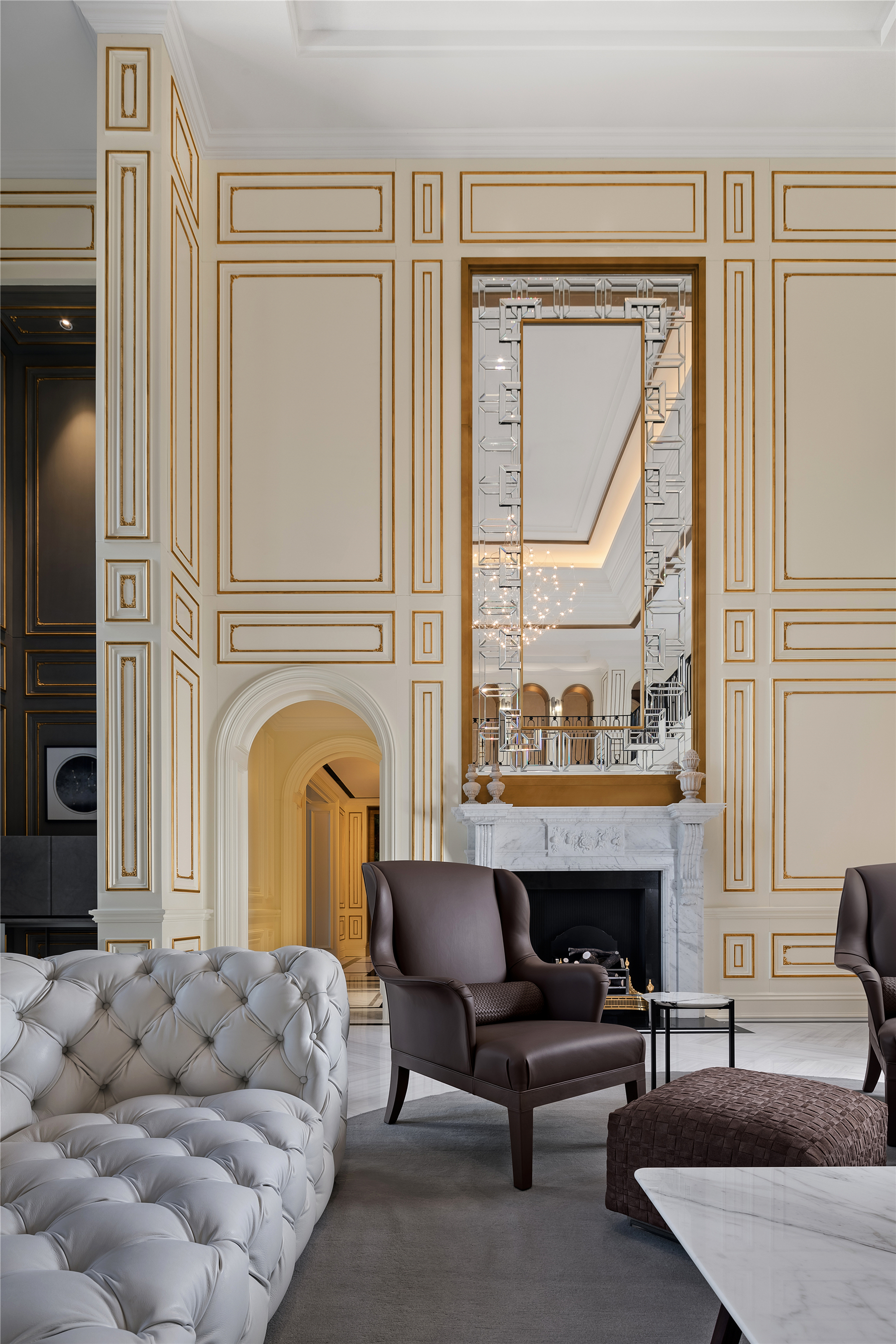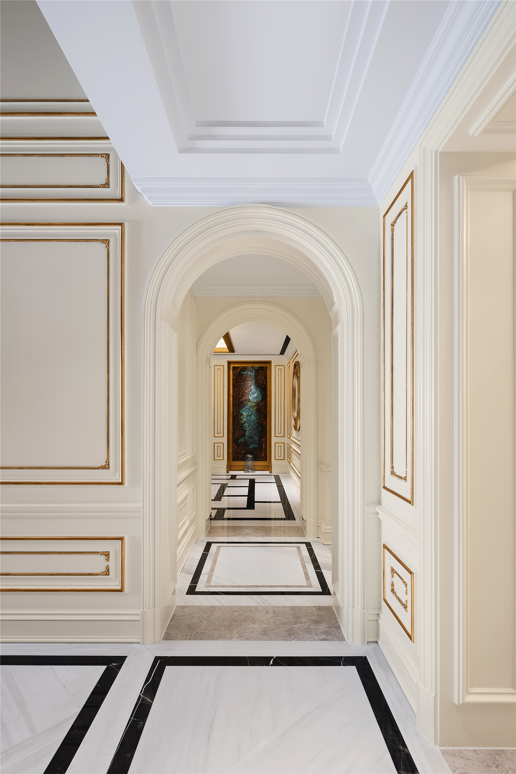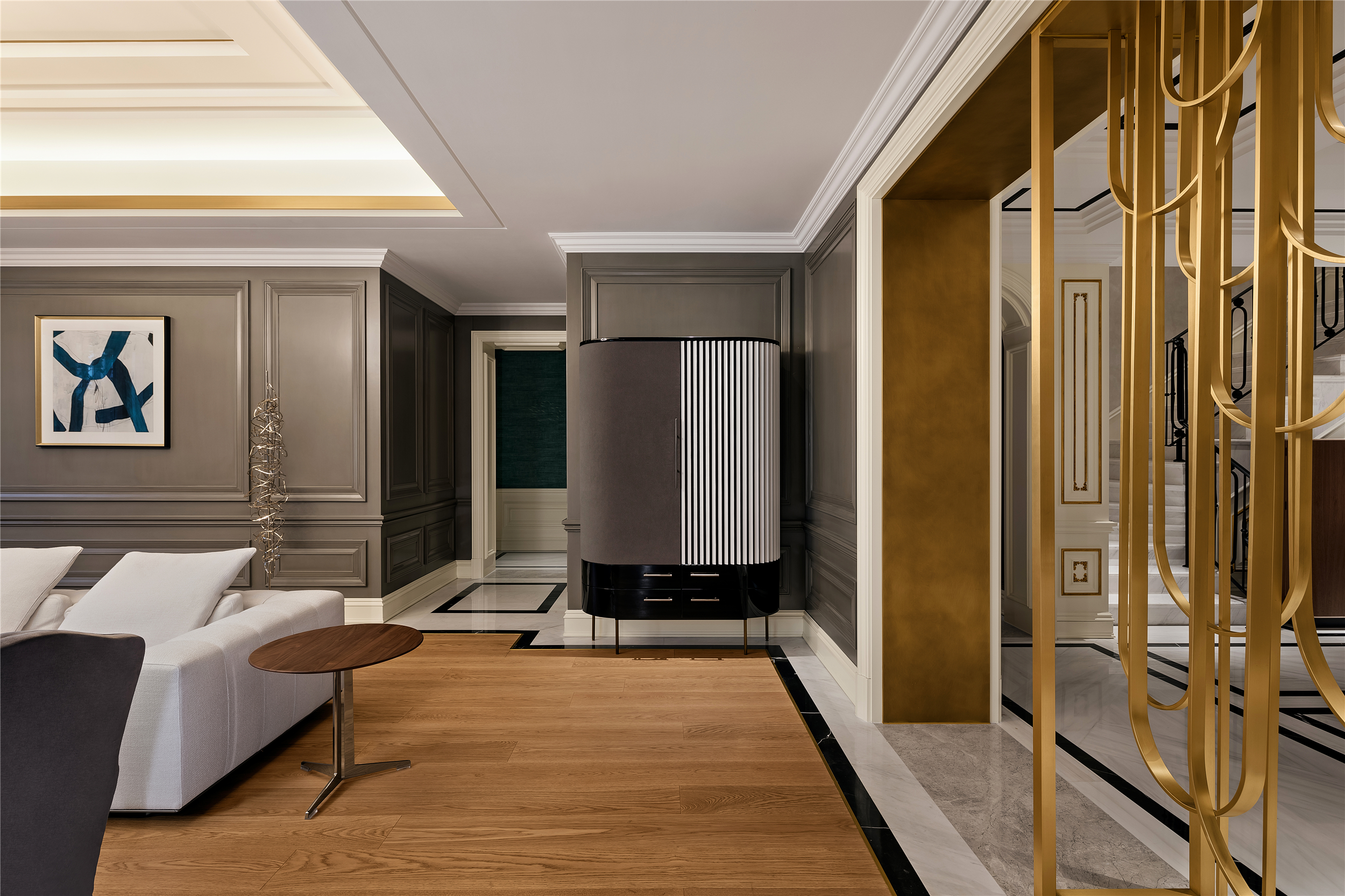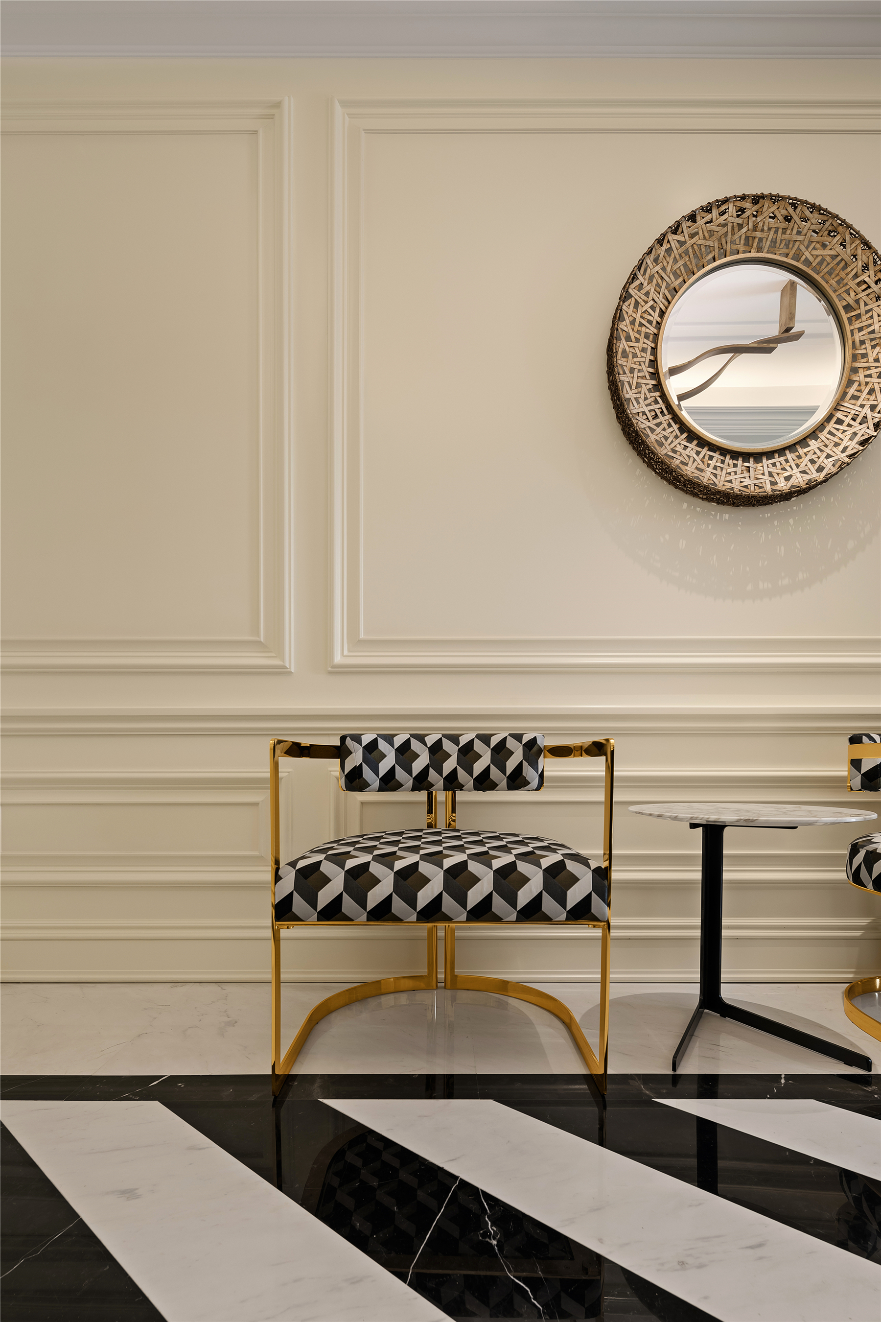 空间意境:大宅定义为法式风情,这是基于业主与设计团队对于美的共识。当时尚融入家居美学,将变幻出瑰丽而美妙的篇章。进入门厅,首先映入眼帘的是FENDI CASA的BRIGITTE系列休闲椅,3D立体效果面料彰显出未来感,也呼应了大宅致敬经典西方美学的调性。客厅挑高,布局对称,护墙板上金色镶边,以线条美学彰显贵族气质。