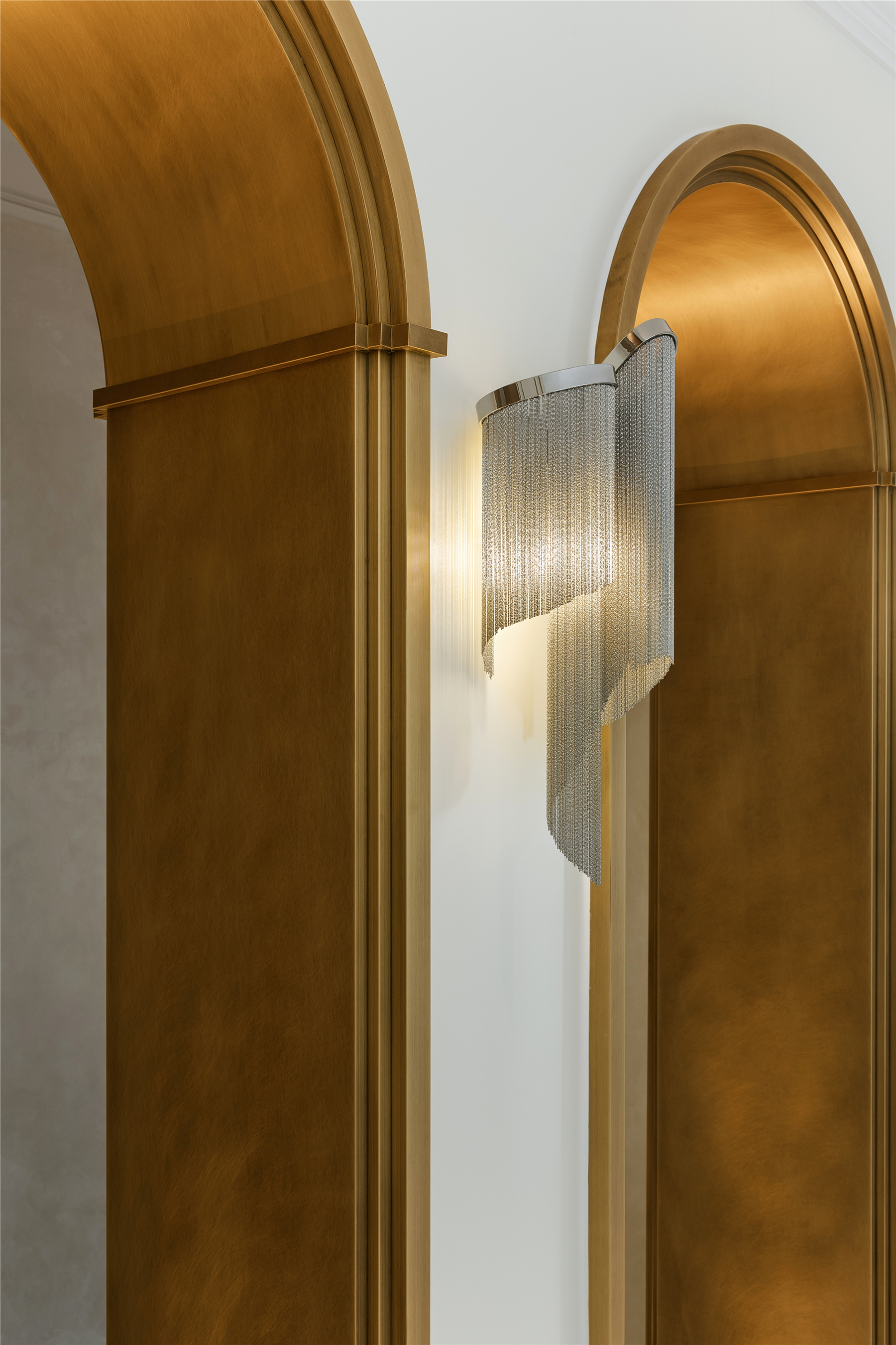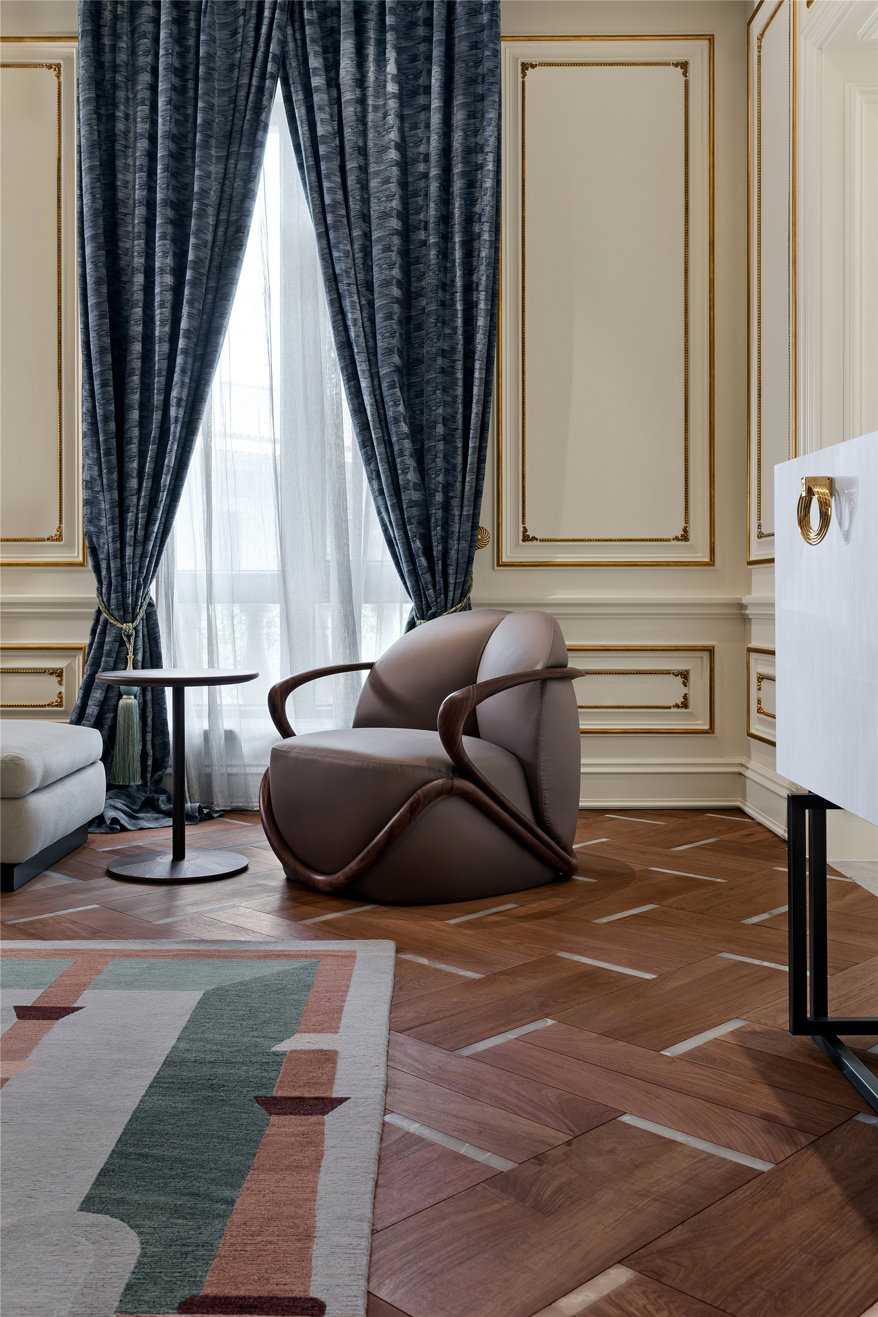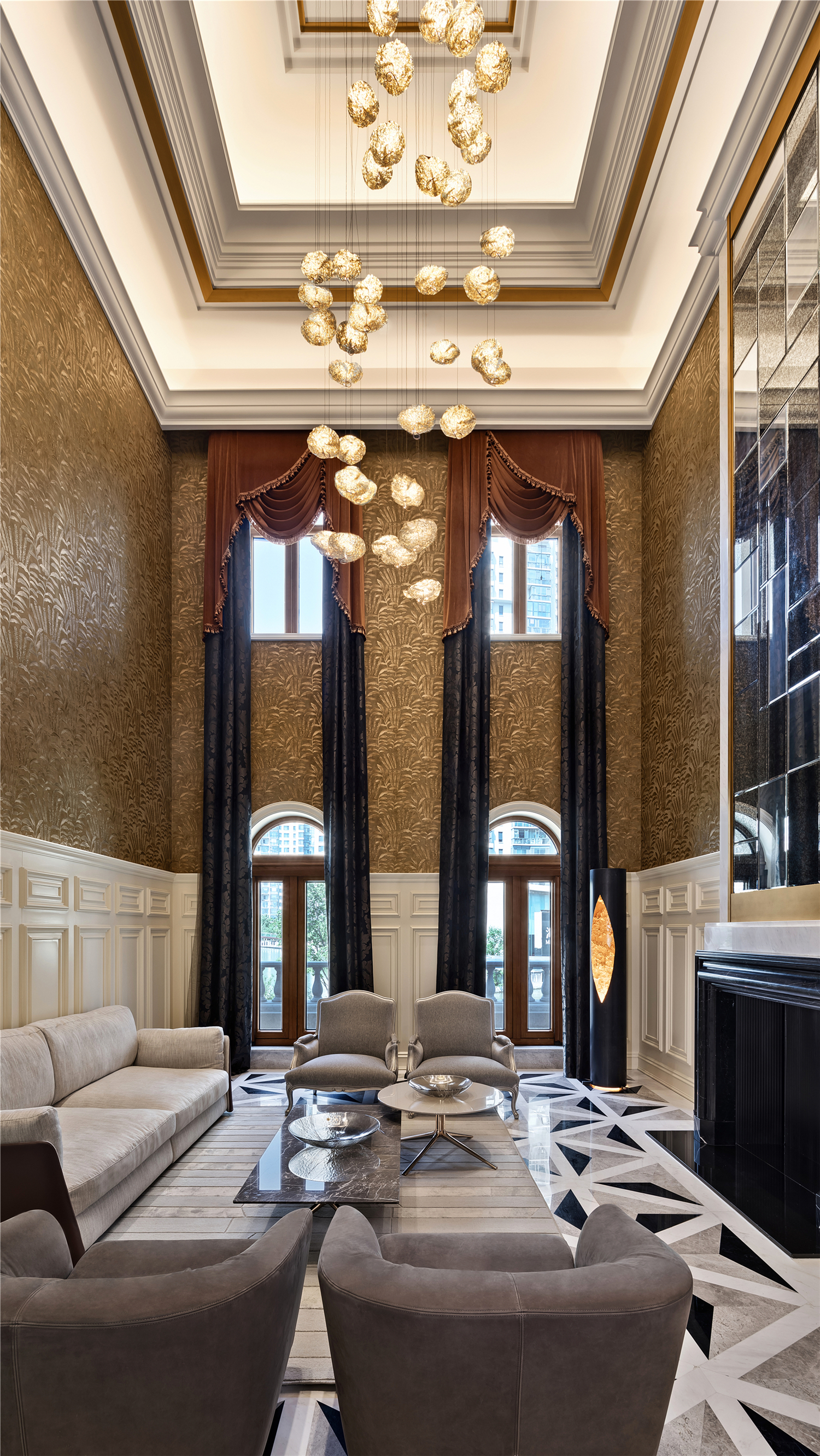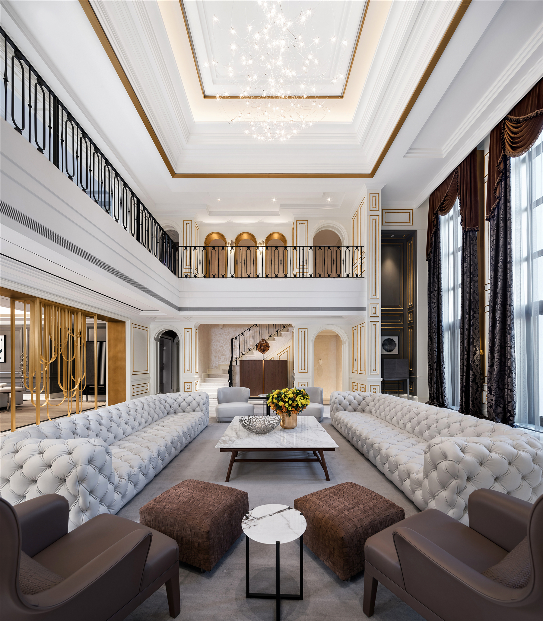 空间意境:大宅定义为法式风情,这是基于业主与设计团队对于美的共识。当时尚融入家居美学,将变幻出瑰丽而美妙的篇章。进入门厅,首先映入眼帘的是FENDI CASA的BRIGITTE系列休闲椅,3D立体效果面料彰显出未来感,也呼应了大宅致敬经典西方美学的调性。客厅挑高,布局对称,护墙板上金色镶边,以线条美学彰显贵族气质。