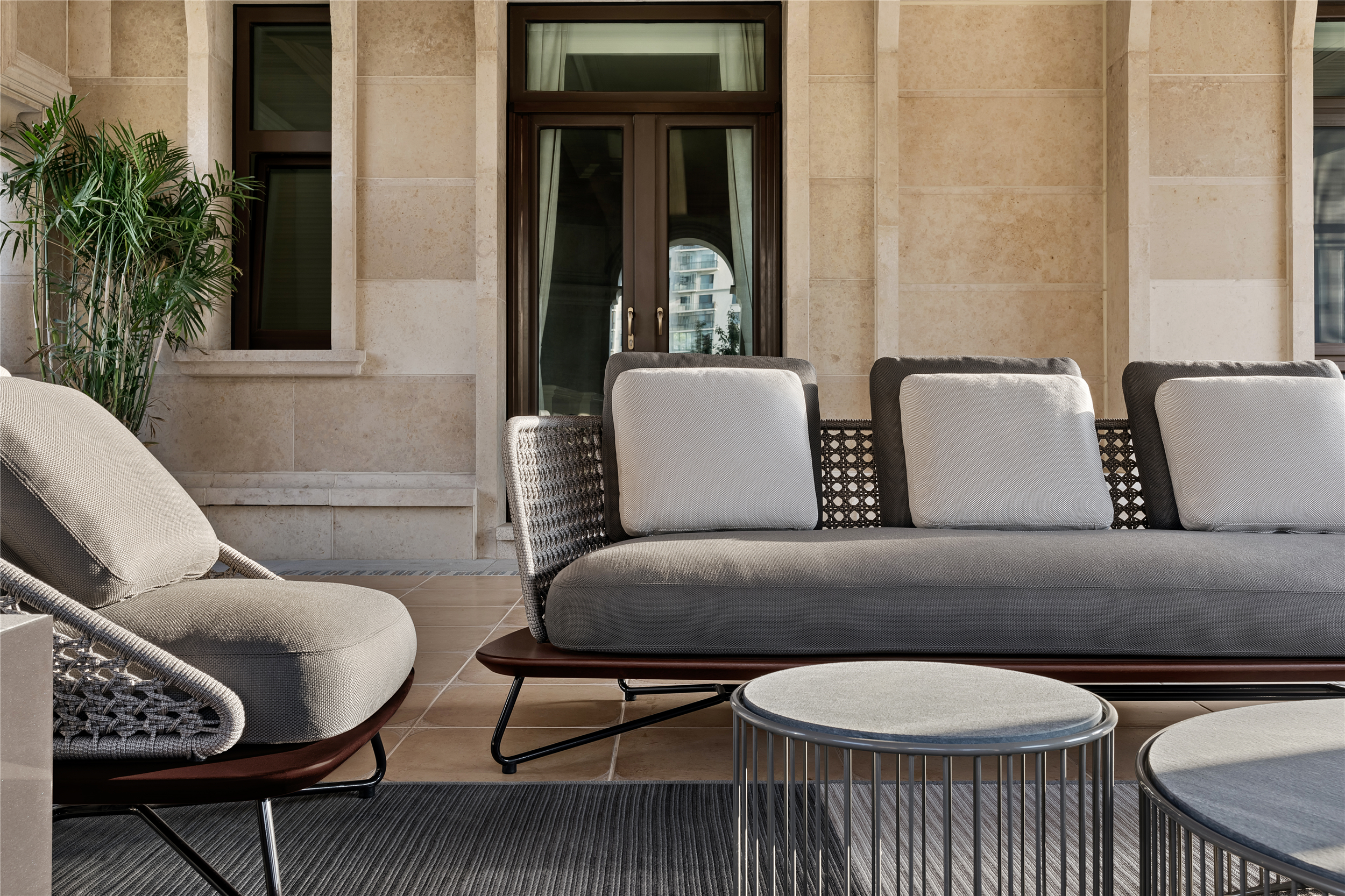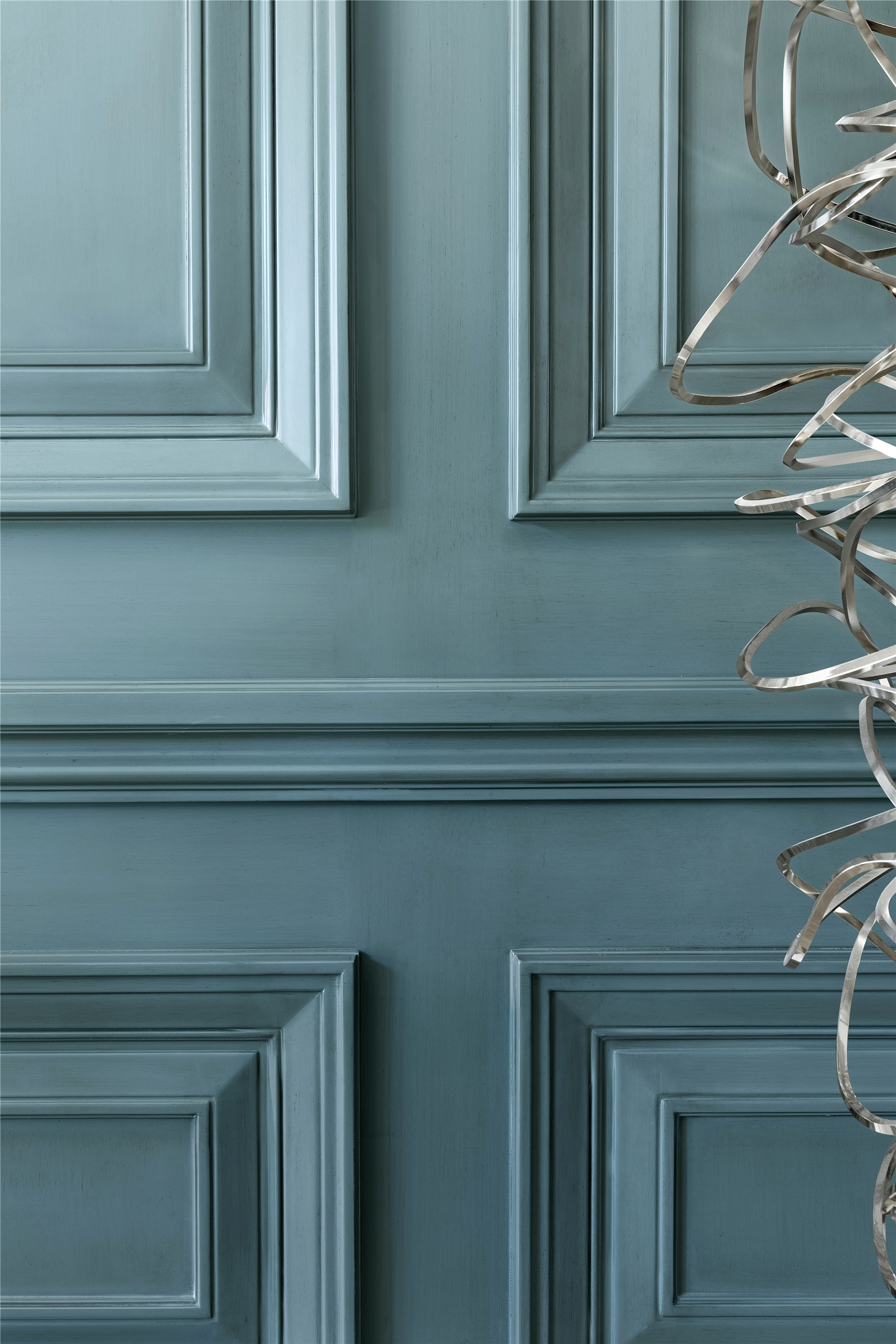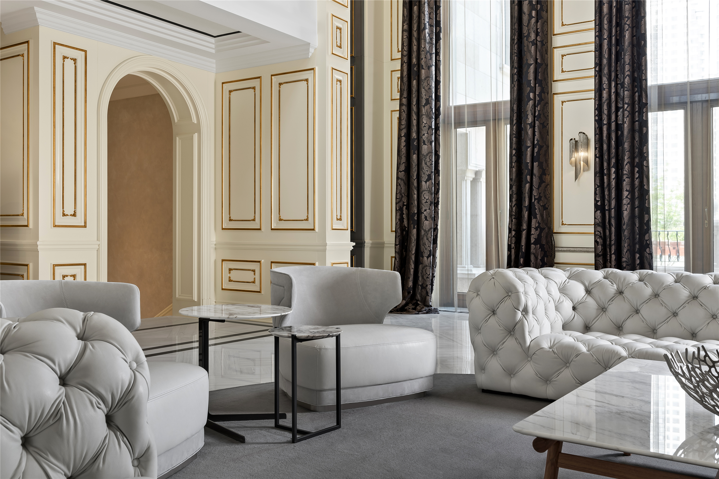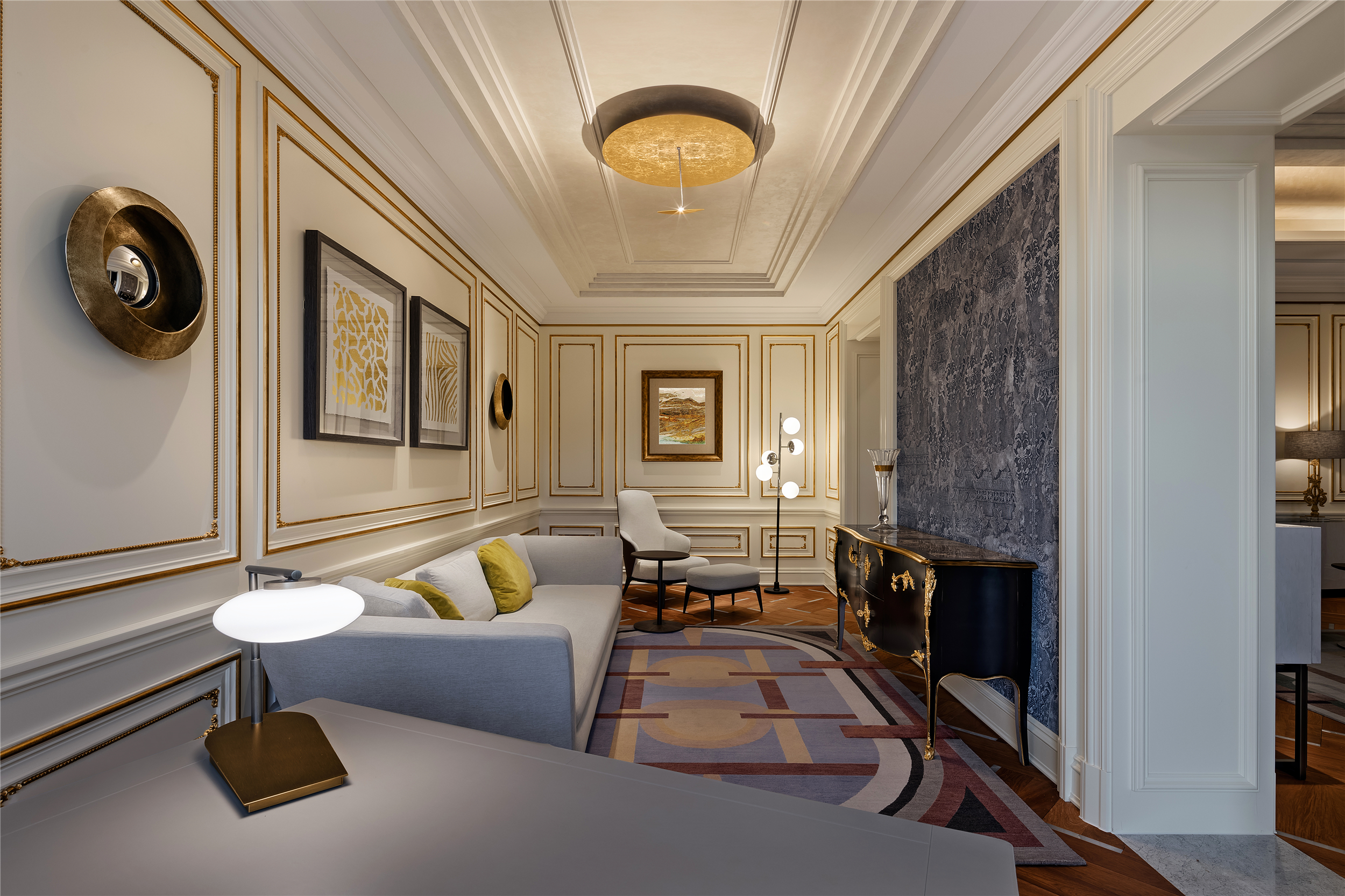 空间意境:大宅定义为法式风情,这是基于业主与设计团队对于美的共识。当时尚融入家居美学,将变幻出瑰丽而美妙的篇章。进入门厅,首先映入眼帘的是FENDI CASA的BRIGITTE系列休闲椅,3D立体效果面料彰显出未来感,也呼应了大宅致敬经典西方美学的调性。客厅挑高,布局对称,护墙板上金色镶边,以线条美学彰显贵族气质。