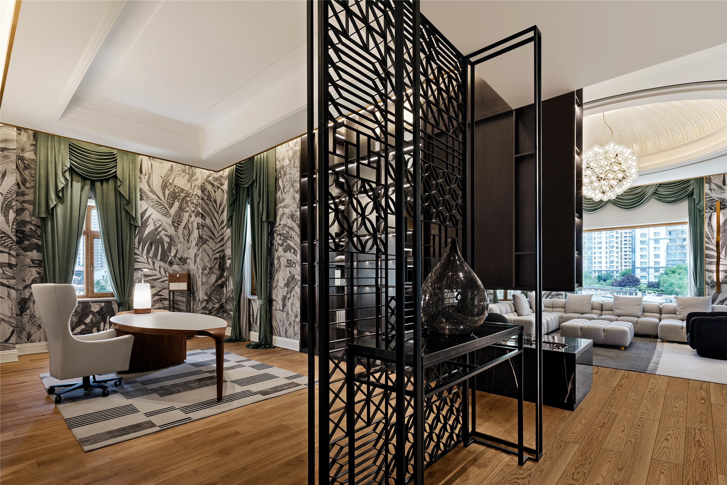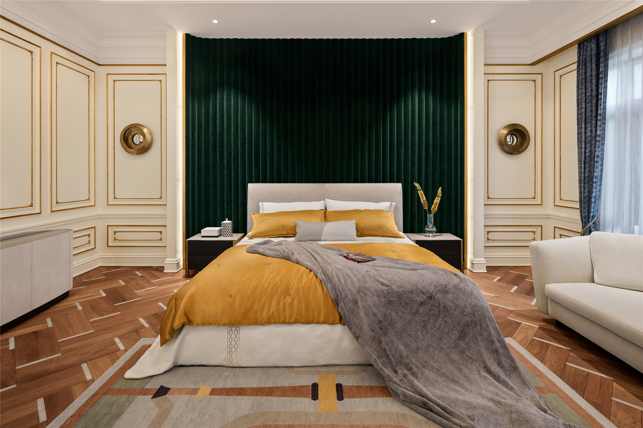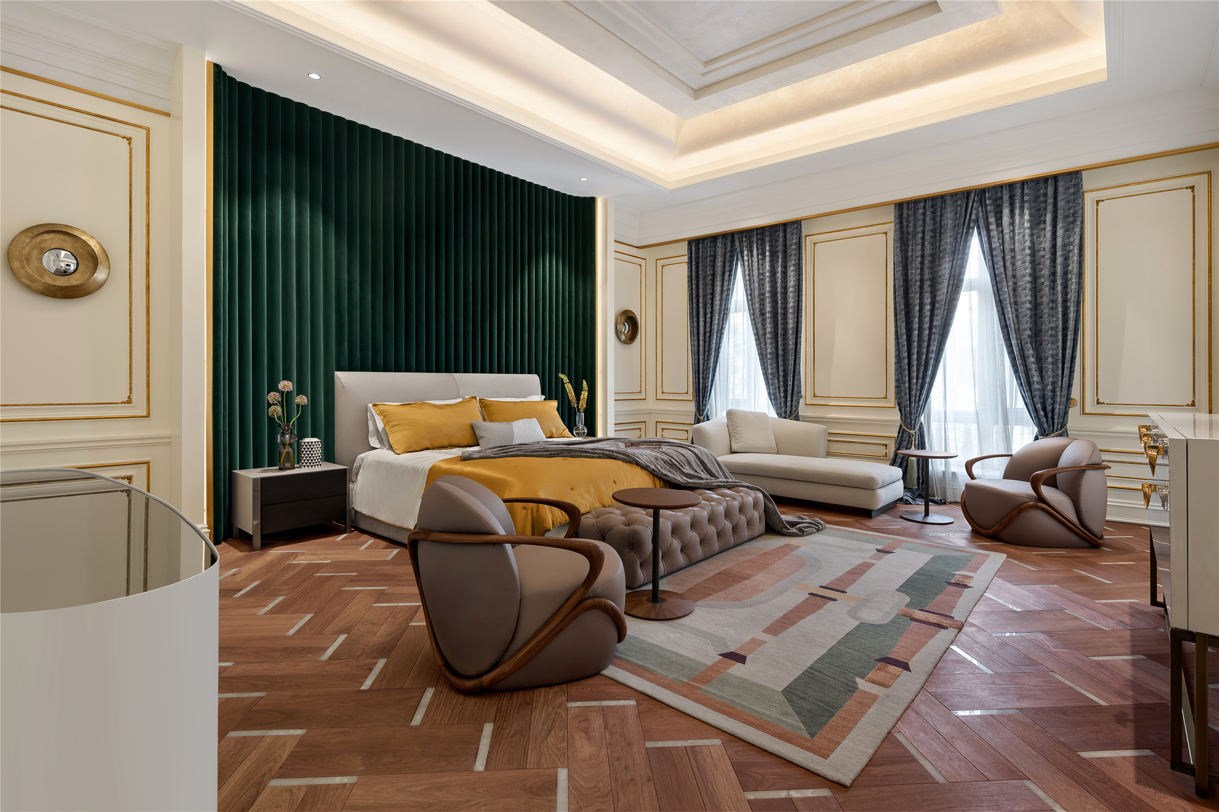 静谧的二层空间囊括了主卧套房、女儿房、起居室及书房。主卧套房秉承对称美学的营造法则,墨绿色天鹅绒床头背墙,以材料肌理传递出宫廷般的奢华感。HUG沙发椅是Giorgetti演绎曲线之美的经典代表作,无限循环的曲线酷似暖暖的环手拥抱,温馨且能令人心绪安宁。