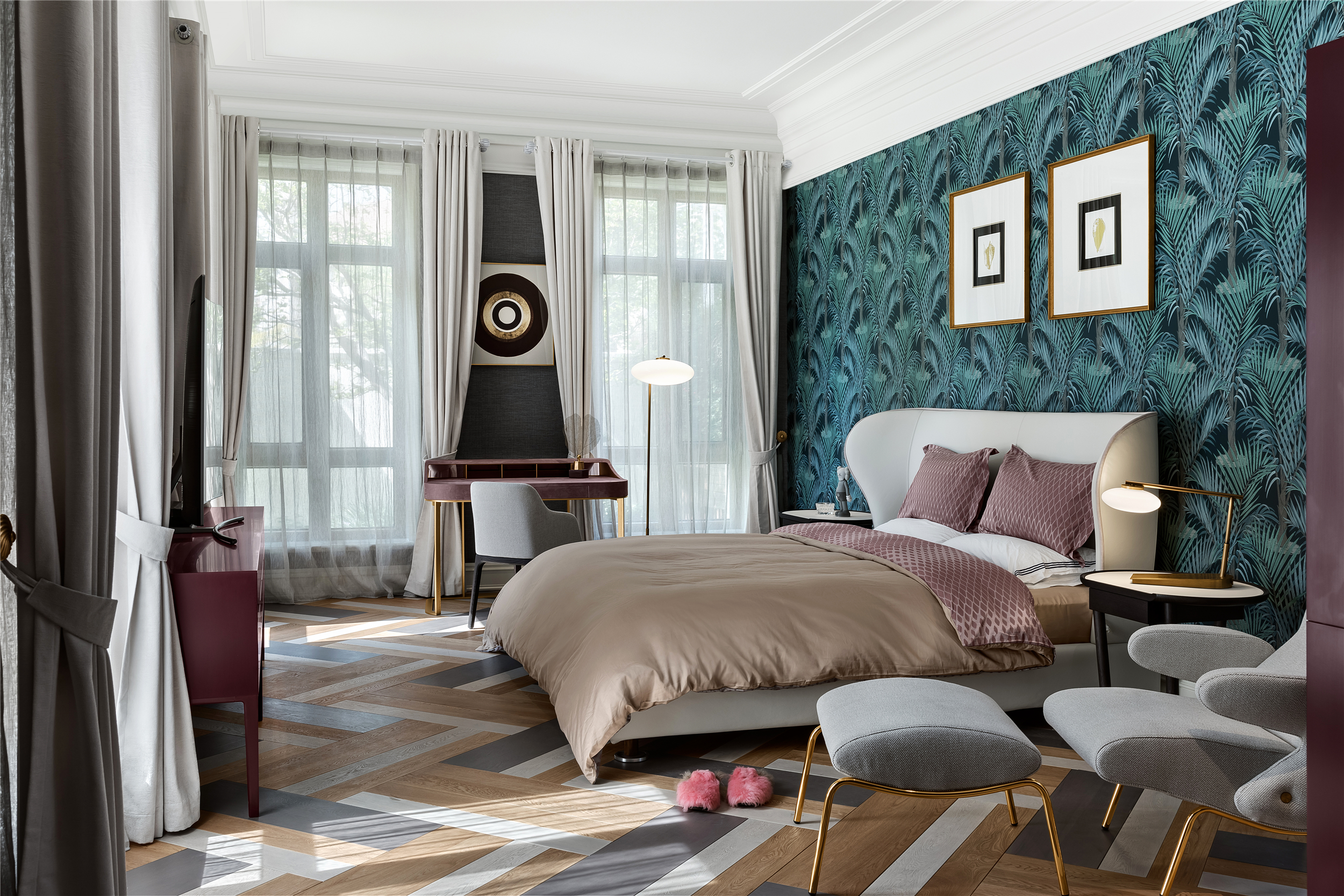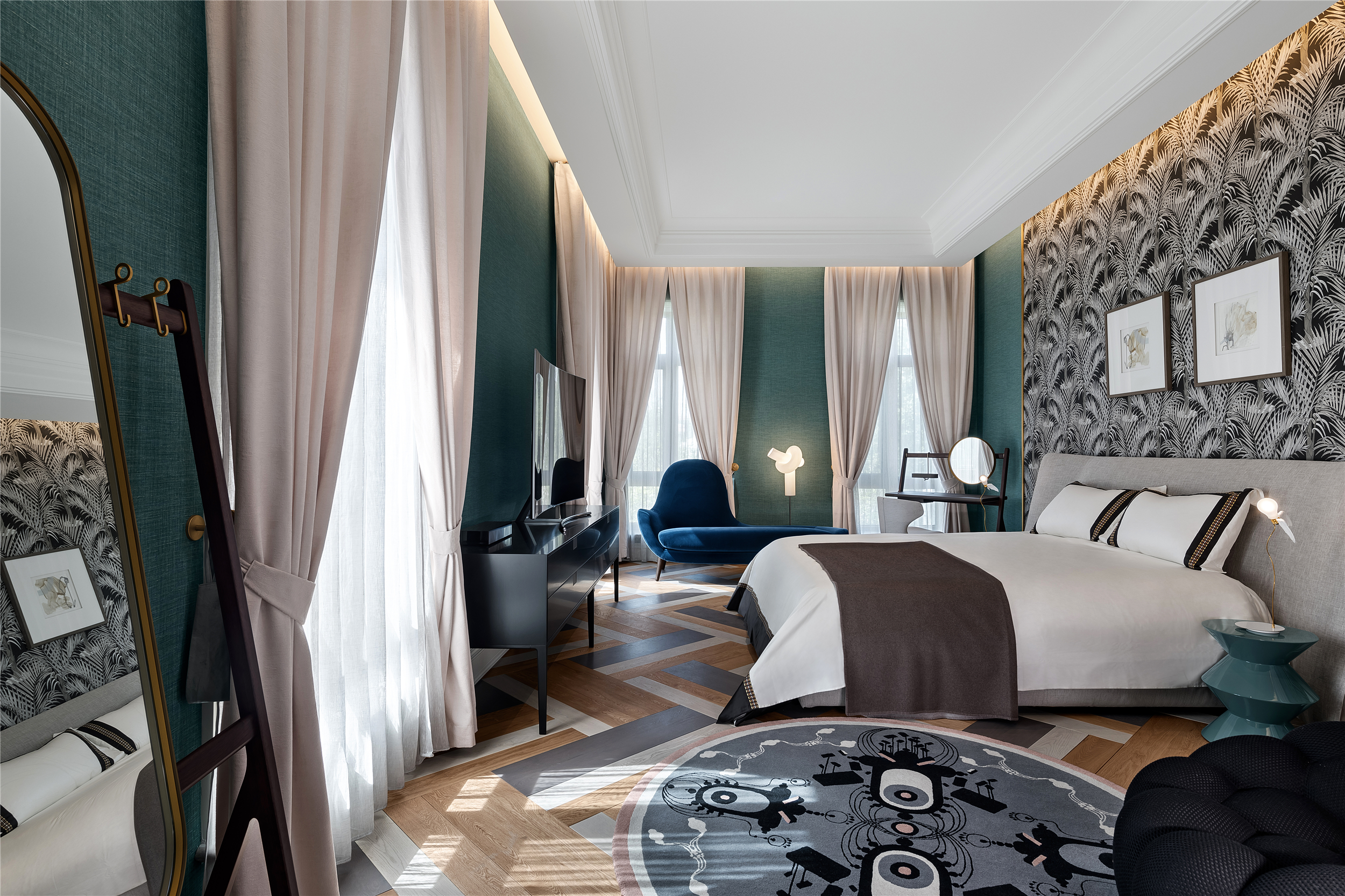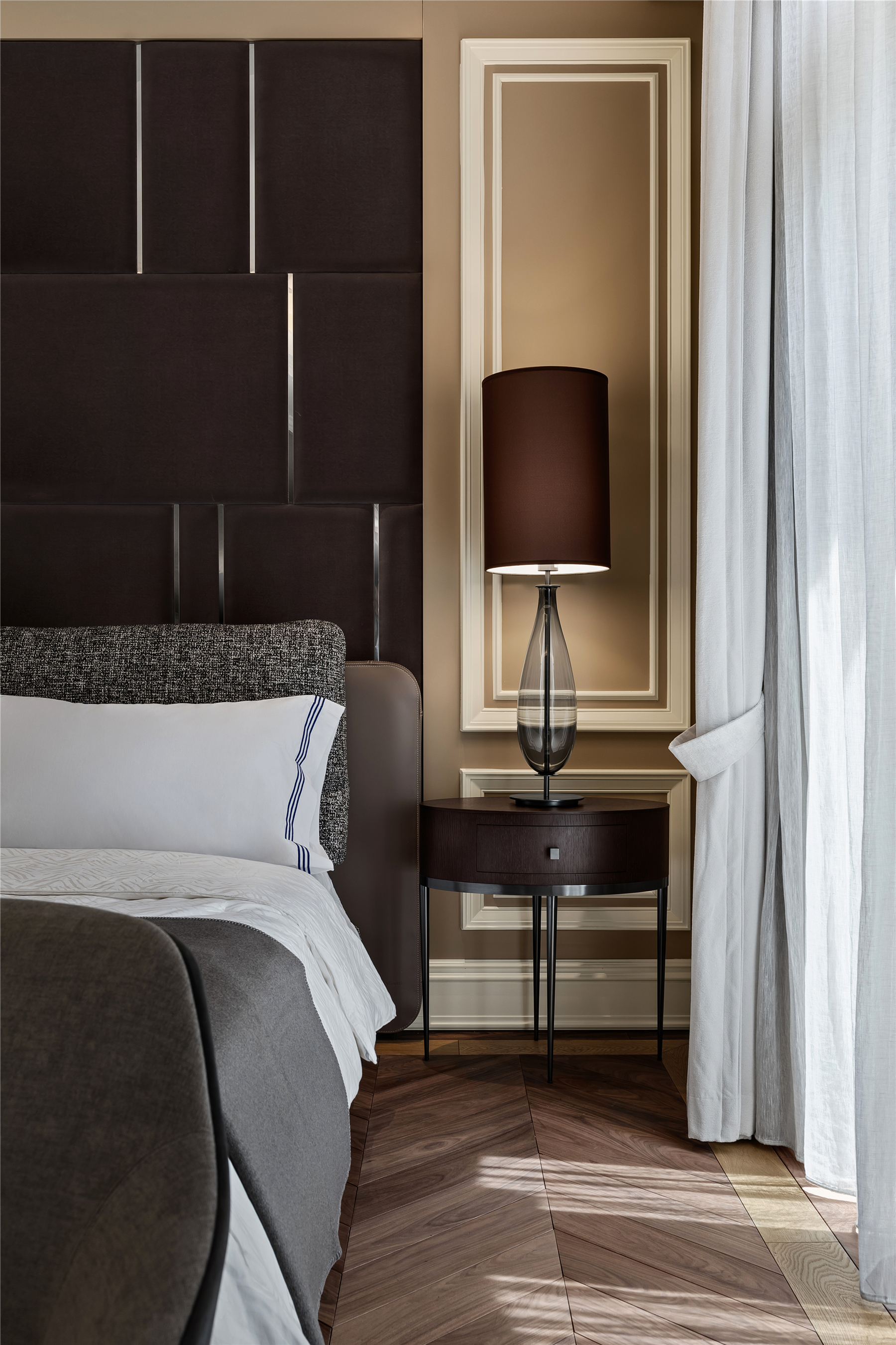 静谧的二层空间囊括了主卧套房、女儿房、起居室及书房。主卧套房秉承对称美学的营造法则,墨绿色天鹅绒床头背墙,以材料肌理传递出宫廷般的奢华感。HUG沙发椅是Giorgetti演绎曲线之美的经典代表作,无限循环的曲线酷似暖暖的环手拥抱,温馨且能令人心绪安宁。