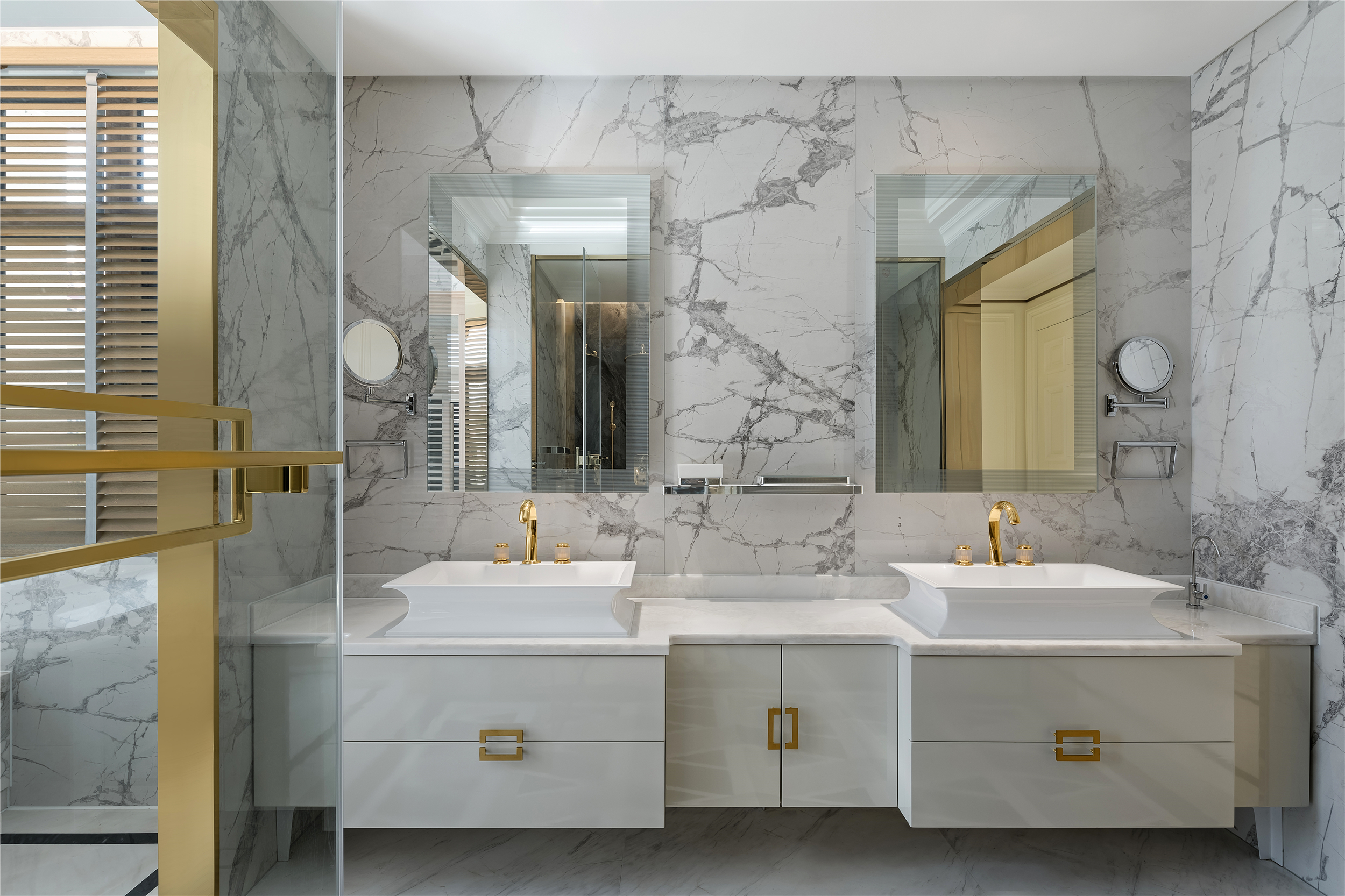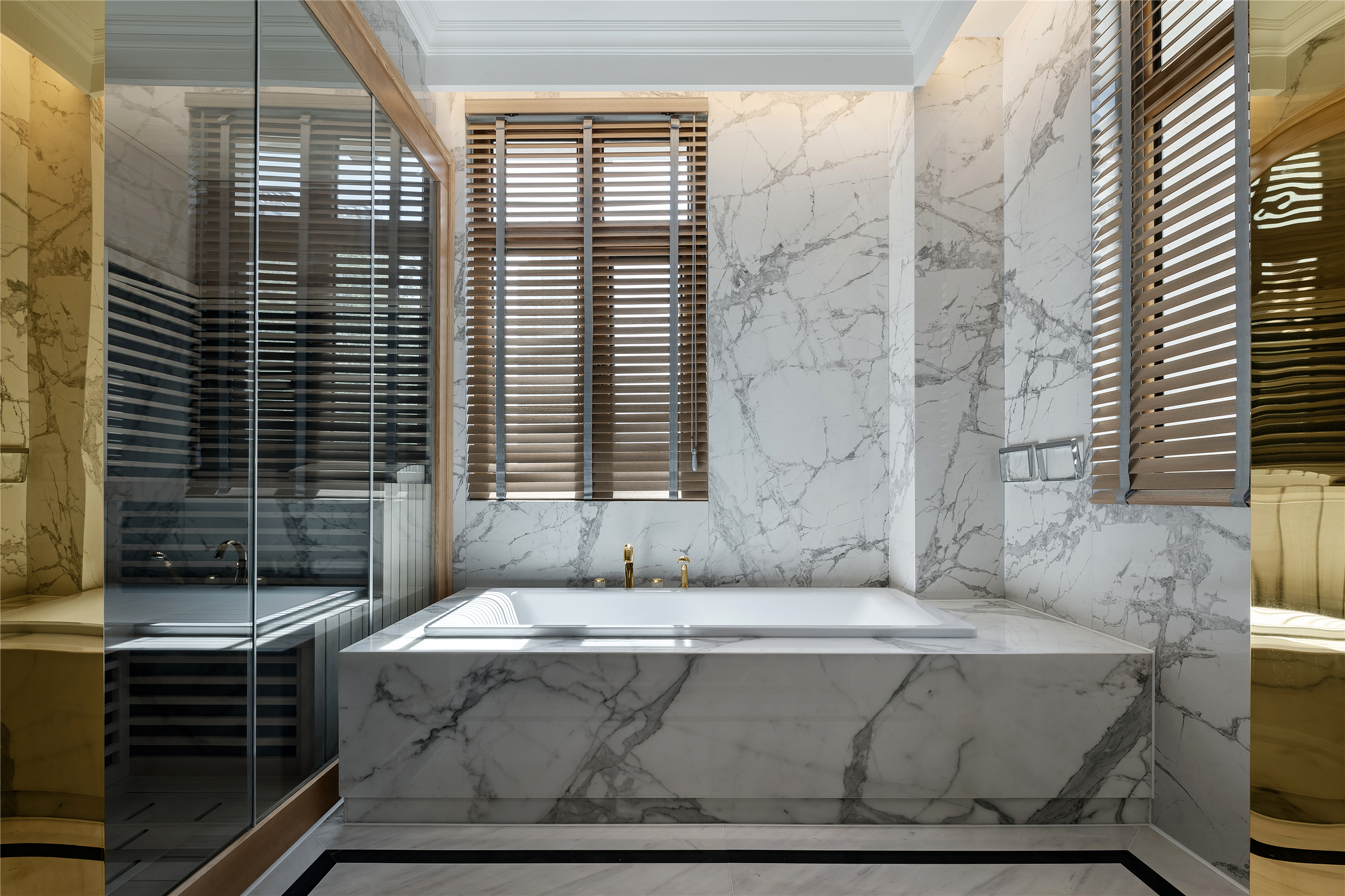 主卧卫浴间的卡拉拉白大理石,灰白相间的纹路,颇具水墨晕染之美。设计团队亲临意大利矿山选材,即是希冀以石材在时间上的凝结寓意大宅家族精神的永续传承。 -