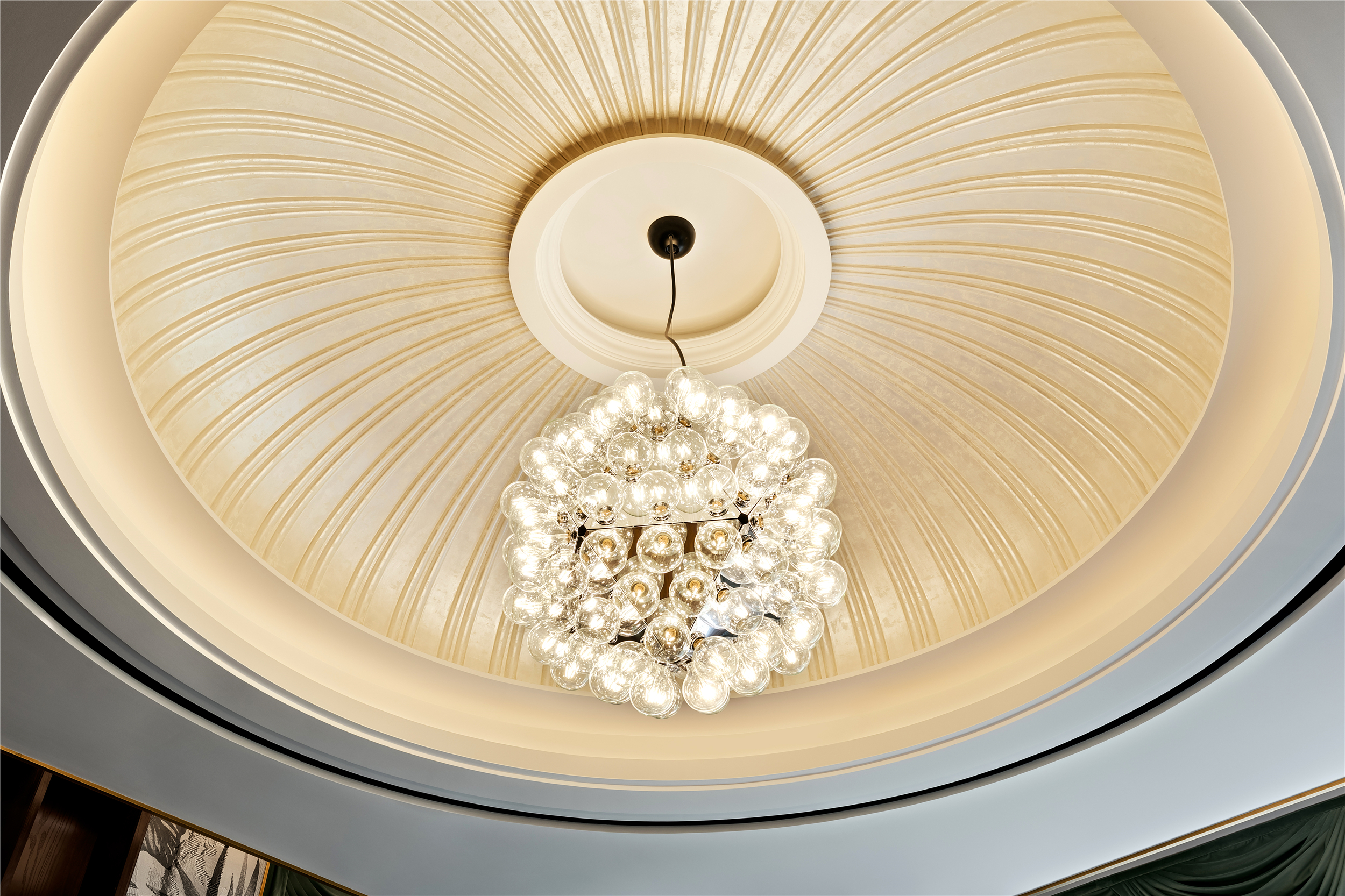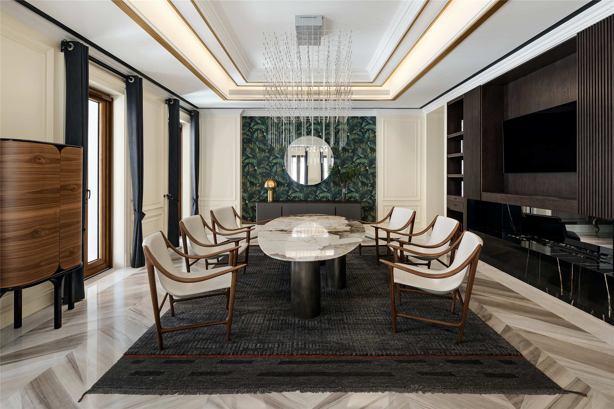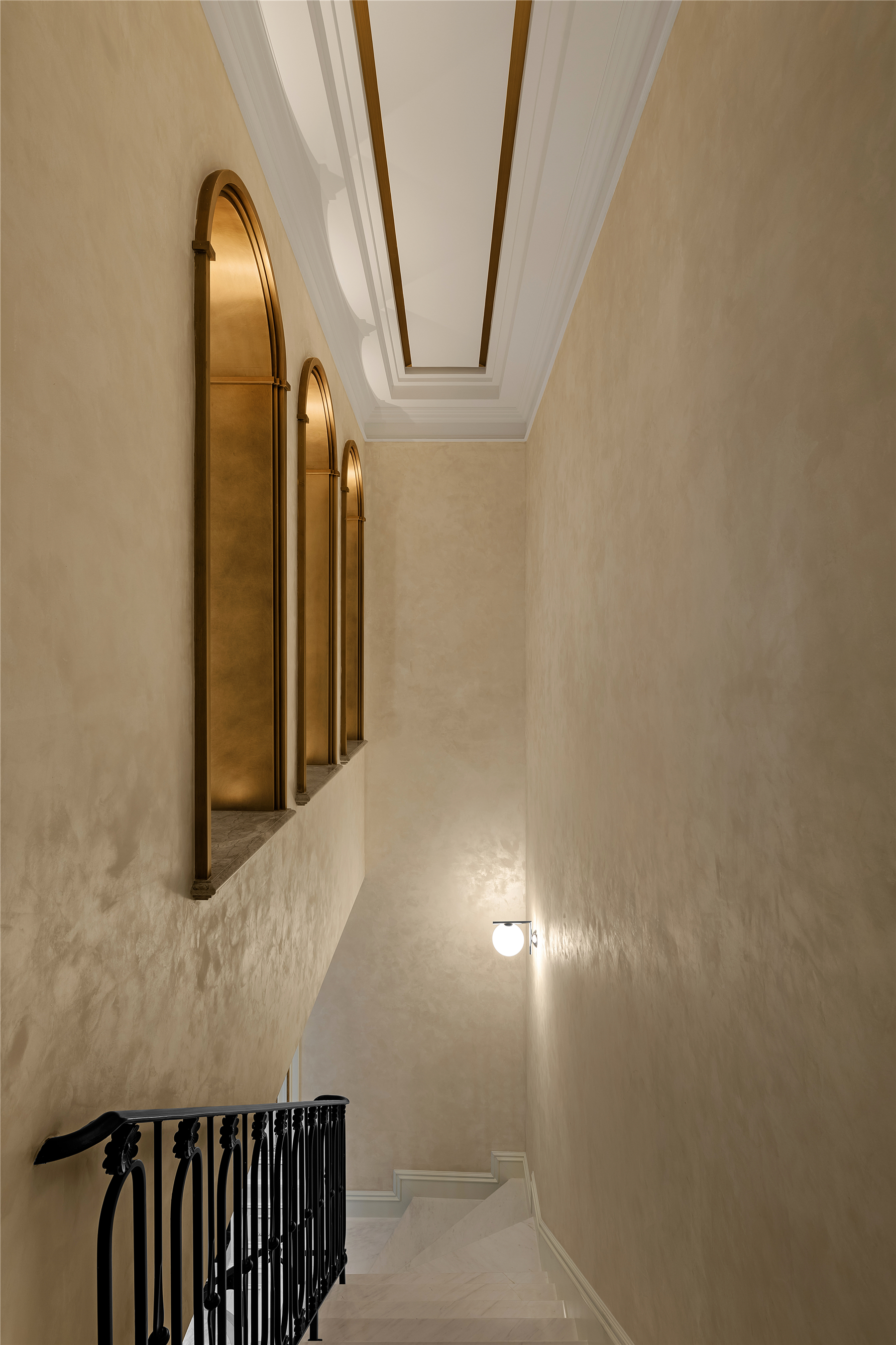 别墅在空间布排上层次分明,遵循尺度与比例上的均衡,游刃有余。客厅的拱形元素成为连贯空间的媒介,在虚与实的辗转流连中,一层的起居室、餐厨空间被艺术地连缀起来。游走于空间之间,触目所及的不仅是繁复的角线抑或是利落的线条,更打开了一个由艺术、造型、色彩所构筑的美的世界。