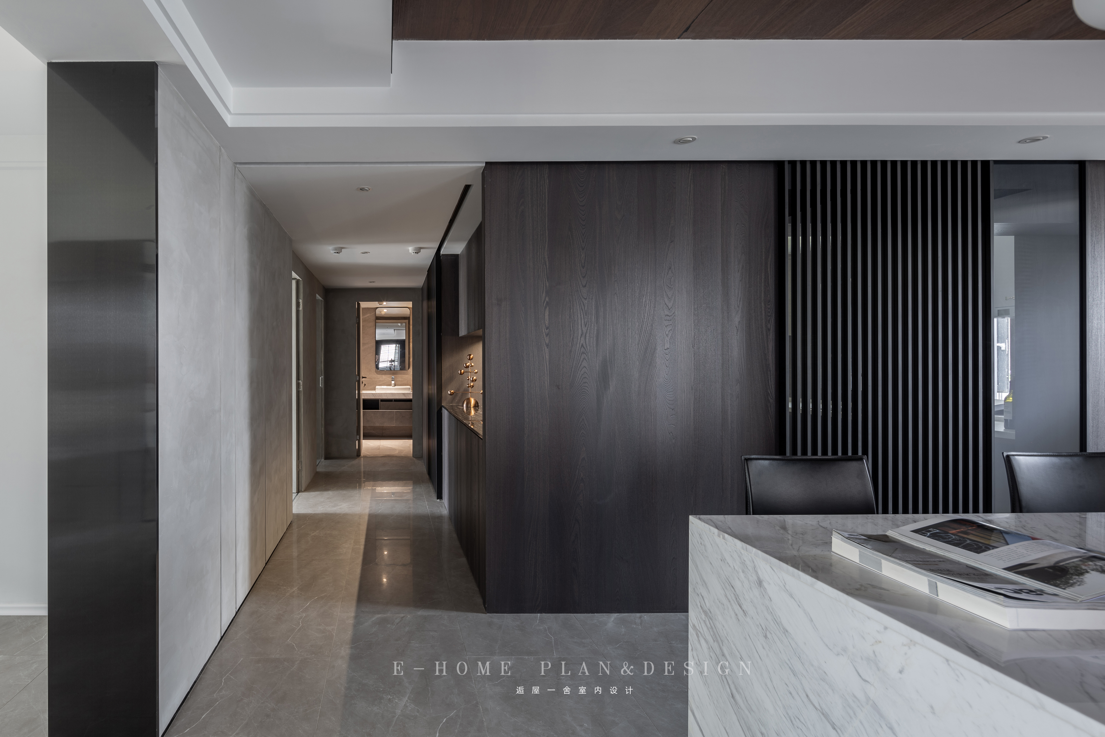 厨房外墙的榆木涂装板把走道柜体与墙面完美融合,简单时尚感仍在,德国Raumplus竖栅移门则添了一份神秘。 -