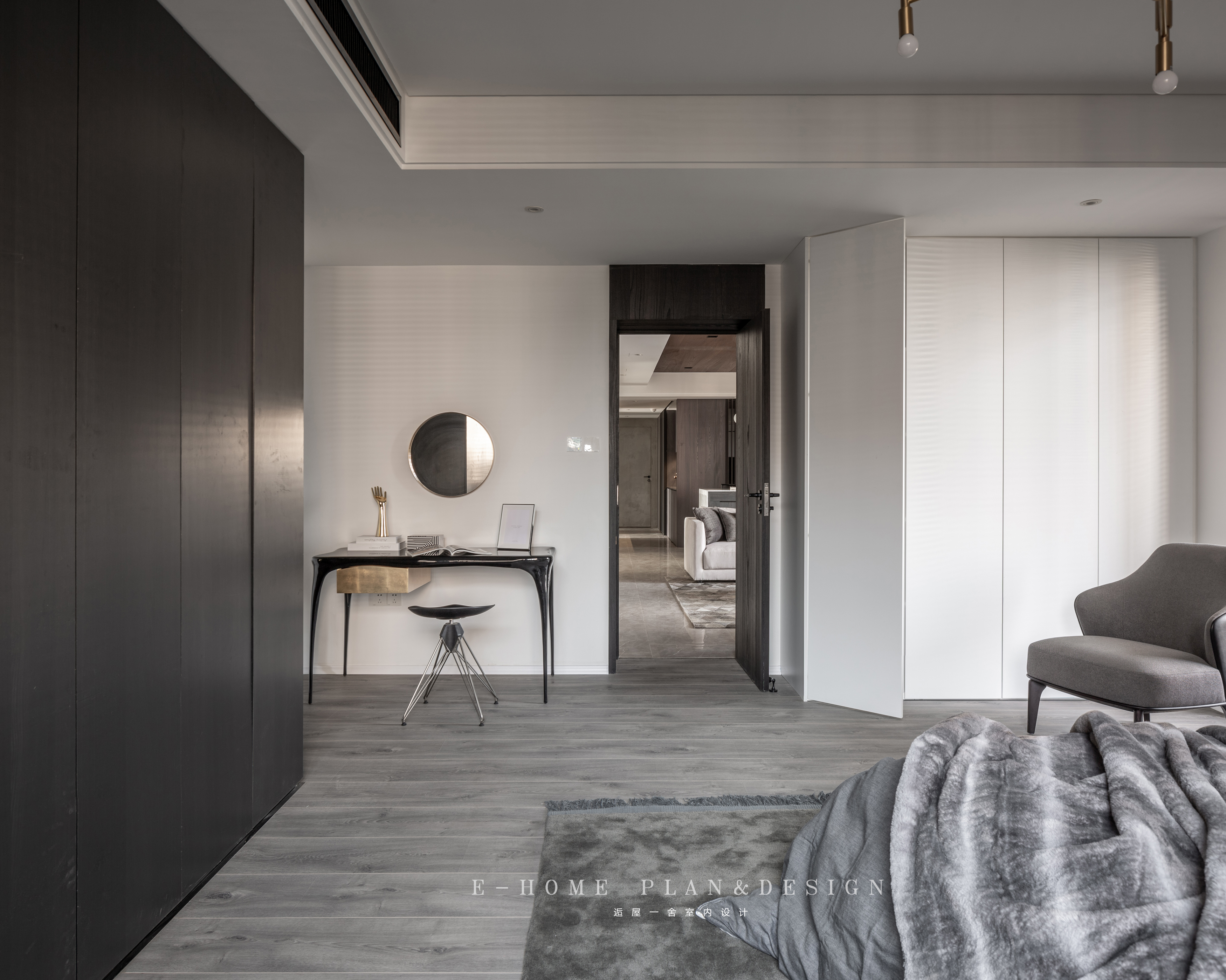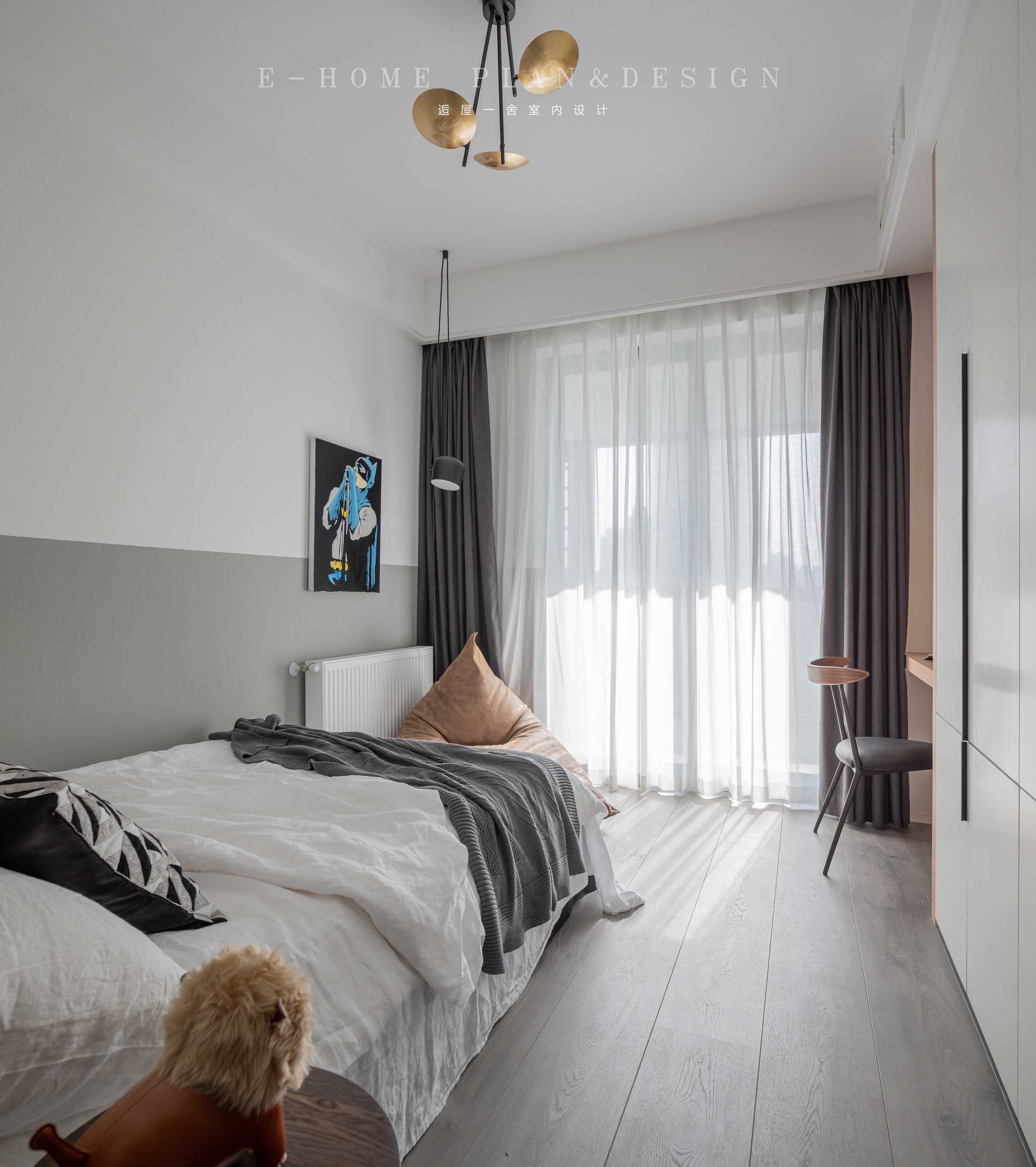 深沉的冰川灰色调浸透了整个空间,营造出绅士浪漫的感觉,床品和角落里GOLD DIGGING装饰画则使这一感觉升级。