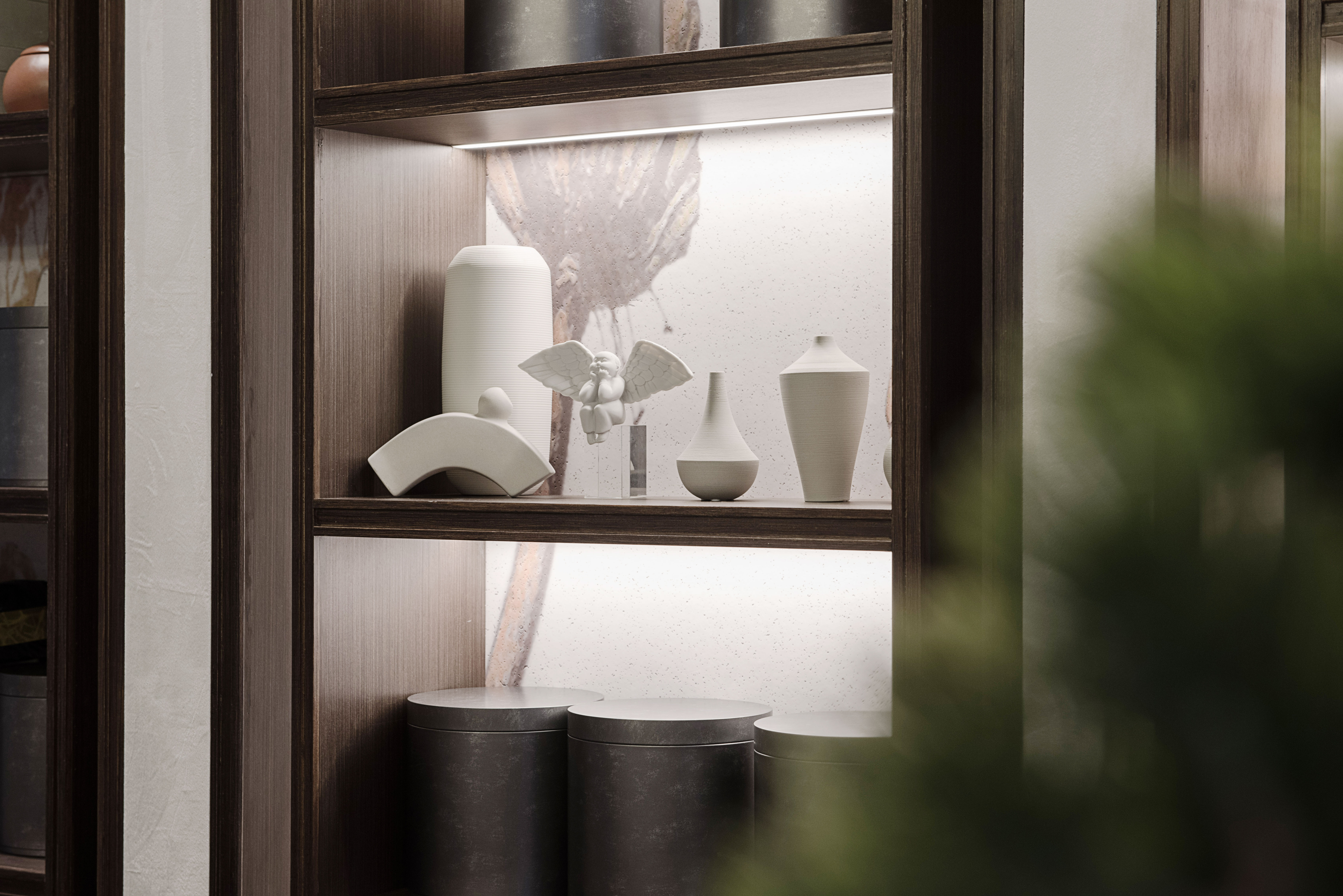 图14展示区:展示柜内放置了富有传统工艺的陶罐、惟妙惟肖的工艺品、赏心悦目的花艺,用优雅点缀空间。
