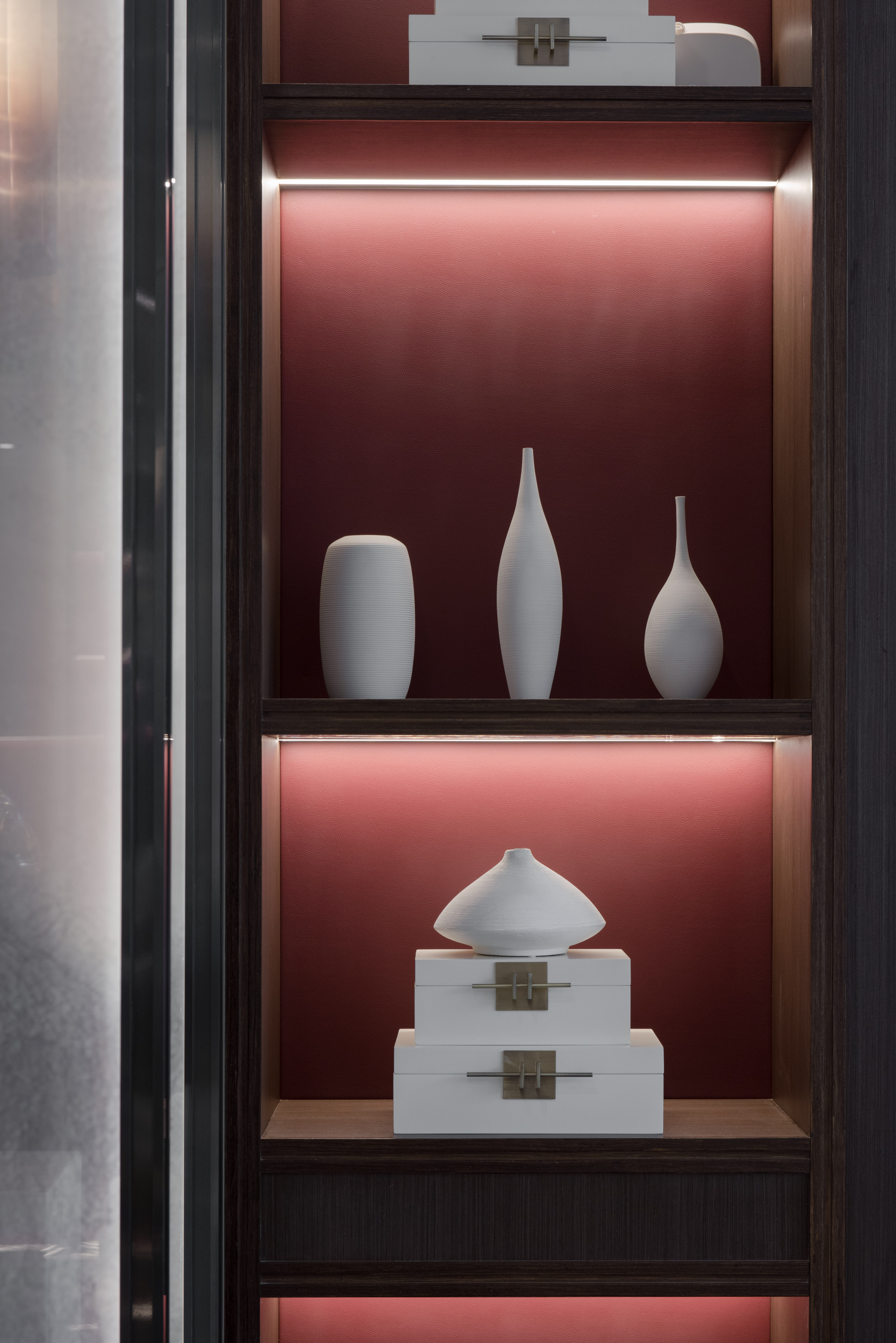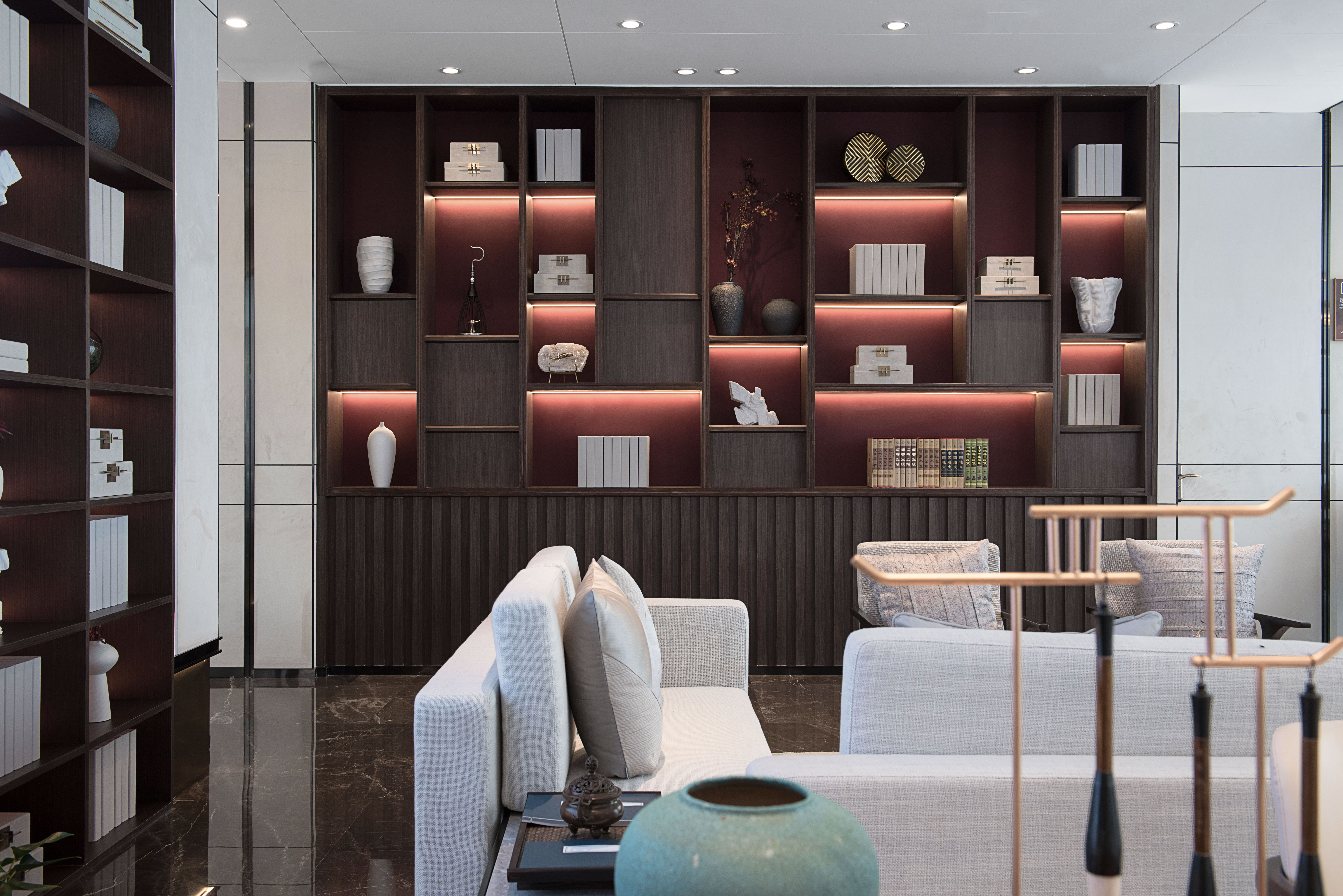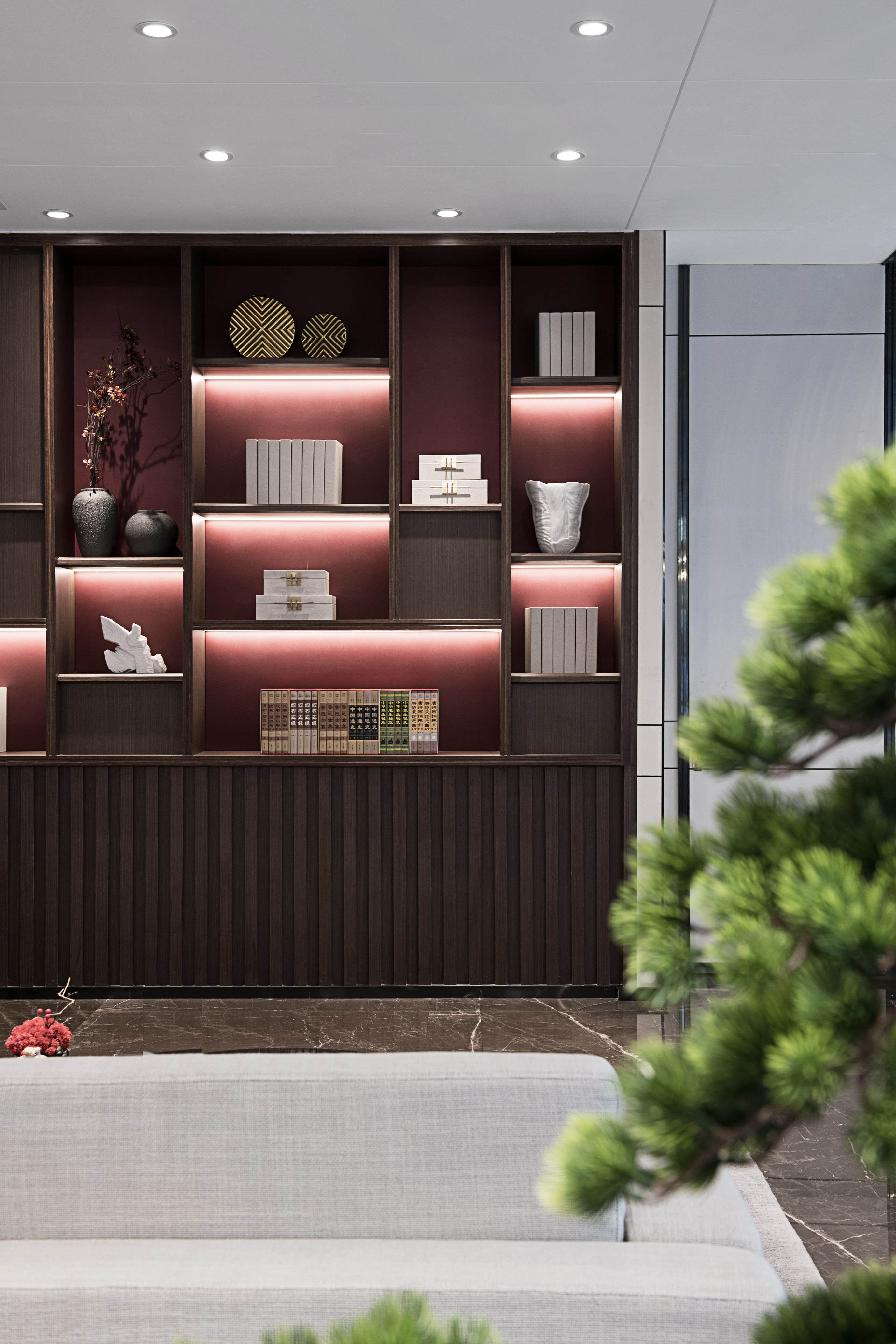 图20VIP接待室:柜子里的饰品有节奏的给人营造了非凡的视觉体验,将空间的清肃高雅的气韵瞬间展开,增添想象与趣味的艺术语言