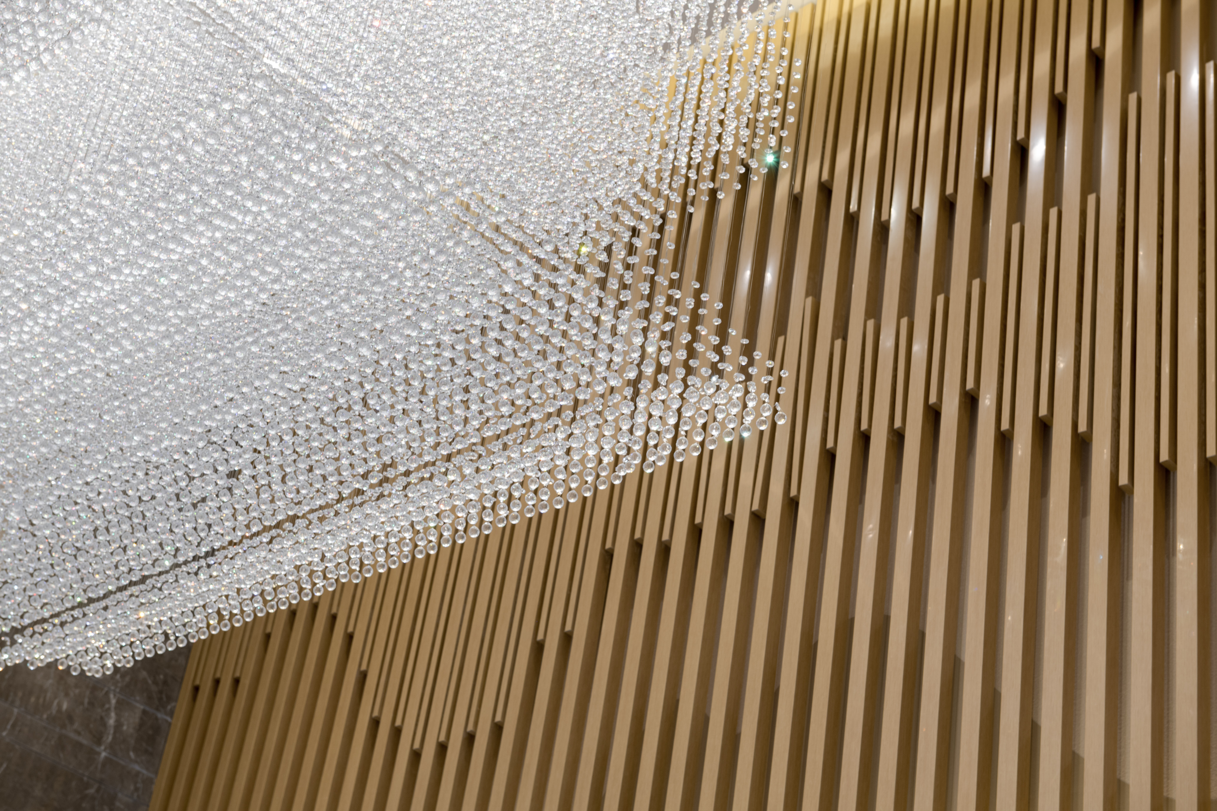 图3沙盘区:灯饰由近千颗水晶珠制成。一颗颗水晶有秩序的走势与山型的木格栅相呼应,点缀了整个沙盘区域。