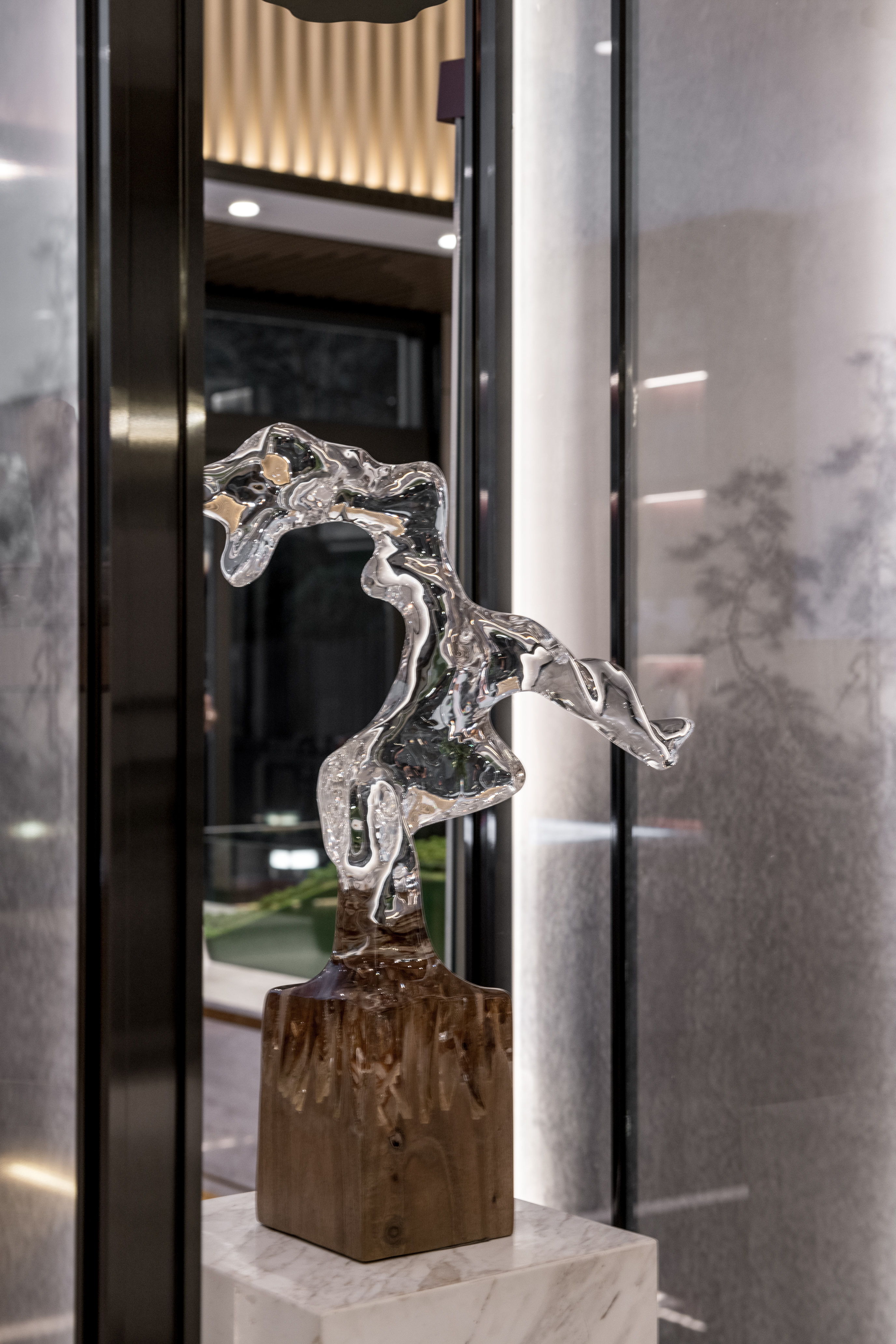 图1入口处:诗句 “一城山色半城湖”正是形容的古城济南。入口前厅的软装将湖面的水纹波光粼粼,偶尔的一粒石块便能激起千层波浪将雨滴水碰撞湖面上的的瞬间用雕塑的形式固定下來,一动一静,对比出暂时性永久,物质性的精神。