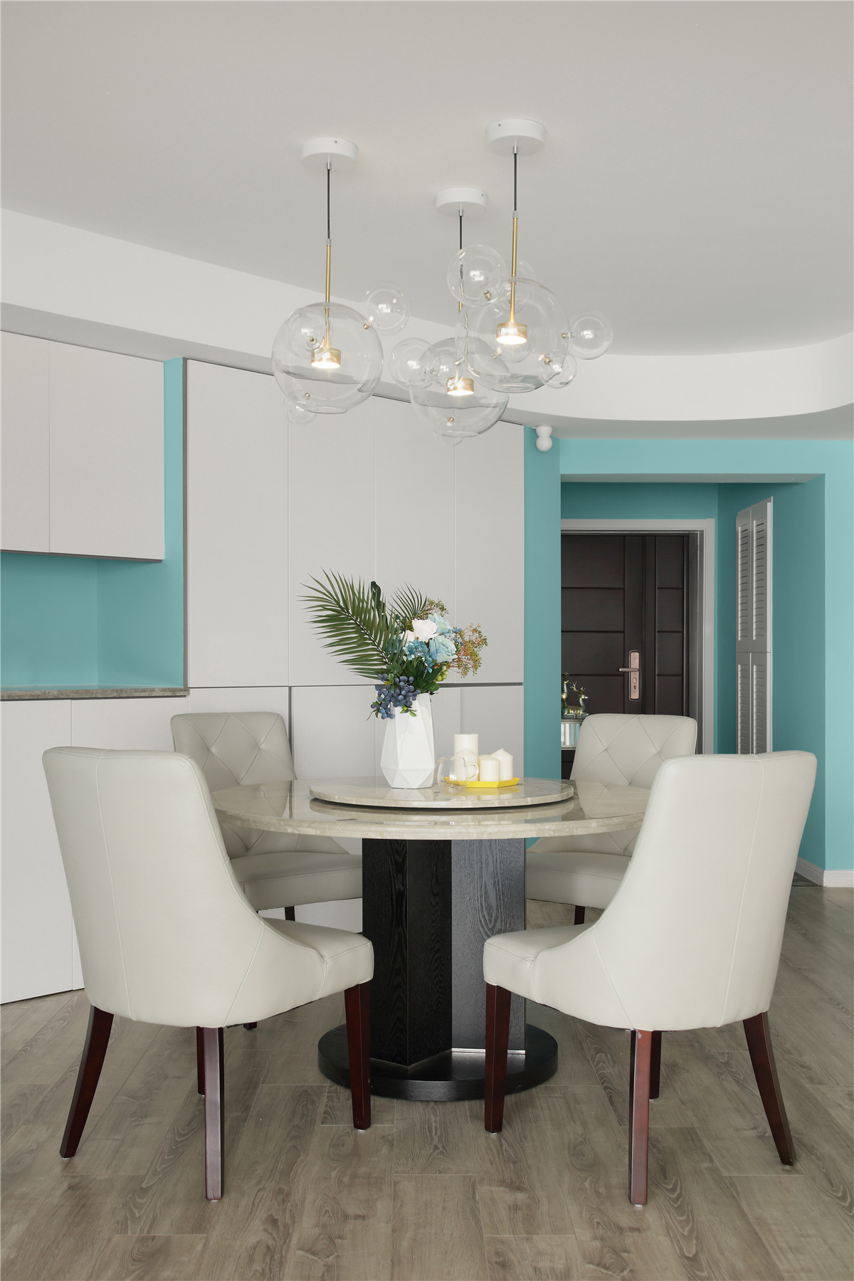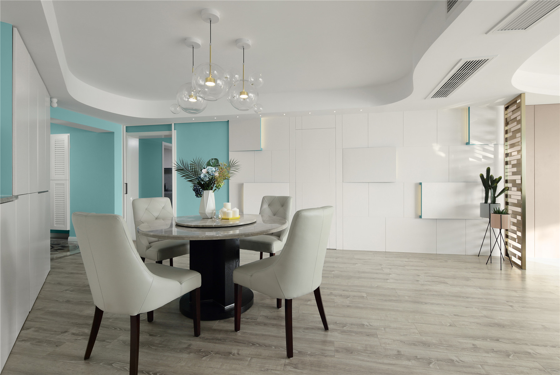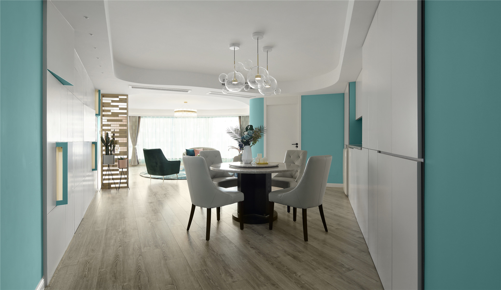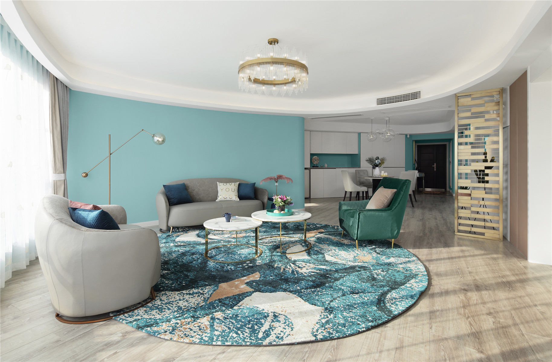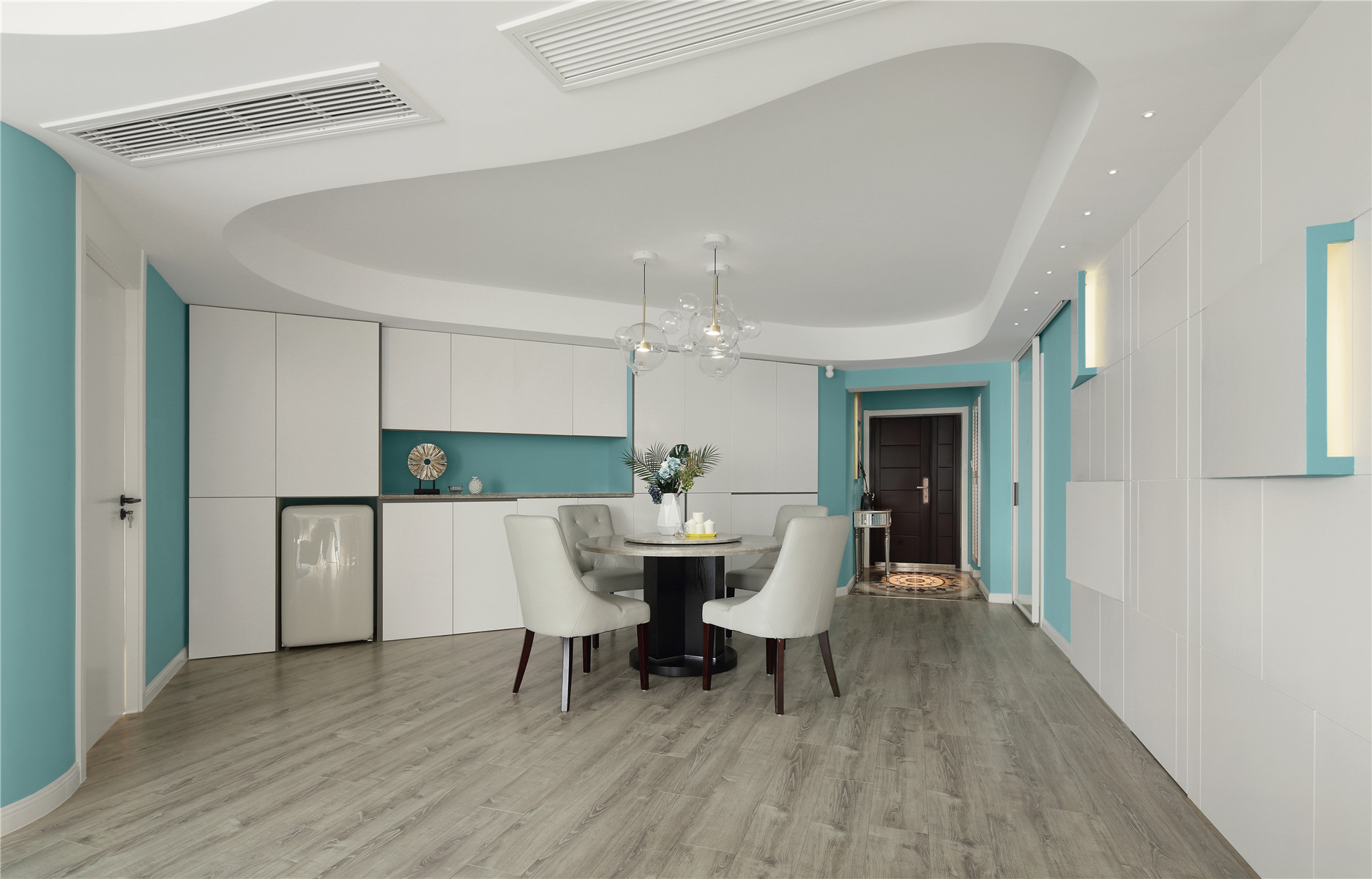 项目定位:本案位于市中心,业主是年轻白领女性,期待有个浪漫温馨的家,不足的是异形户型,要保证功能的完善以及舒适感需要重新梳理结构。我们将这个项目打造成都市白领快节奏生活之余,回到家中有一个放松心灵,愉悦心情的浪漫之家。同时用屋主最爱的蒂芙尼蓝色来打造匹配她个性标签的家。