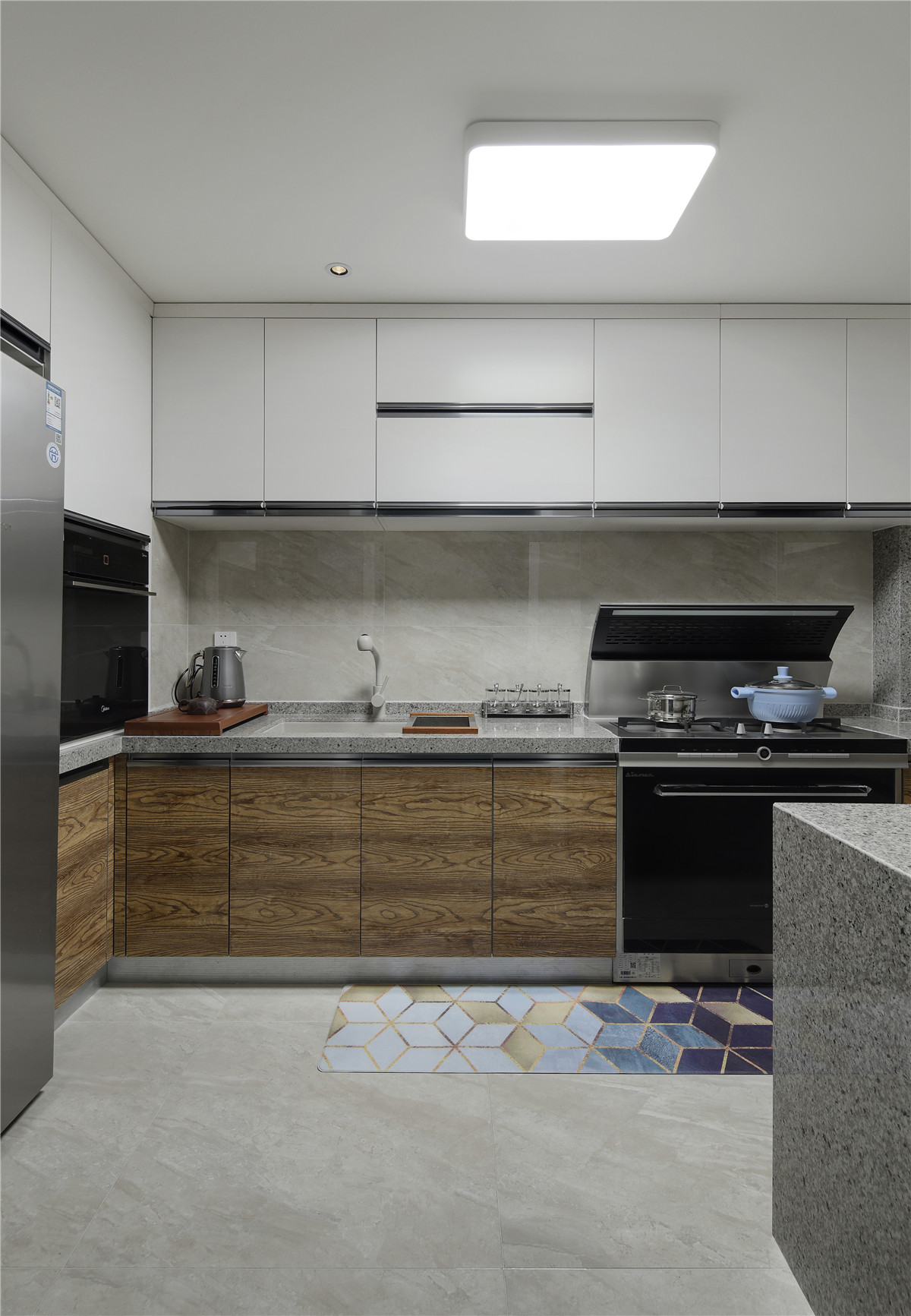 空间布局:异形空间采用“圆”作为设计的出发点,我们将次卧调整方向,改变餐厅空间尺度,从而更好地扩充客厅的空间感;以沙发为圆心,电视柜顺墙布置,将落地窗和弧形墙形成围合的空间;在次卧的对面设置一通透隔断规避进门的一眼望穿,划分区域;将厨房和邻近的小房间打通,符合业主长期居住国外使用宽敞开放厨房的生活习惯,考虑到国内生活的油烟问题,用一扇超窄边框移门让空间可分可合,美观兼顾实用;麻雀虽小五脏俱全,以功能为前提,将主卫、次卫以及主卧重新调整尺度和比例,将朝南的主卧分隔出阳台用来晒衣服,并改变主卫的动线增加衣帽间,并对主卫